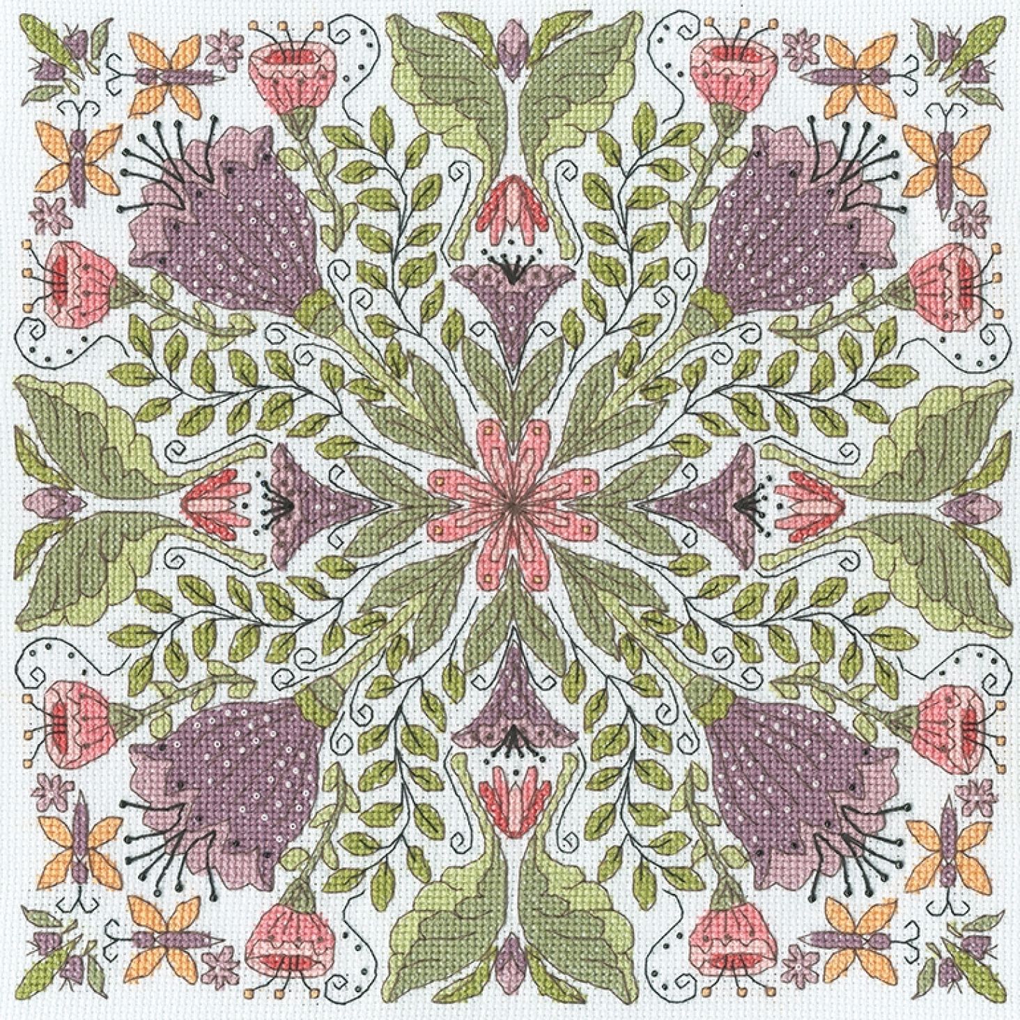 This counted cross stitch kit is worked on 14 count ice blue Zweigart Aida with pre-sorted stranded cottons. It uses cross stitch, back stitch and French knots.
