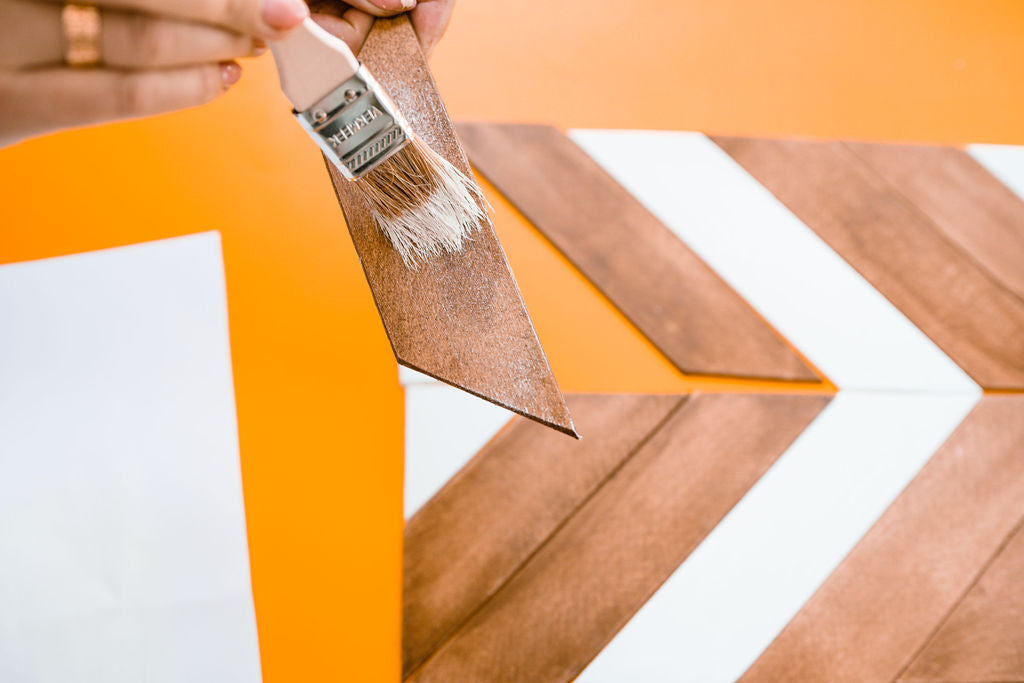 Follow our guide and create the pictured chevron pattern, or get creative and cut the wood slats in any style you prefer to make your unique pattern. Use white paint and wood stain to experiment with various color combinations and styles until you find the perfect one that matches your home decor. This kit now comes with four additional paint colors for more customization options.