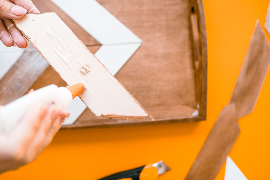 Add a touch of elegance to your home decor with our chevron pattern wood tray kit! Complete with an 11x14 inch tray, wood slats, wood stain, five colors of paint, glue, brushes, and a craft knife, this kit has everything you need to create a stunning piece for your home.