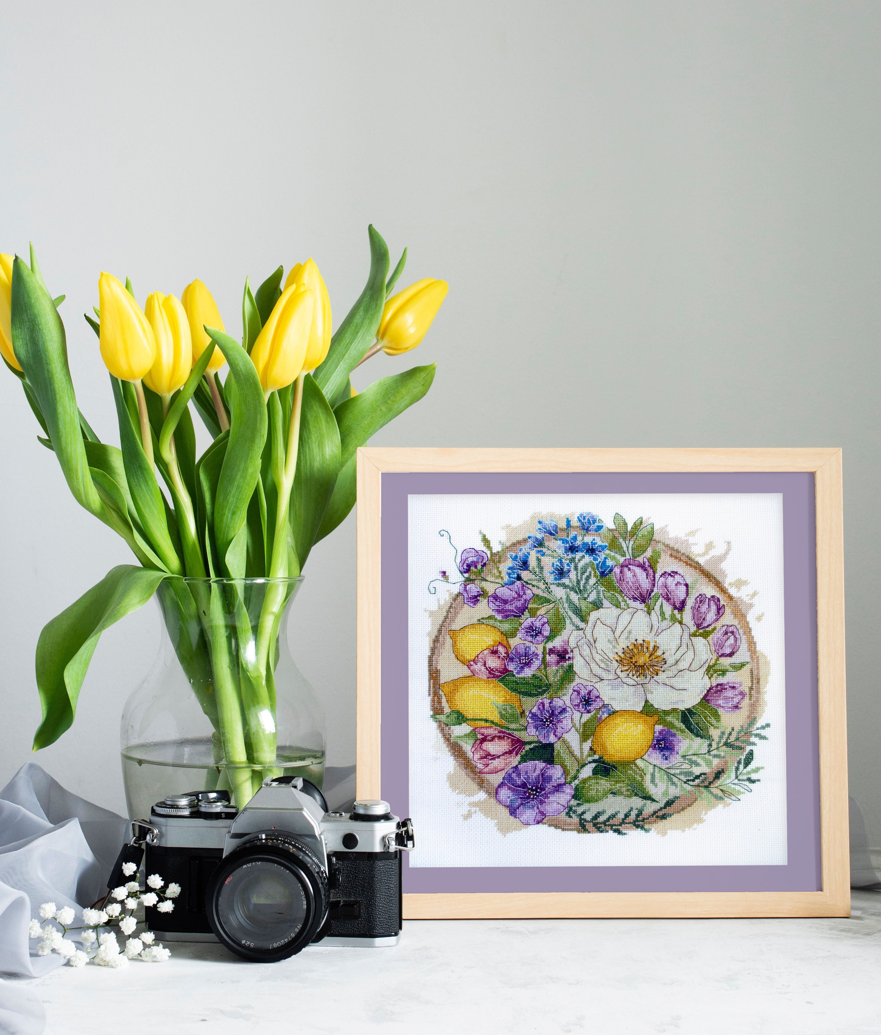 In each carefully assembled box Cross-stitch kits A floral moment (Deco Scenes) after purchase and delivery you will find: a large piece of canvas (embroidery fabric) larger than the size of the picture - 220 x 220 mm. - with enough margin to comfortably embroider and decorate the finished picture! As well as a special needle for cross-stitching and all the necessary threads (floss) - 56 colors on a convenient organizer, of course - with a margin, because you can embroider with a cross in different ways. And most importantly - detailed instructions, a cross-stitch pattern, specially designed by our designers for each set separately!