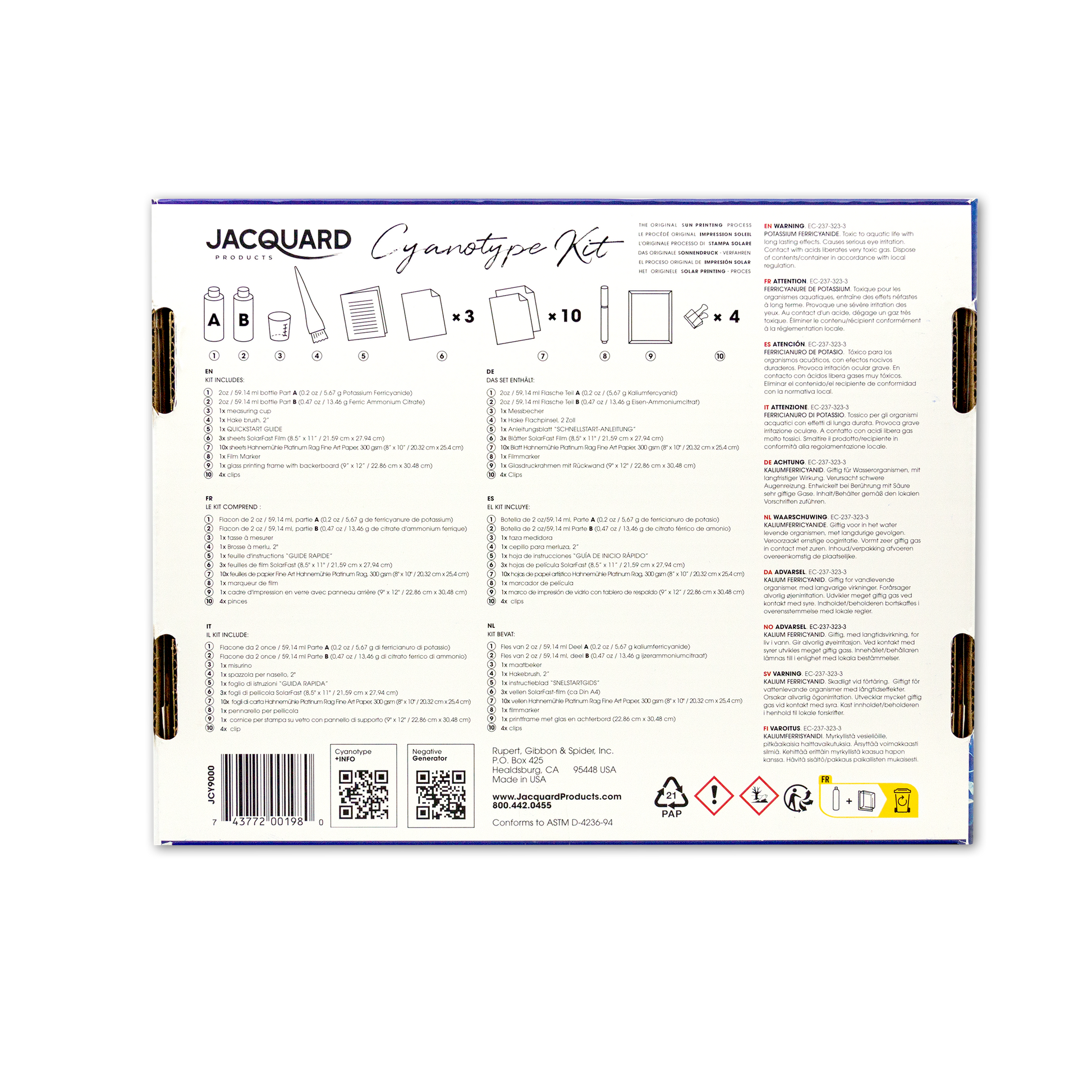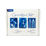 Jacquard’s Cyanotype Kit makes sun printing easier than ever and includes everything you need to get started. The chemistry comes premeasured in lightproof black bottles. Simply fill each bottle with water to create Stock Solutions A & B, and then mix the two in equal parts to create the cyanotype sensitizer. Coat the included Hahnemühle Platinum Rag Fine Art Paper with the sensitizer and, once dry, create prints by exposing to sunlight or UV (10-20 minutes, depending on conditions), using the included glass printing frame and objects or a film negative to create an image. After exposure, prints are processed in a tray of cool water and allowed to air dry. The kit comes with enough material to make at least 12 (8.5x11in/ 21.59 x 27.94cm) prints. Multi-lingual packaging is compliant in 15+ countries.