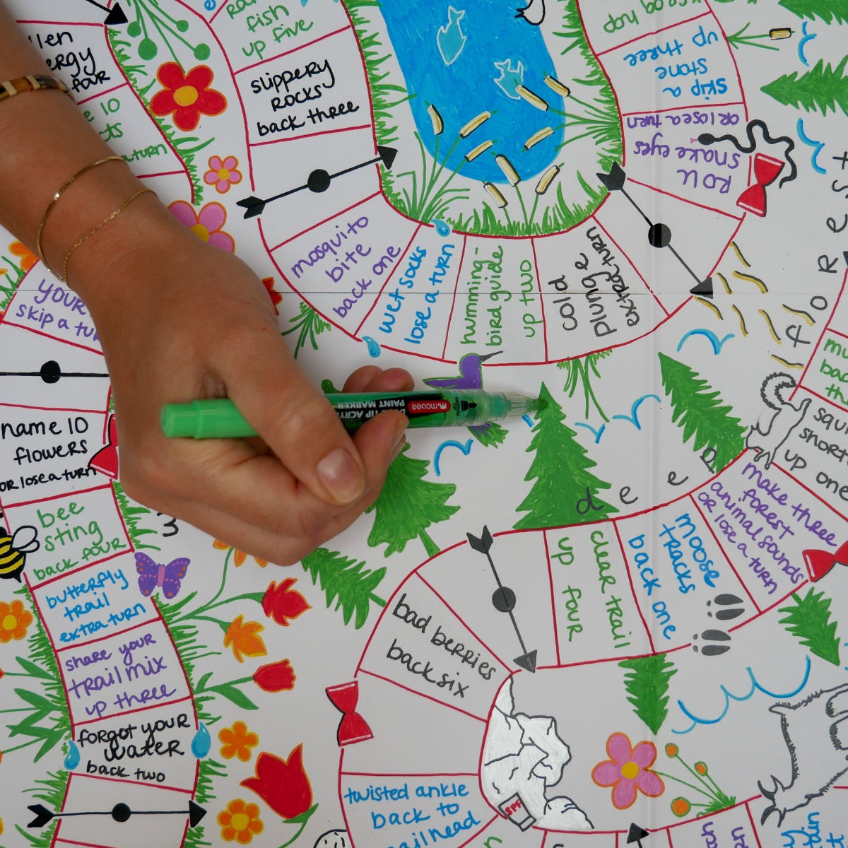 This kit comes with a blank board game, dice, spinner, timer, game pieces, a pencil, two sets of markers, and stencils.