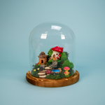 This craft kit includes a collection of miniatures, natural elements, and all the materials needed to stabilize your mini-landscape. Every glass dome has an LED light inside the wooden base. Crafters will need glass cleaner and paper towels.