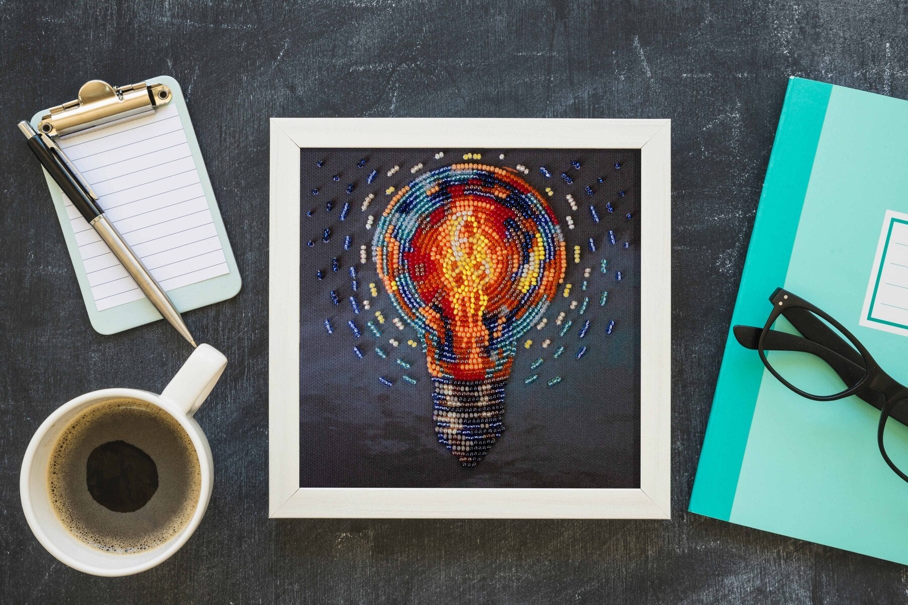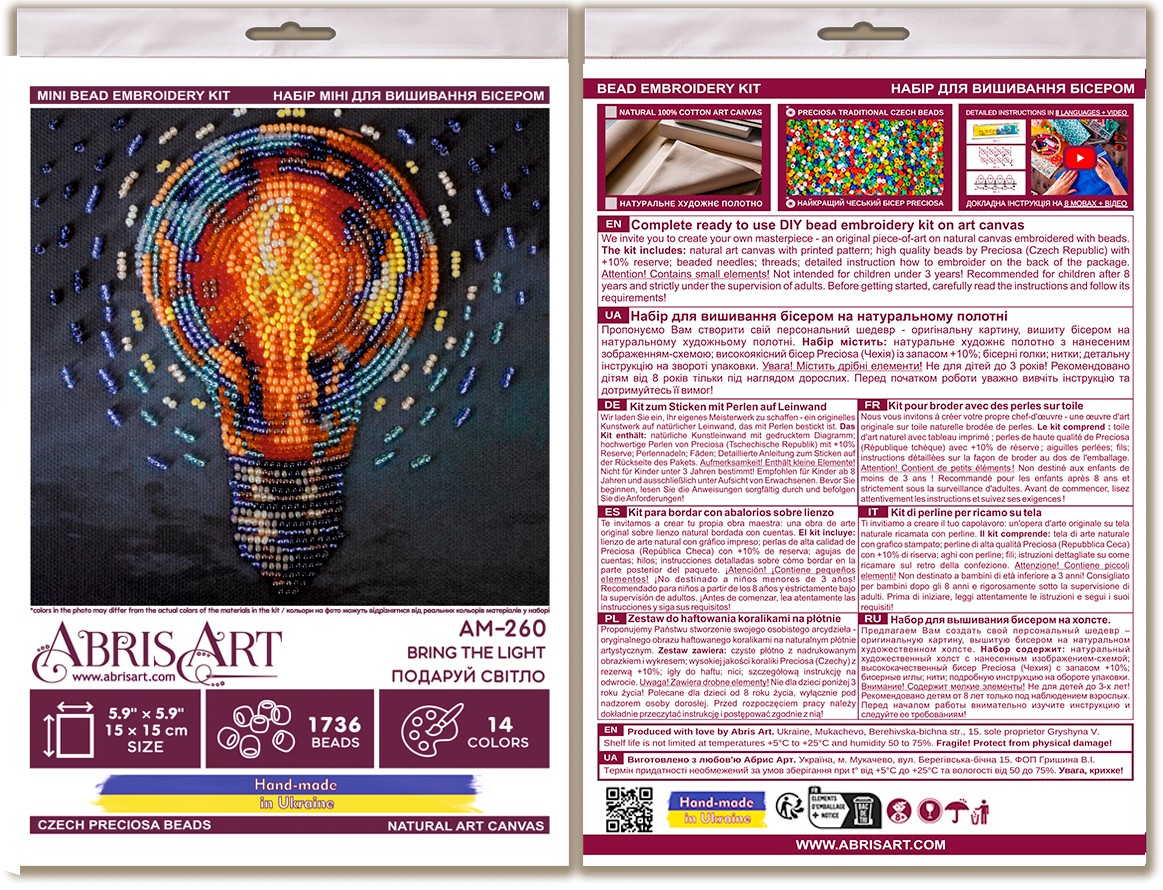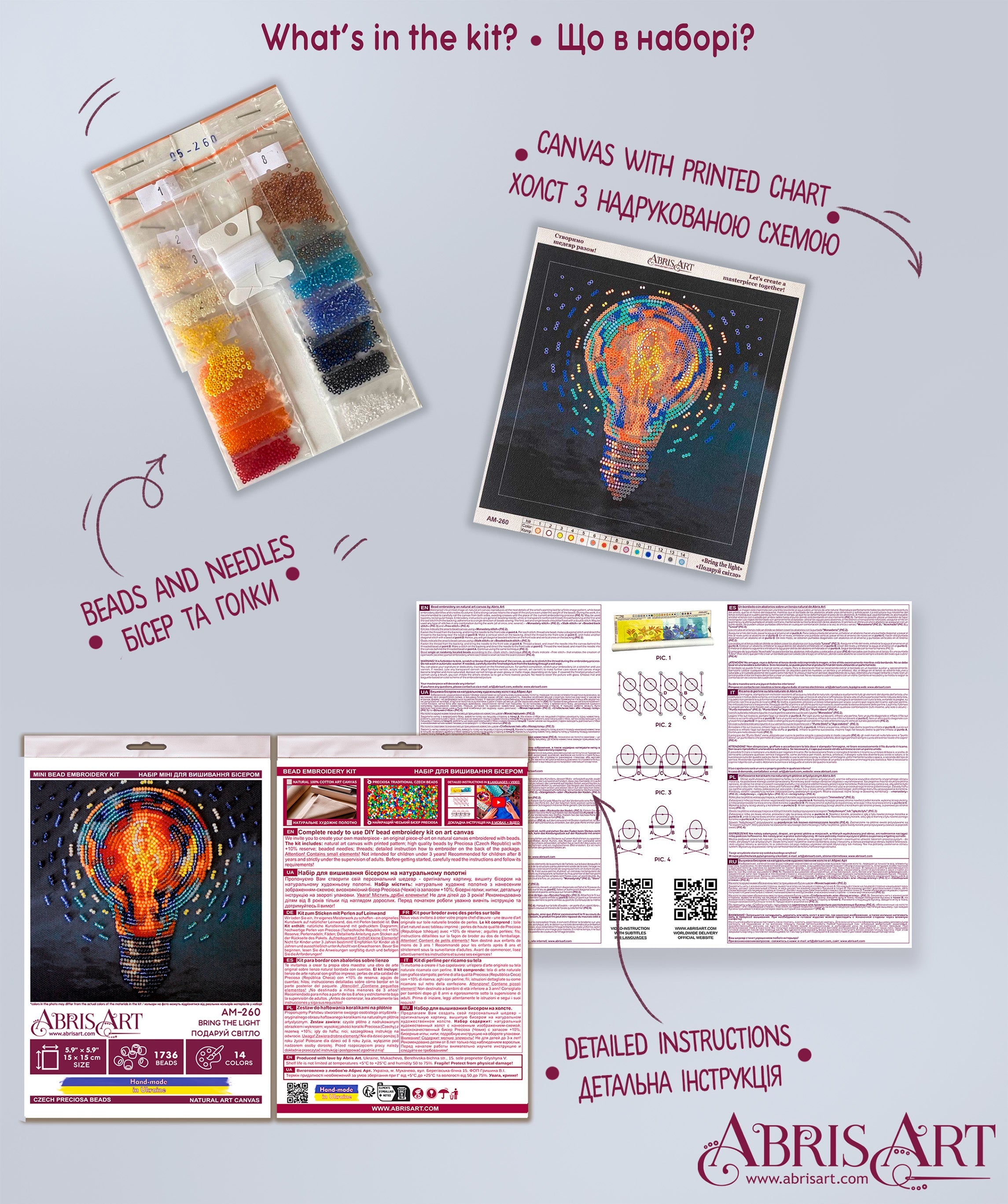 In each carefully assembled box Mini Bead embroidery kit Bring the light after purchase and delivery you will find: a large piece of natural art canvas with a printed image-scheme (fabric for embroidery) larger than the size of the picture - 150 x 150 mm. - with enough stock to make it convenient to embroider and design the finished picture! The world's best beads Preciosa Ornela (Czech Republic), with "stock" - more than 1736 beads, high-quality bead needles from Japan , and most importantly - detailed instructions, the scheme for beadwork with a key, specially developed by our designers for each plot separately and already applied to the canvas!