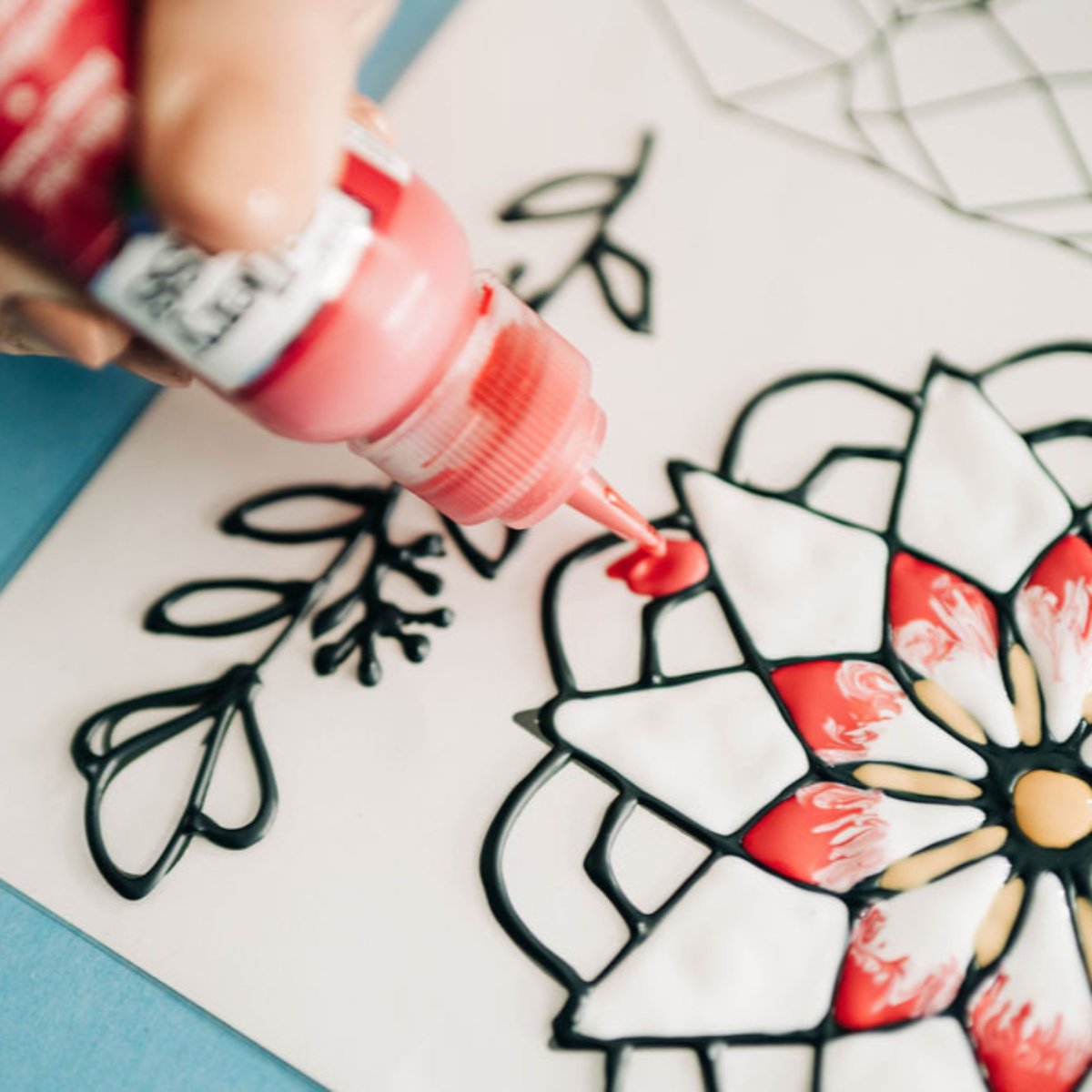 This craft kit includes five Gallery Glass colors, black leading lines, and all the materials needed to bring your art to life. The kit provides a glass and a carafe, but the fun doesn’t stop there. Any smooth, non-porous, surface can hold your designs. Crafters will need paper towels.