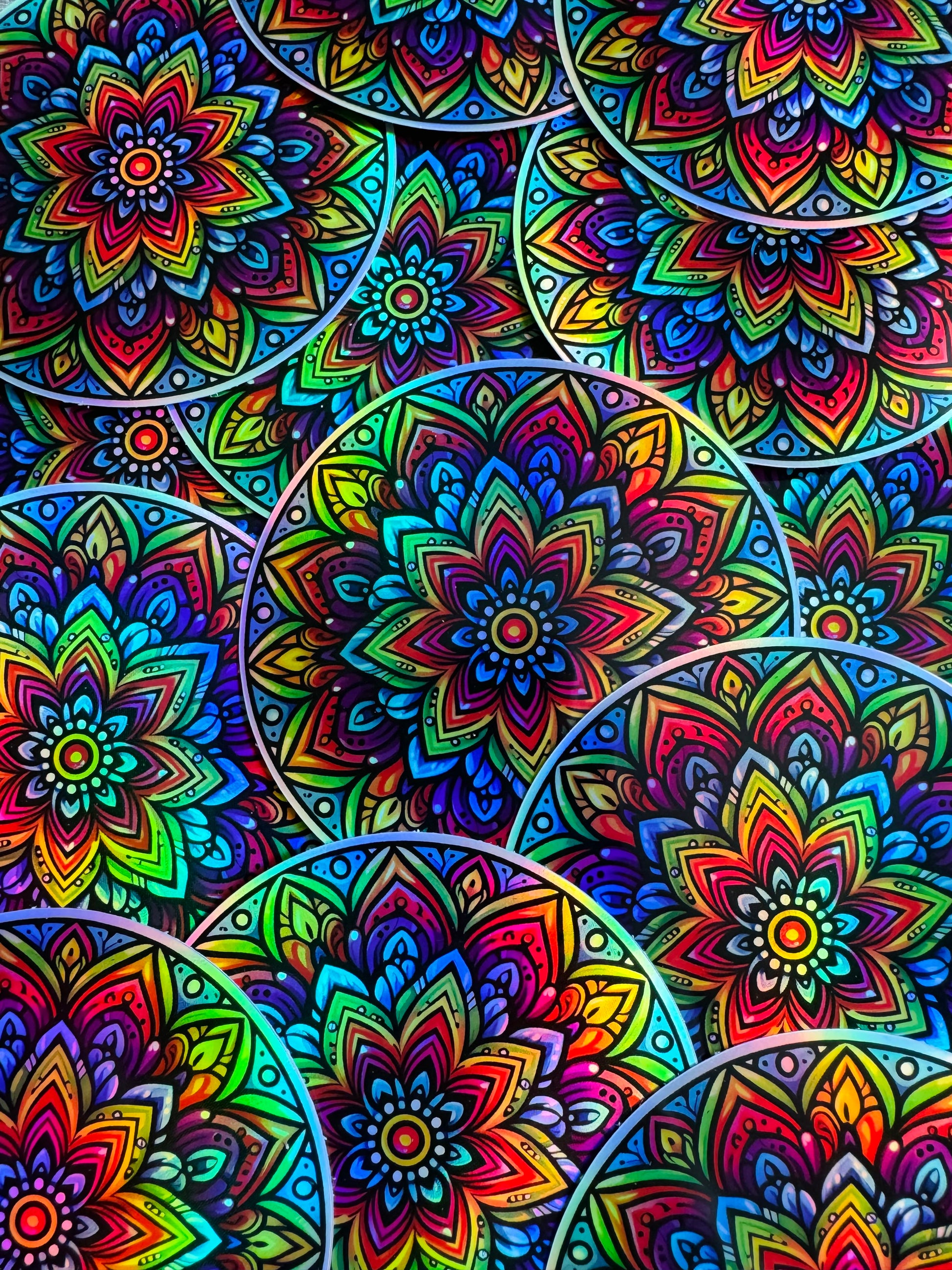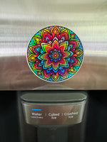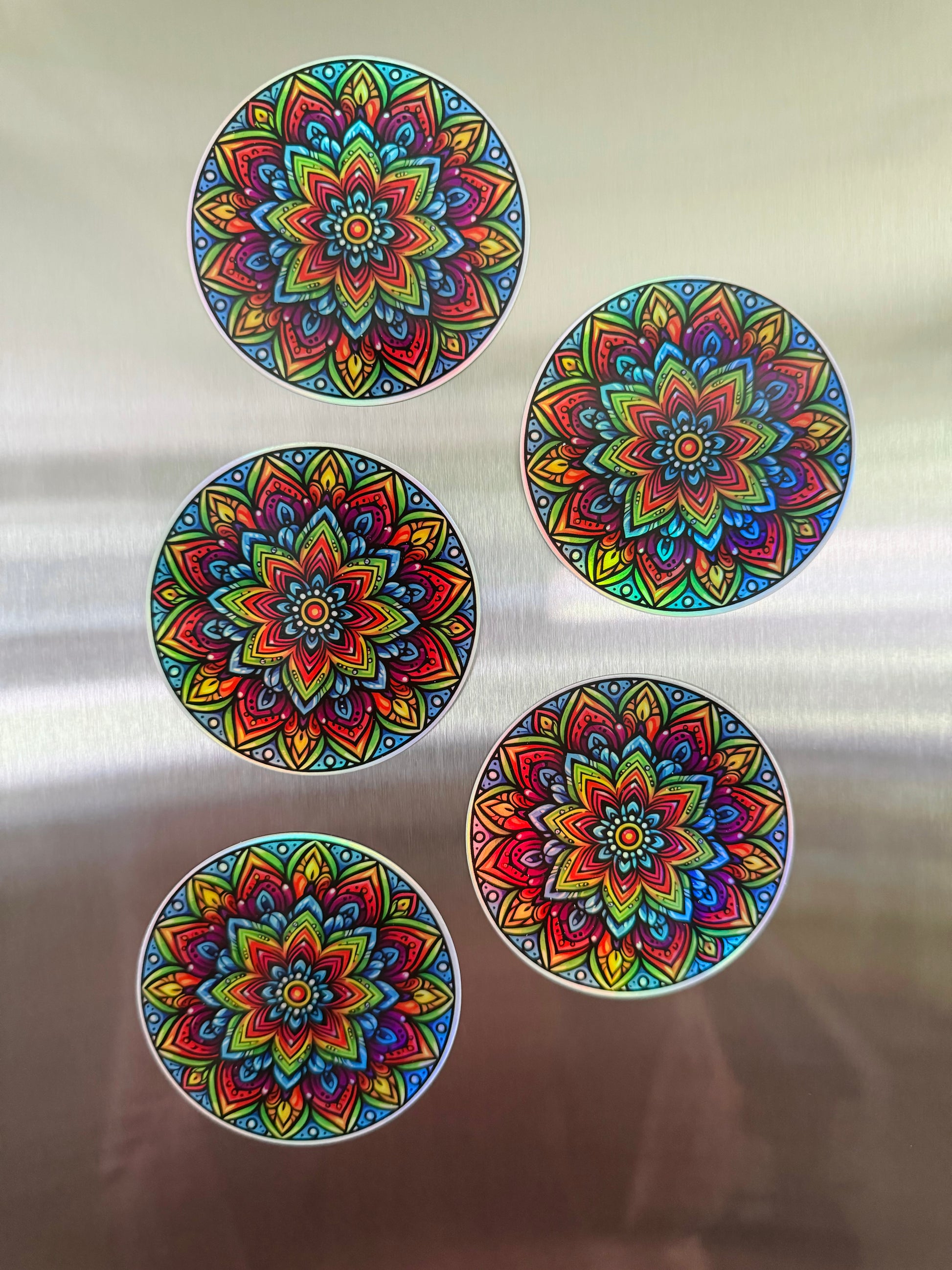 These colorful fridge art magnets feature a colorful rainbow floral-inspired mandala on holographic vinyl that flashes a rainbow of colors in the light.