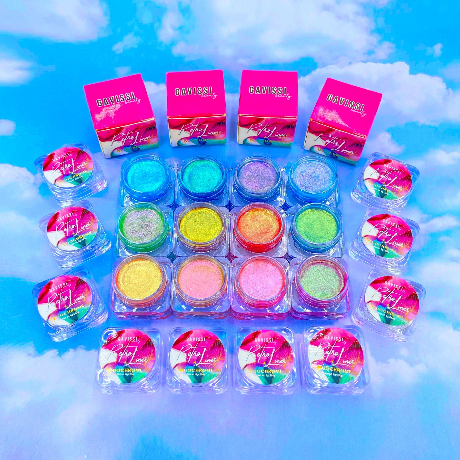 *PLEASE NOTE THIS PRODUCT IS MEASURED IN GRAMS AND ALL FINISHED DUOCHROME RETRO LINERS HAVE A NET WEIGHT OF 8g/.28 oz. VOLUME APPEARANCE MAY VARY BETWEEN COLORS.*