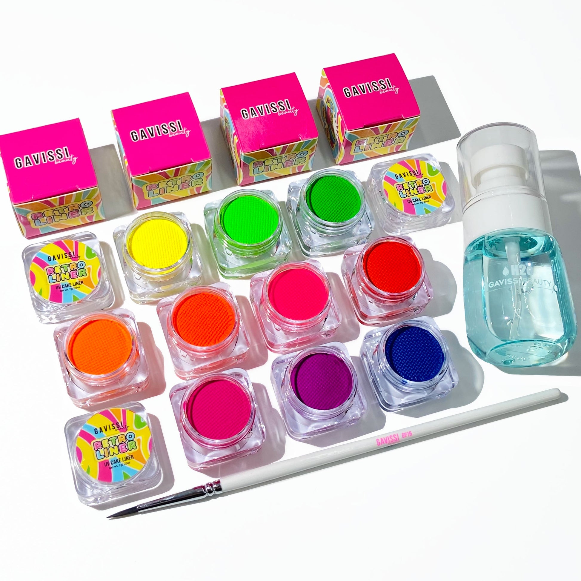 All you need to create a fun multi-color graphic liner look in just one bundle! This bundle includes 10 UV Neon Retro Liners in shades: Crop Top, Miami Beach, Spandex, Chill Pill, Hot Pants, Roller Skate, Candy Apple, Ocean Drive, Tie Dye, and Mood Ring. Bundle also includes one GV16 liner brush and one fine mist spray bottle!