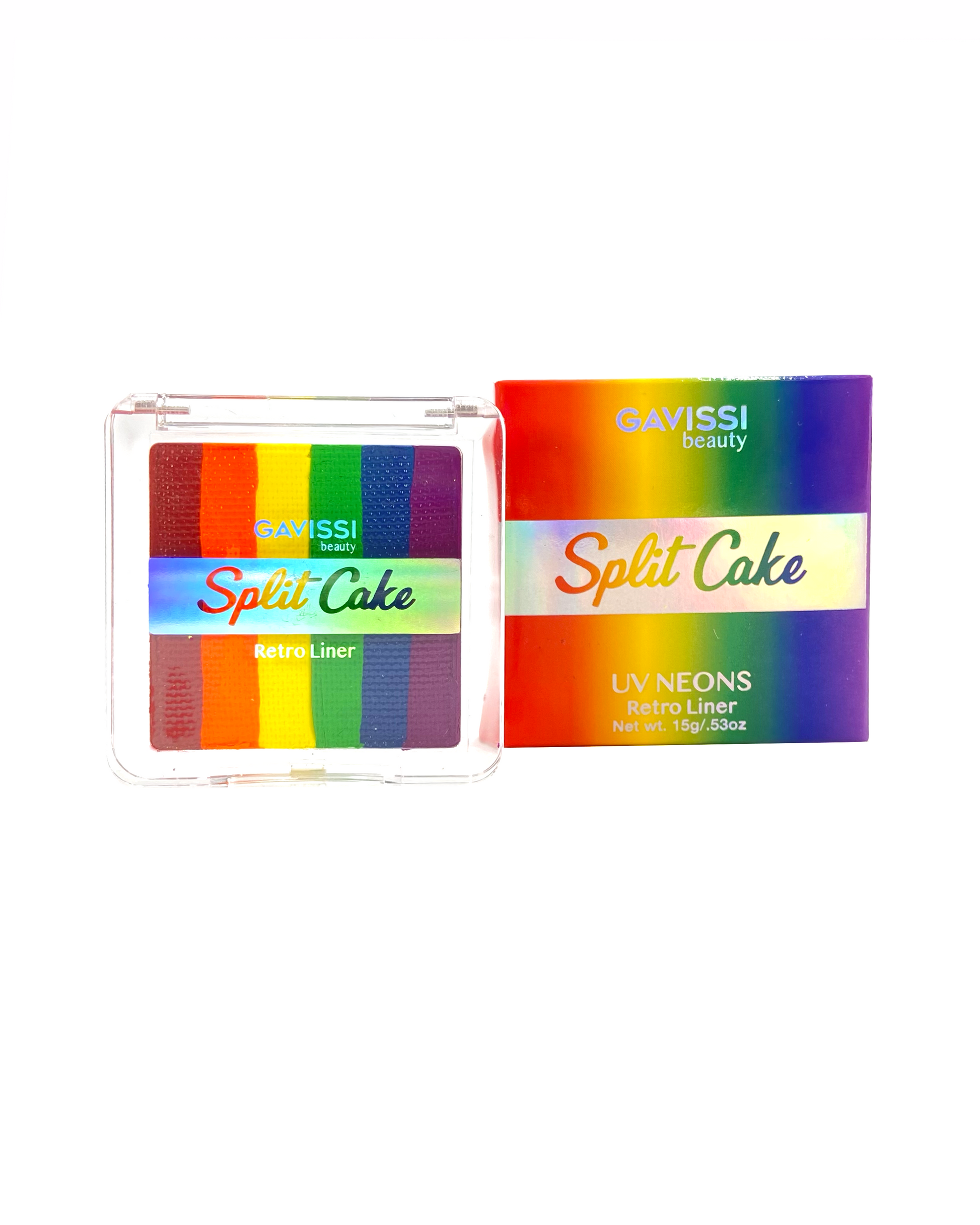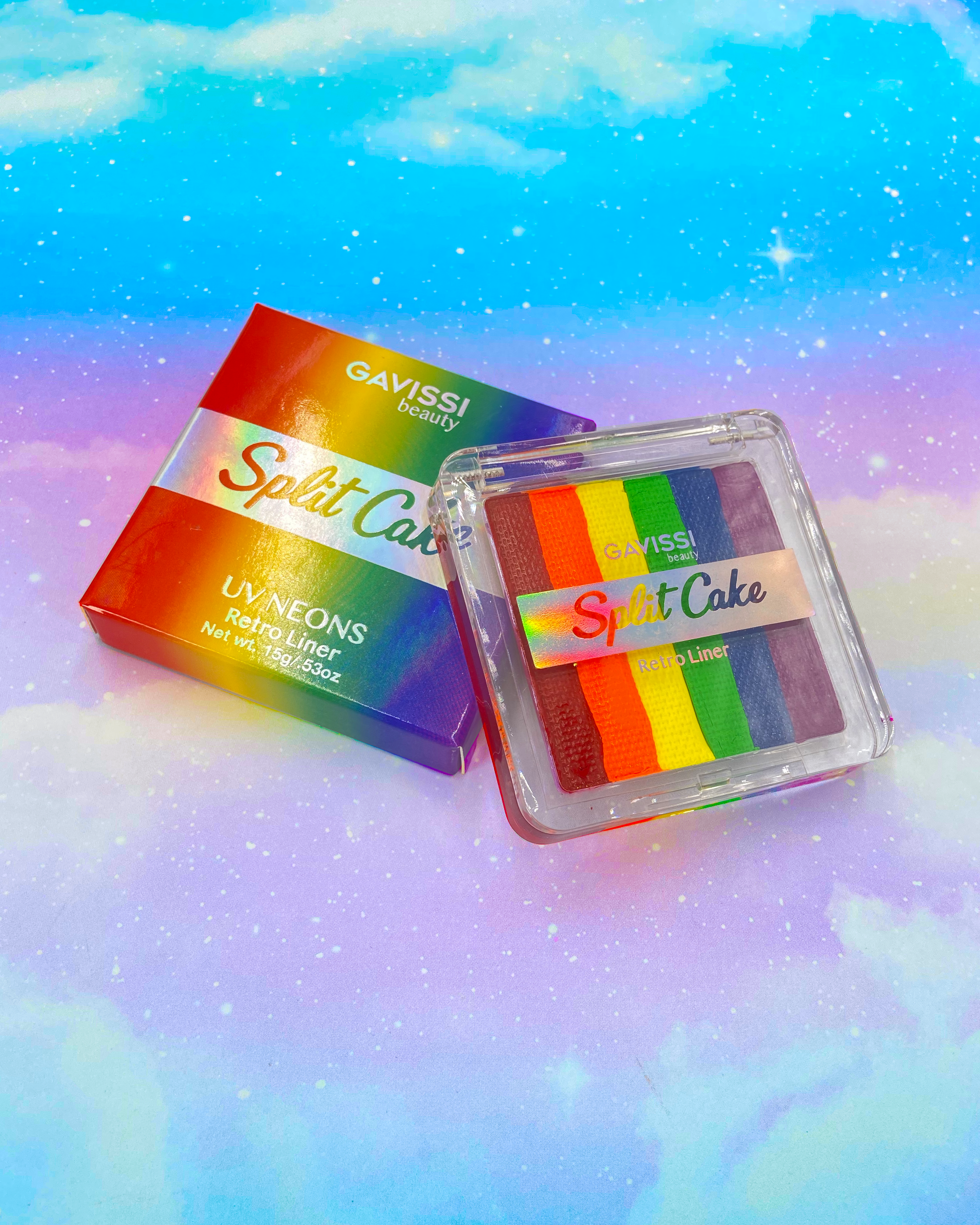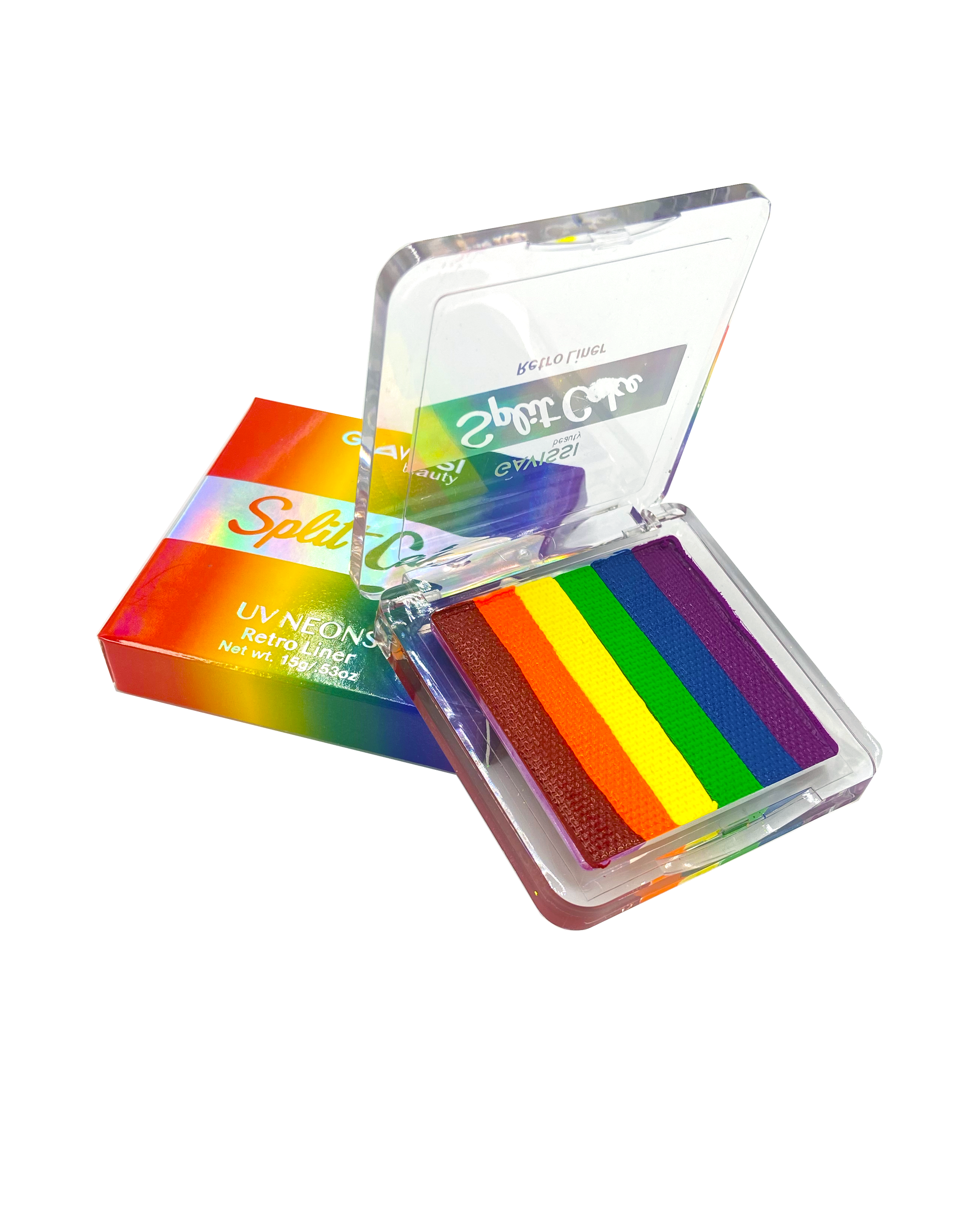 CREATE BEAUTIFUL RAINBOW GRADIENTS WITH OUR 6-COLOR SPLIT CAKE LINERS! IDEAL TO USE AS GRAPHIC LINER, FACE, AND BODY ART. ALL 6 COLORS ARE UV REACTIVE AND THEY GLOW UNDER UV LAMP/BLACKLIGHT.