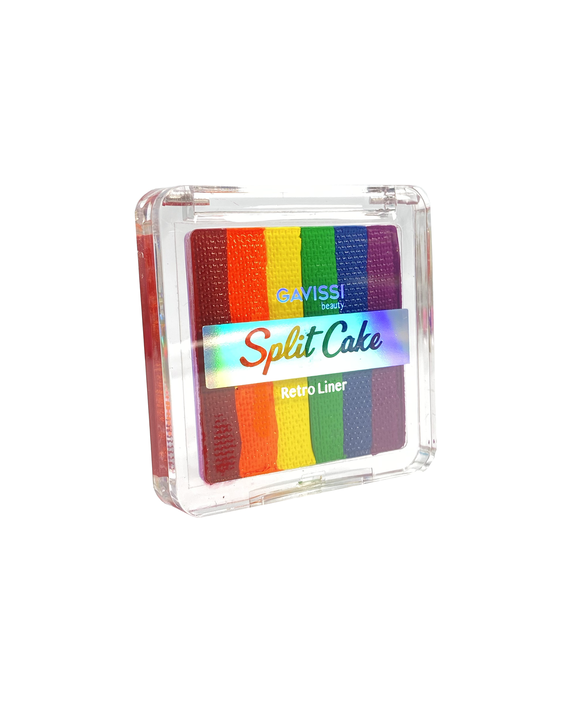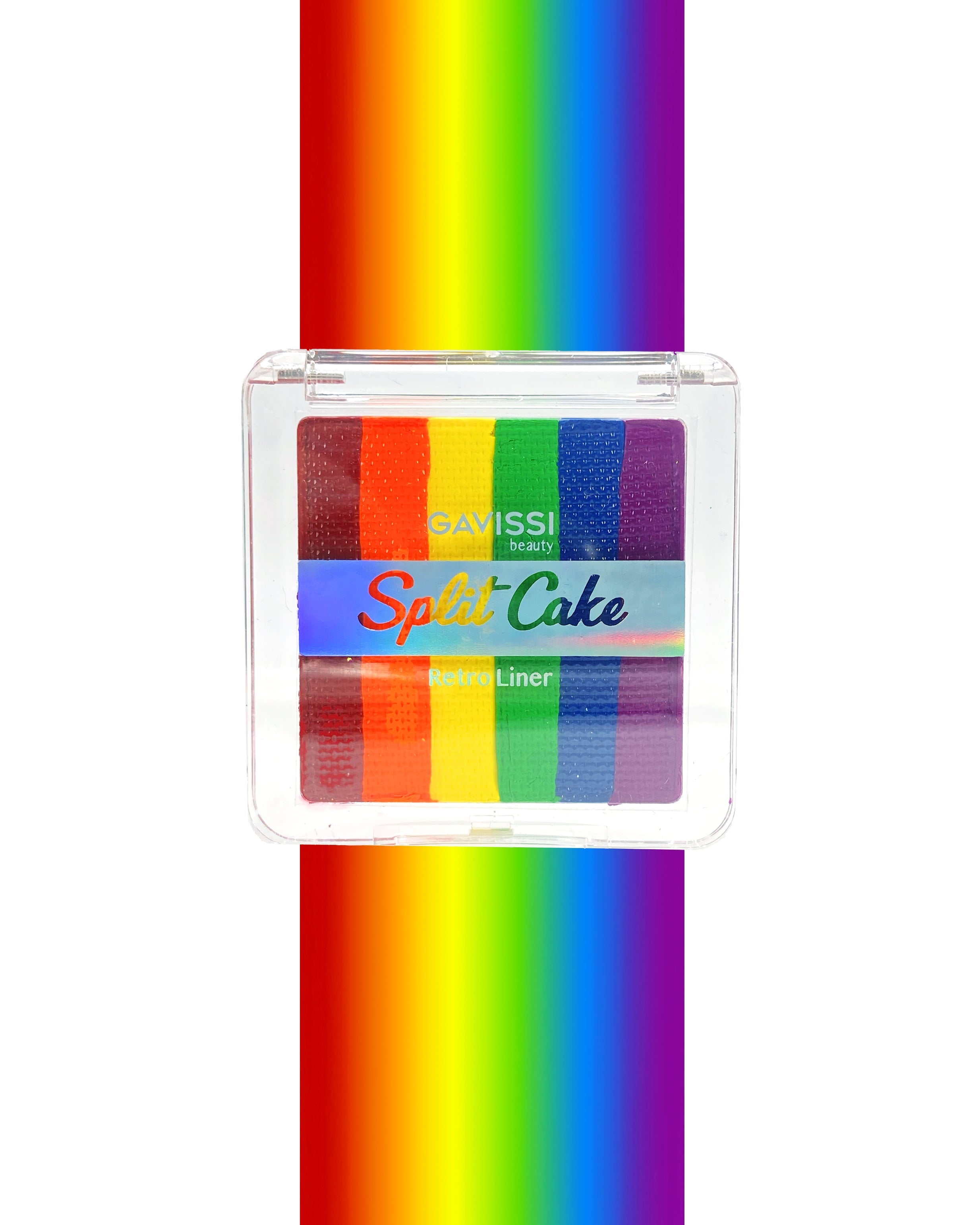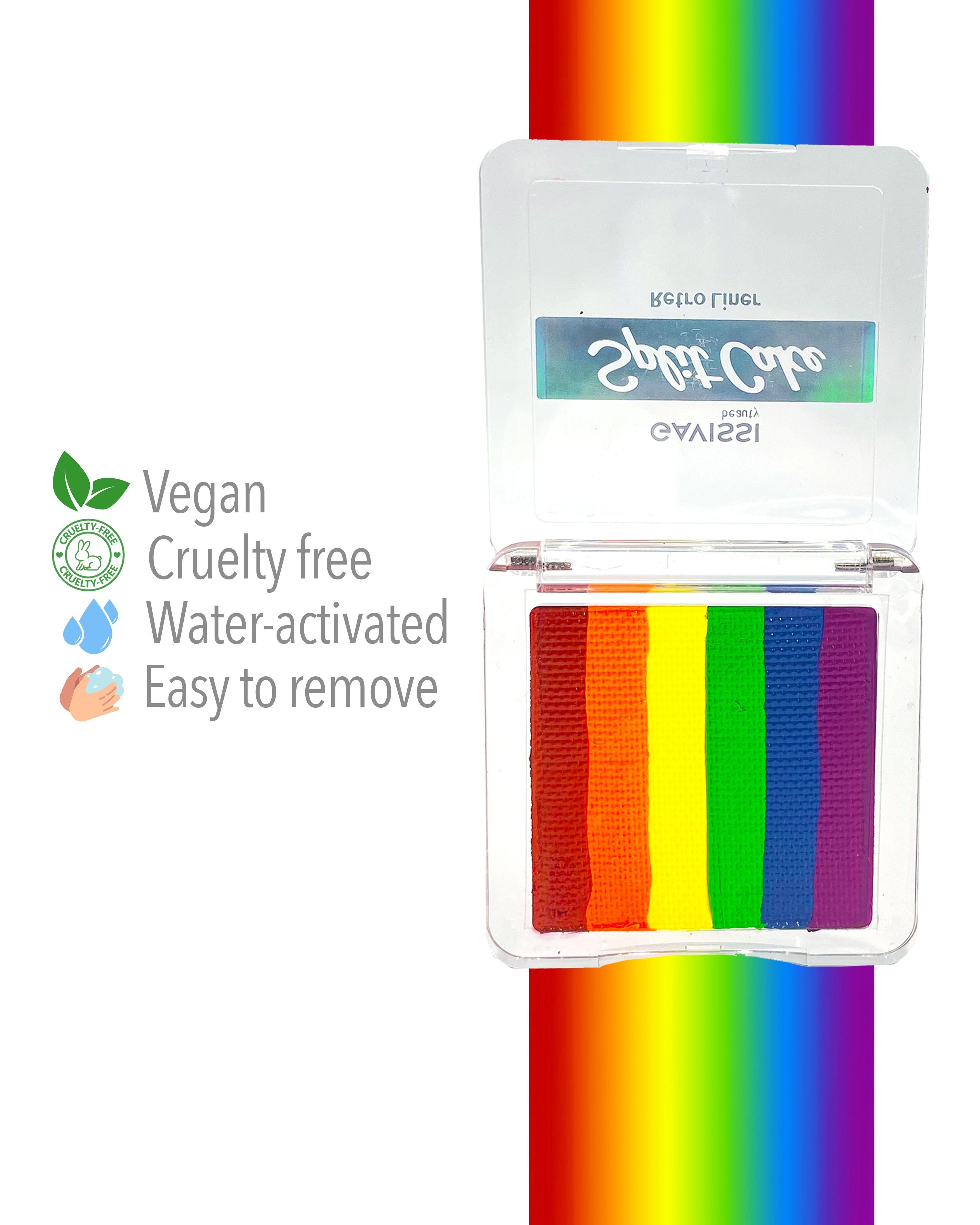 CREATE BEAUTIFUL RAINBOW GRADIENTS WITH OUR 6-COLOR SPLIT CAKE LINERS! IDEAL TO USE AS GRAPHIC LINER, FACE, AND BODY ART. ALL 6 COLORS ARE UV REACTIVE AND THEY GLOW UNDER UV LAMP/BLACKLIGHT.