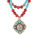 Get ready to elevate your style with this stunning Dalmatian Jasper Pendant Golden Necklace. Featuring beautiful Jasper, Magnesite, and vibrant turquoise stones, set on a striking bronze bezel. Adorned with delicate coral beads, this piece weighs 4.2 ounces. The necklace measures 17 inches in length with an additional 2 inch extender chain and lobster clasp closure, the pendant hangs at a perfect 3.5 inches with a width of 2.5 inches at its widest point. Each necklace is meticulously crafted and finished by hand.