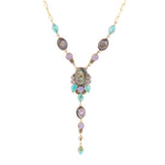 Elevate your look with our Regalia Blue Abalone Golden Y Necklace. Genuine bronze and a mix of purple quartz, blue abalone and blue turquoise, a luxurious and unique design. Hanging pendant measures 4", these necklaces are 18.5" long plus a 2" chain extender and lobster claps and .87"at the widest point and weighing a total of 26.9g each. Add a touch of elegance to any outfit with these beautiful pendant necklaces.