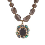Individually handcrafted and carefully completed, this necklace is adorned with lustrous black smoky quartz beads, a striking pendant made of blue abalone stones, and a captivating black quartz centerpiece, all embellished with golden bronze details. With a length of 17.5" and a 2" golden brass chain extender, it is secured with a lobster clasp for comfortable wear. The pendant, measuring 2.37" in length and widest point is at 1.88", adds a touch of elegance and weighs a total of 4.77 ounces.