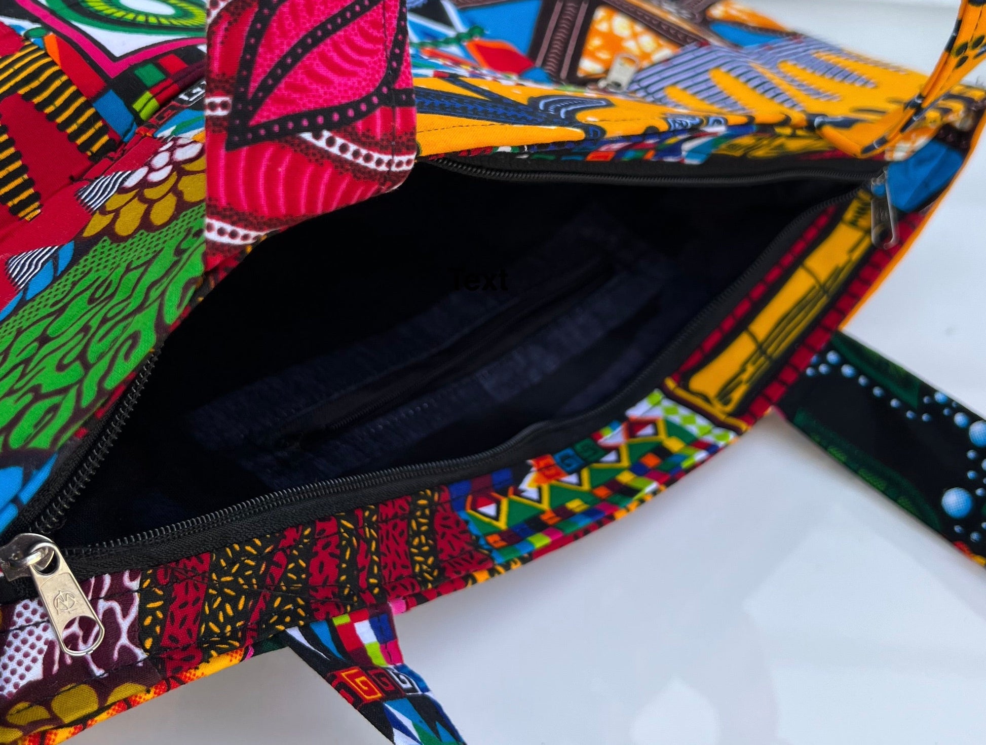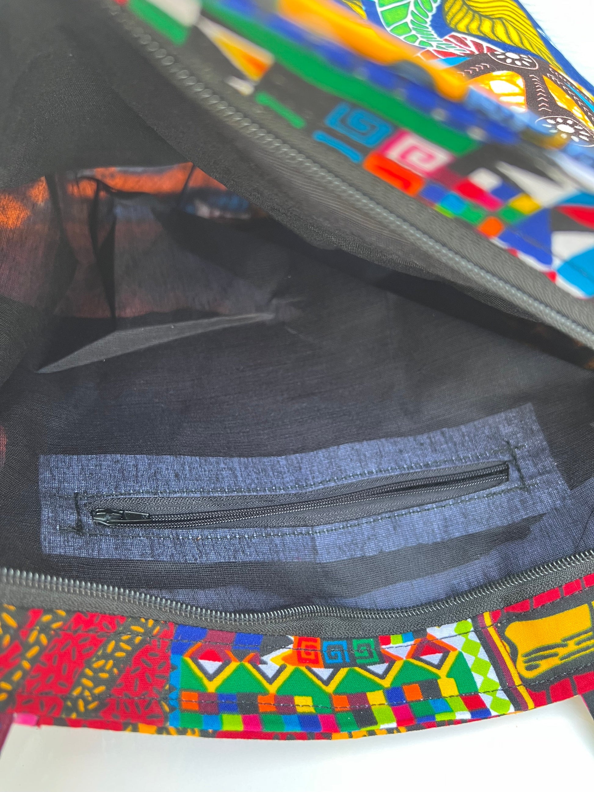 These bright and cheery purses made of patchwork Ankara fabrics make any outing feel sunny. Featuring straps 10" long and a box bottom to allow for lots of goodies inside, an interior and an exterior pocket. Bag body measures 19"x13"x6"