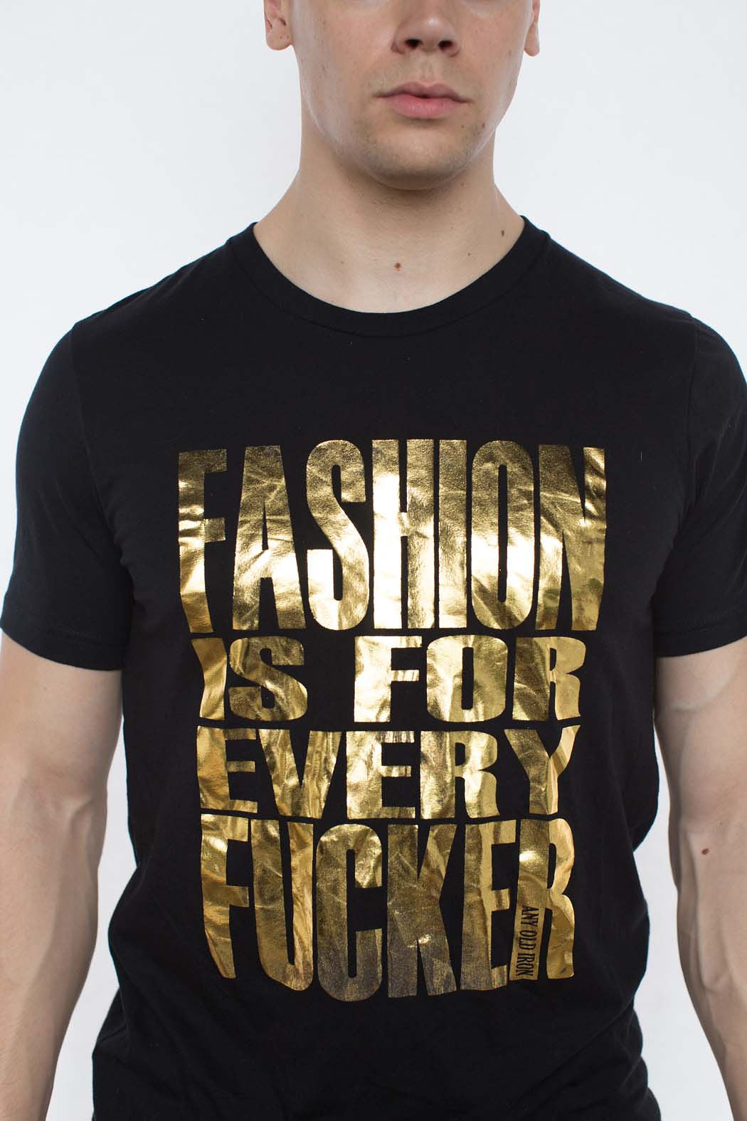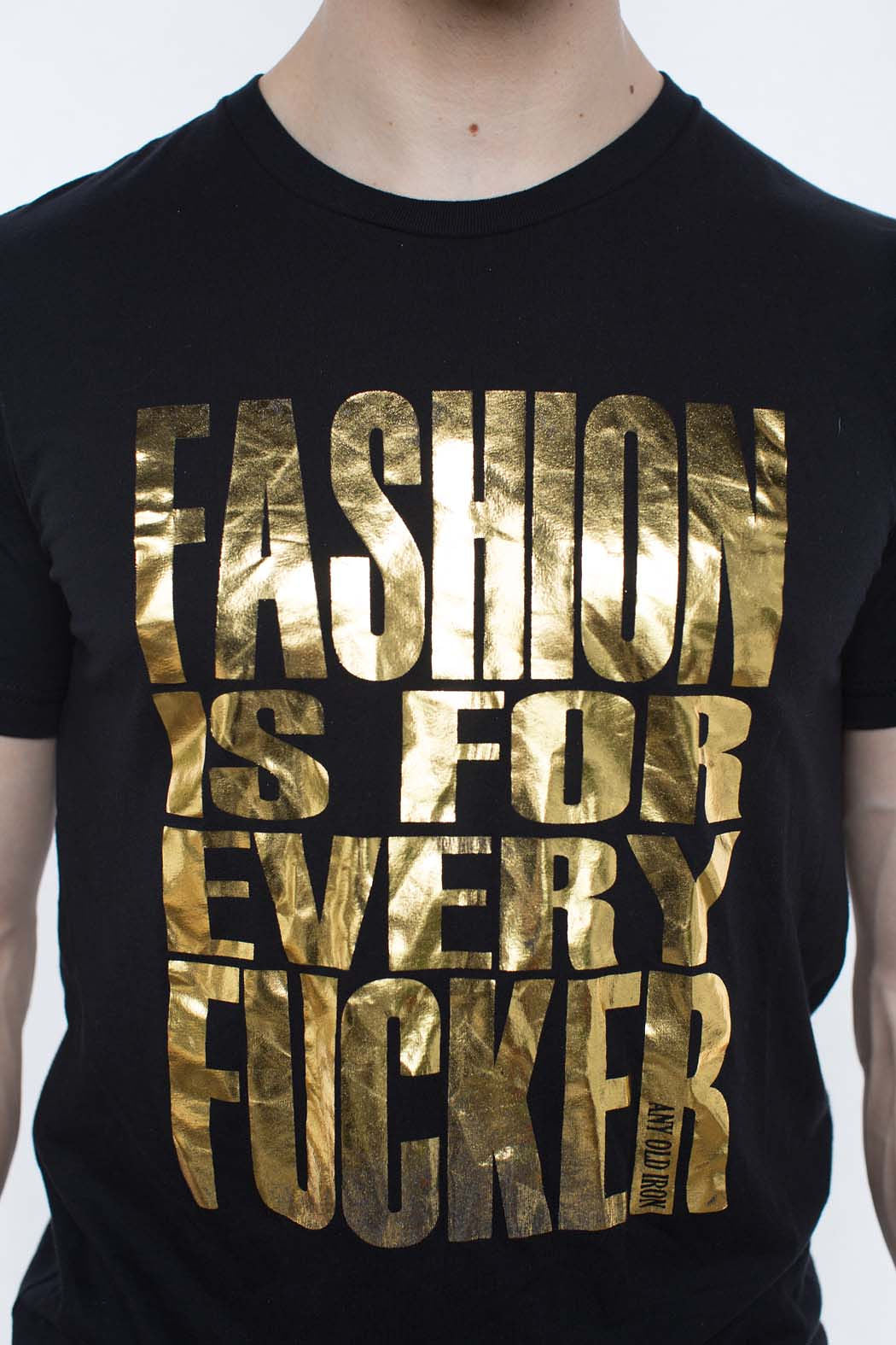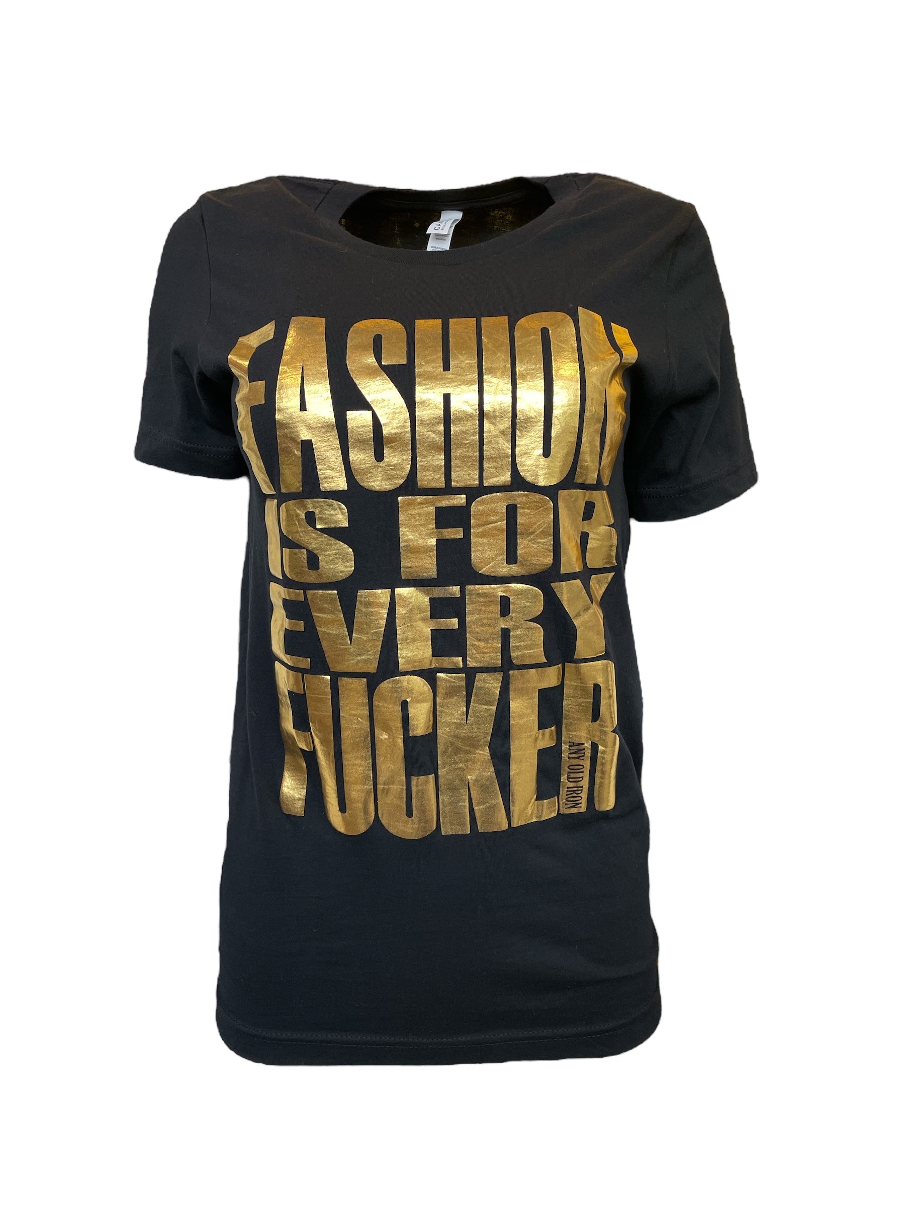 Here at Any Old Iron, we strongly believe that fashion is not just for a few, but is for EVERY fucker - no matter your background, where you came from, or how you are currently writing your story. Fashion is a constant in our lives. It unites people across cultures; brings our inner beauty and voice outwards; and provides us with a sense of security, even in a world where people love to tell you what to wear and who to be. That's why we have created the perfect tee for all fashion lovers: the Any Old Iron Fashion Is For Every Fucker T-Shirt! This 100% cotton, black tee features a metallic gold foil message front and center. Along the tee in brilliant and bold lettering,  "fashion is for ever fucker" can be found in full, glimmering display. It is the perfect top for any fashion fucker; for, it goes with everything! Traveling out of town? You can pair it with our Goldie Joggers for a comfortable trip. Attending a fashion-focused fundraiser? Style this tee under your favorite sequin suit!