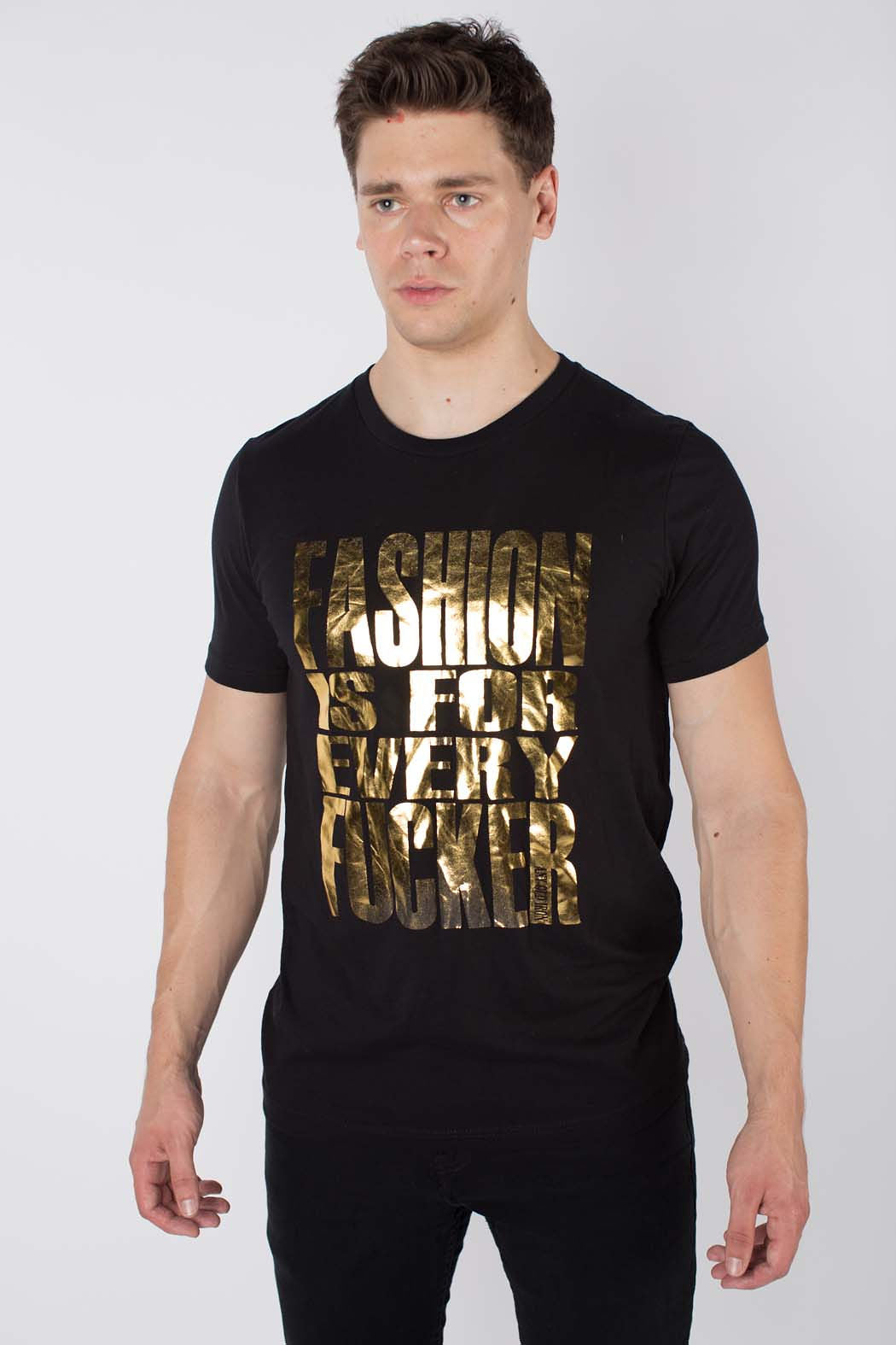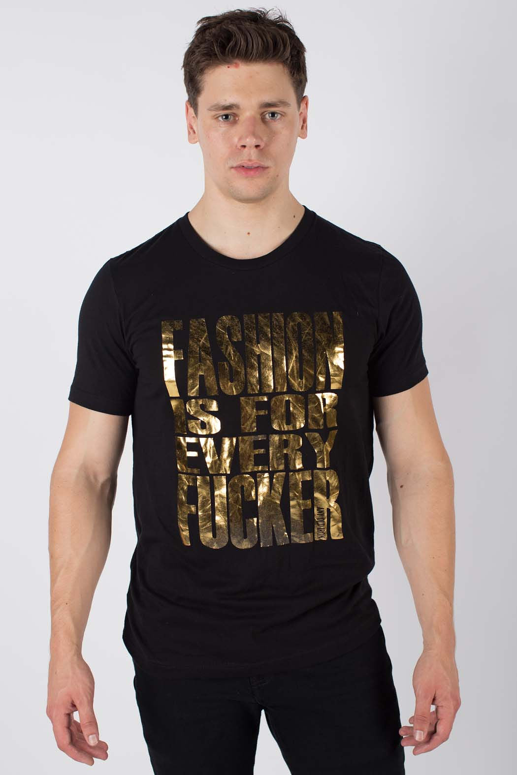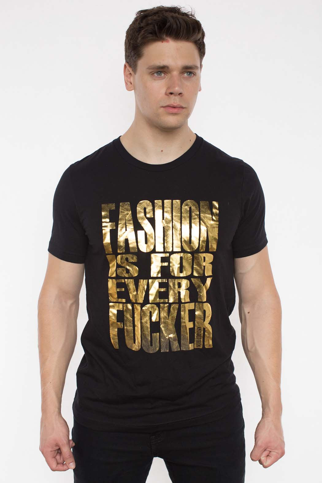 Here at Any Old Iron, we strongly believe that fashion is not just for a few, but is for EVERY fucker - no matter your background, where you came from, or how you are currently writing your story. Fashion is a constant in our lives. It unites people across cultures; brings our inner beauty and voice outwards; and provides us with a sense of security, even in a world where people love to tell you what to wear and who to be. That's why we have created the perfect tee for all fashion lovers: the Any Old Iron Fashion Is For Every Fucker T-Shirt! This 100% cotton, black tee features a metallic gold foil message front and center. Along the tee in brilliant and bold lettering,  "fashion is for ever fucker" can be found in full, glimmering display. It is the perfect top for any fashion fucker; for, it goes with everything! Traveling out of town? You can pair it with our Goldie Joggers for a comfortable trip. Attending a fashion-focused fundraiser? Style this tee under your favorite sequin suit!