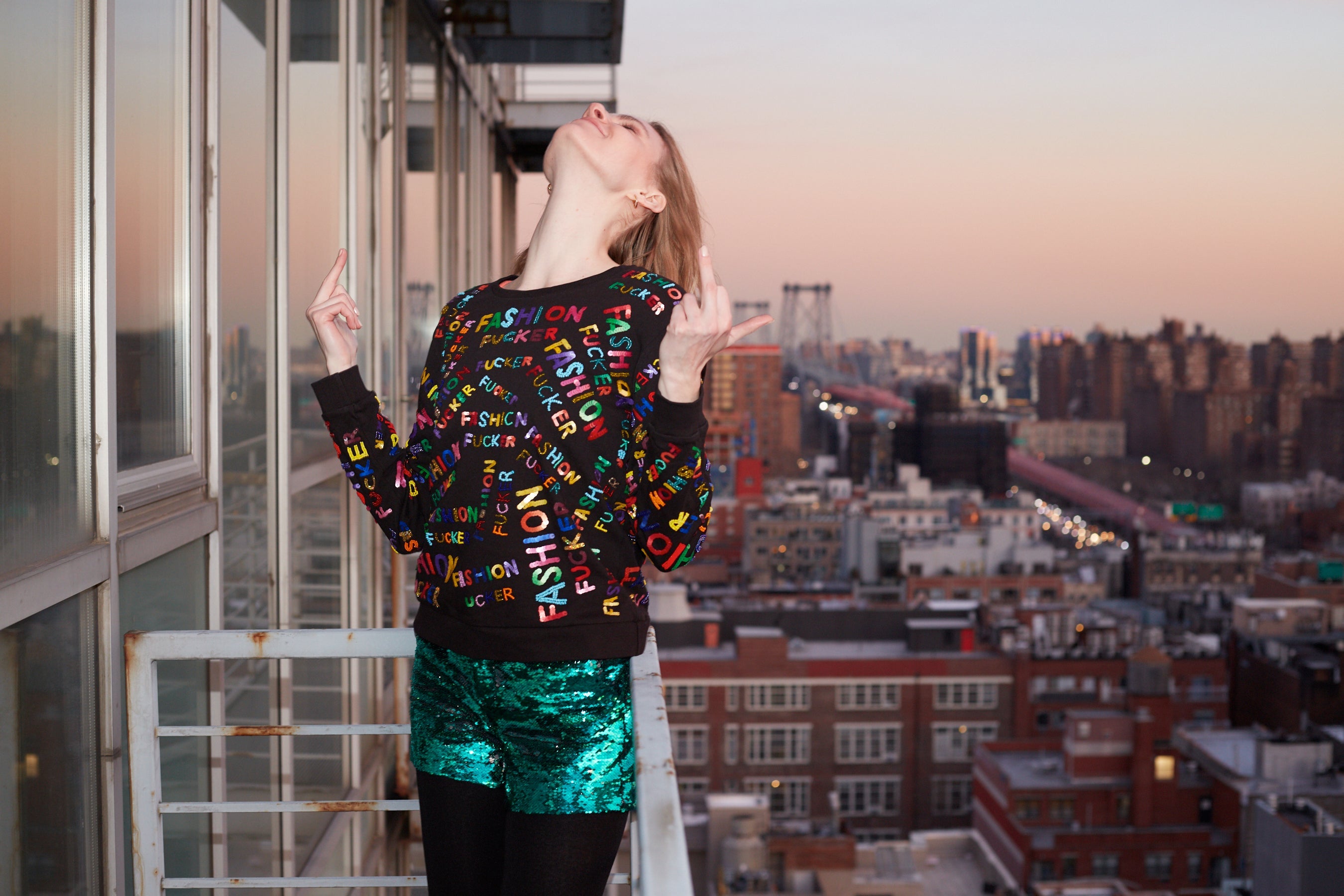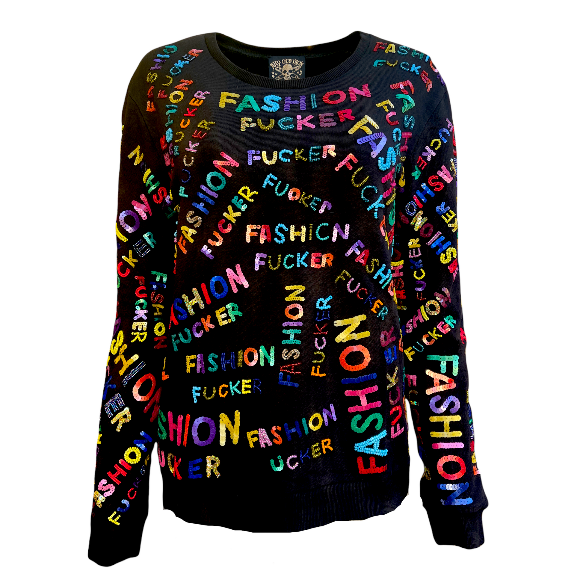 You are a limited edition, one-of-a-kind individual with a rare, heightened sense of fashion. You stand out from the rest, without ever trying, and inspire those around you; so, we decided to replicate that originality you wear so well by making a tribute to the likes of you, the limited edition fashion fuckers! That's why AOI has brought you the Any Old Iron FF Sweatshirt Ltd Edition. This 100% cotton, limited-edition, statement sweatshirt is covered in colorful, hand-beaded "Fashion Fucker" lettering from the front to the back. The rainbow beading offers a striking visual complexity, with edgy-chic styling. It is the perfect one-of-a-kind sweatshirt for any one-of-a-kind human; for, it can be styled with anything! You can pair this wearable piece of modern art with your favorite pair of jeans and some flats; or, you can style it with a leather skirt and some tall boots.
