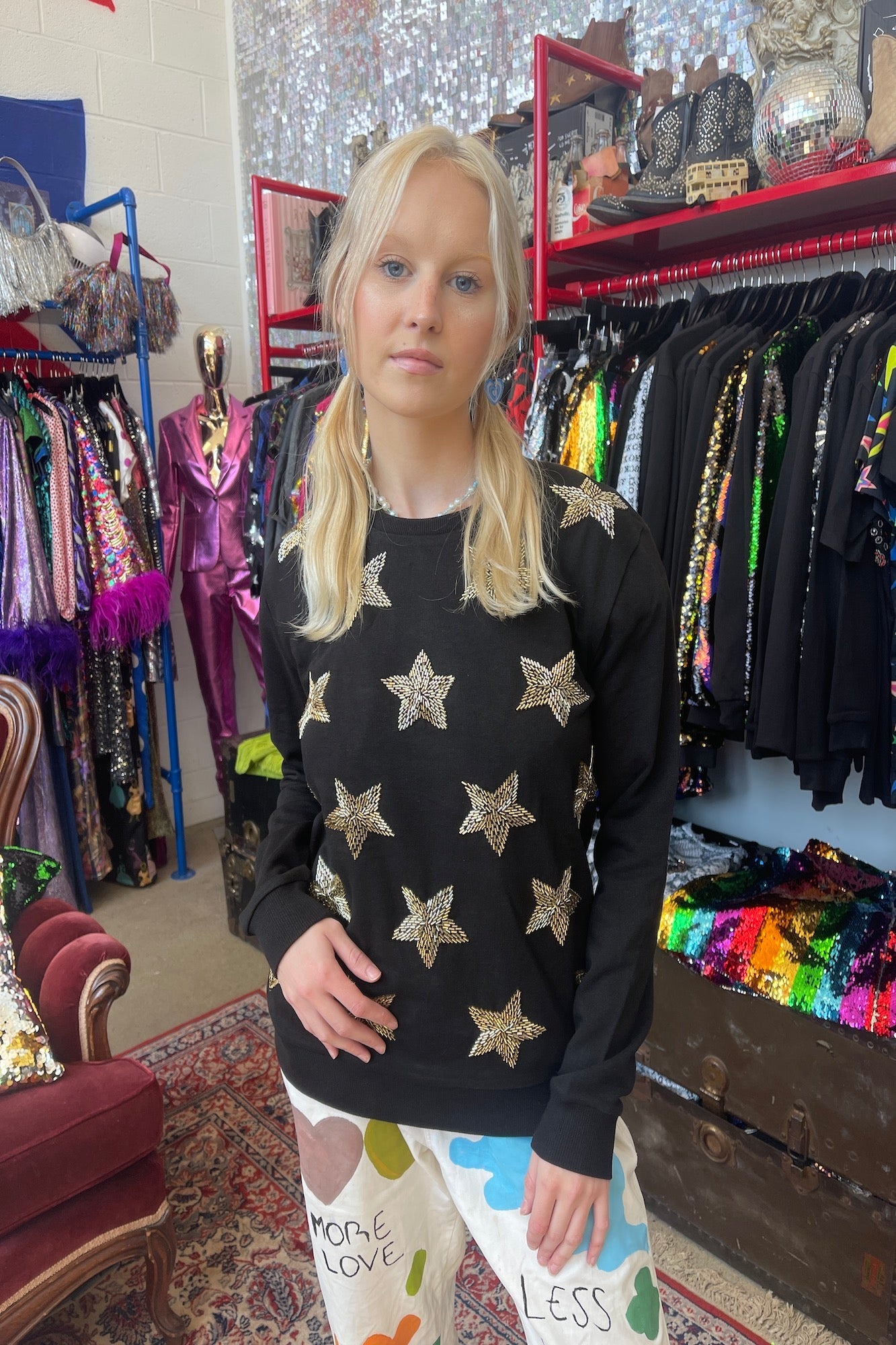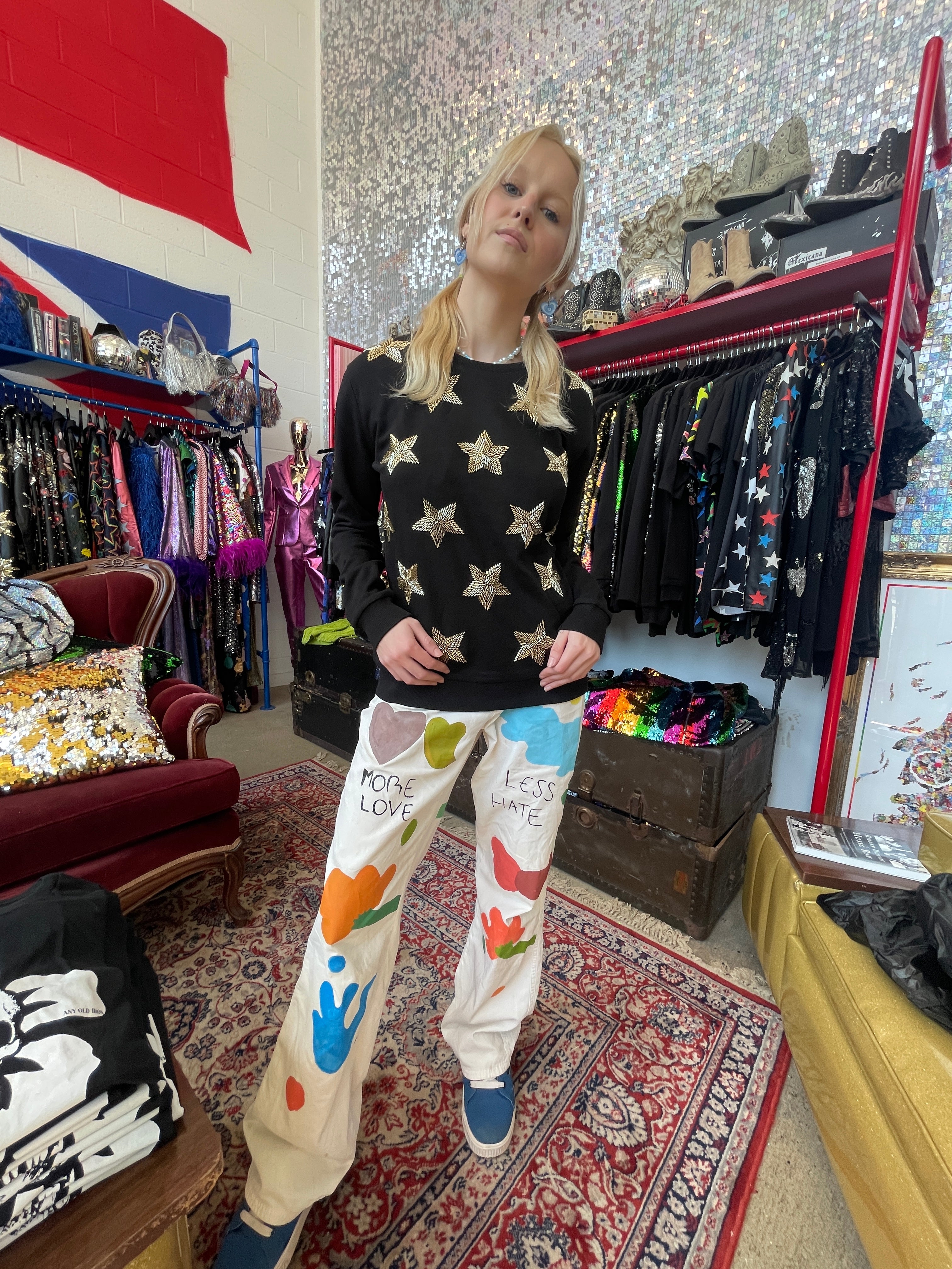 To care for your 100% cotton sweatshirt with hand beaded stars, please have it dry-cleaned or hand-washed. If you do choose to hand wash your sweatshirt, please be sure to use cool water and a mild soap. Rinse gently with your fingertips and allow the garment to hang to dry. Any other form of care may damage the design.