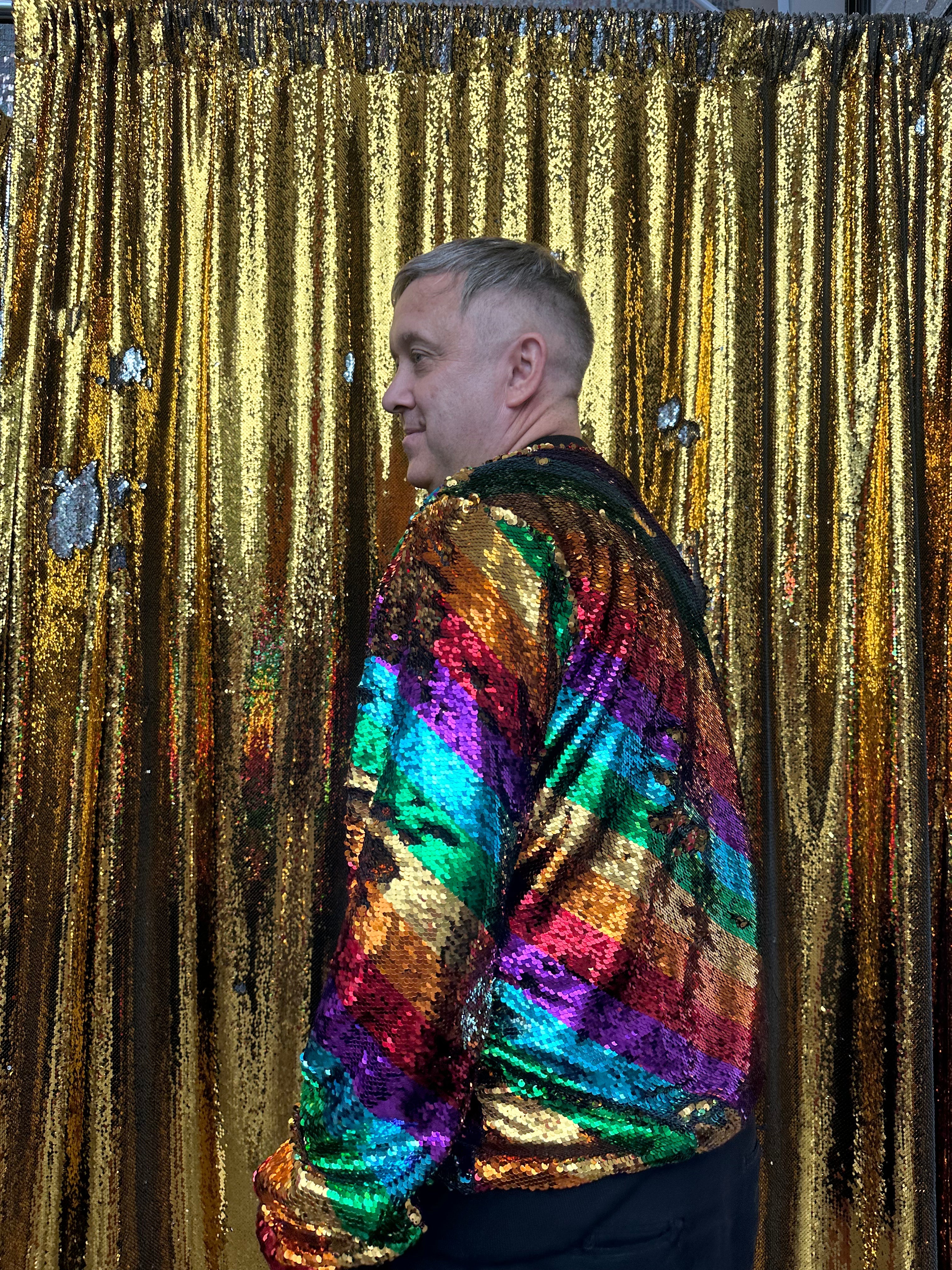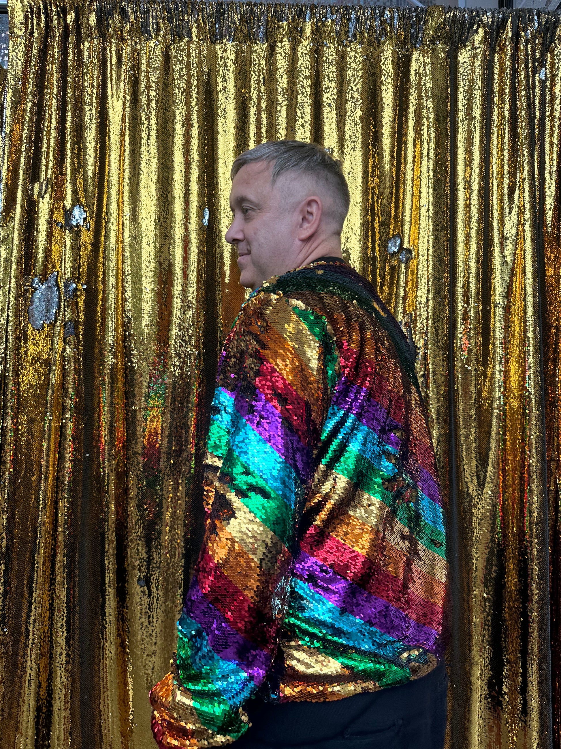 Our smoldering model (and designer) is the sensational Andrew! This sweatshirt is made out of 100% satin and sequins. This sweatshirt, along with other full sequin sweatshirts, have limited stretch. If you are stuck between two sizes, order up. DM us if you have any questions.
