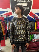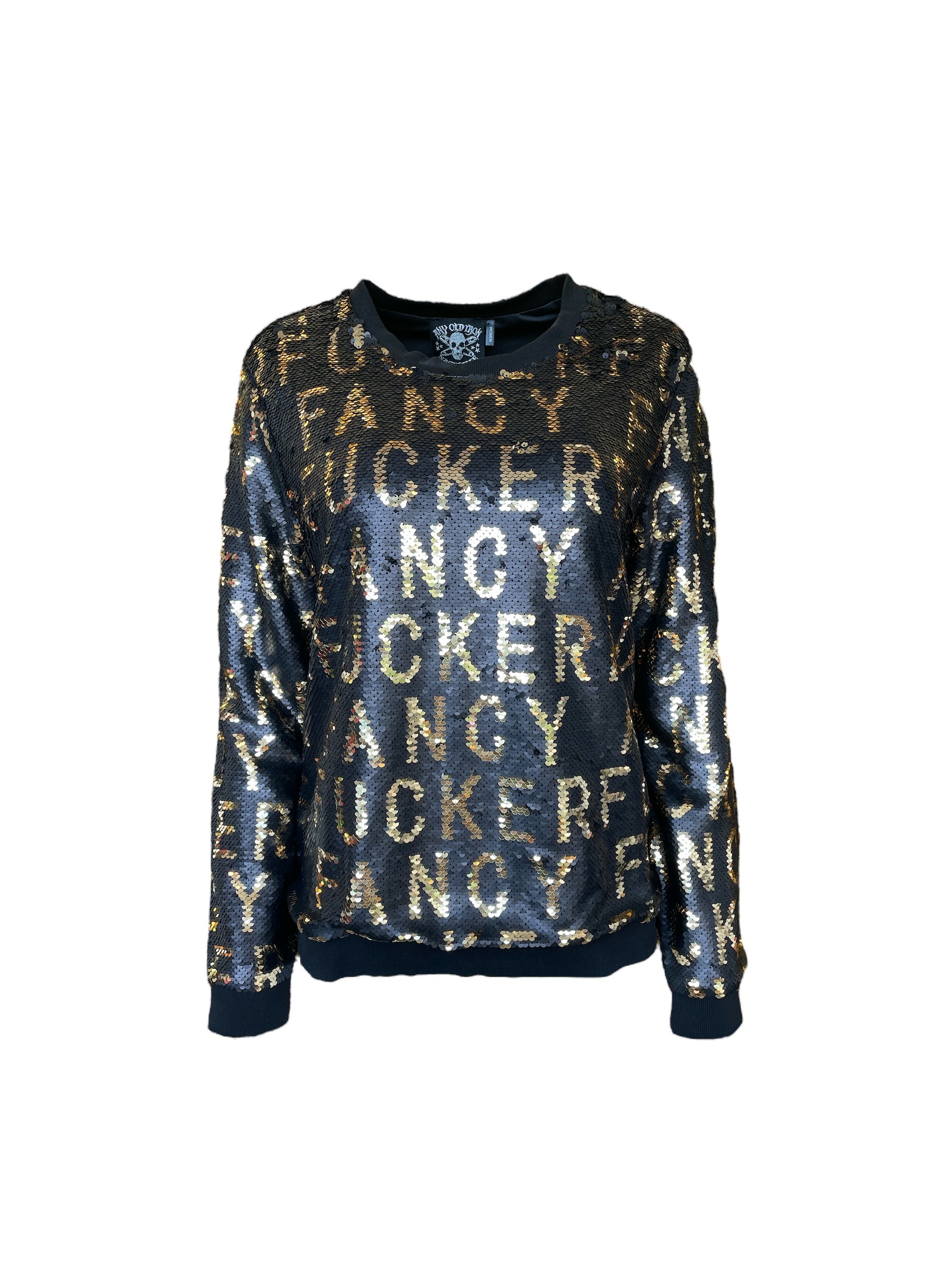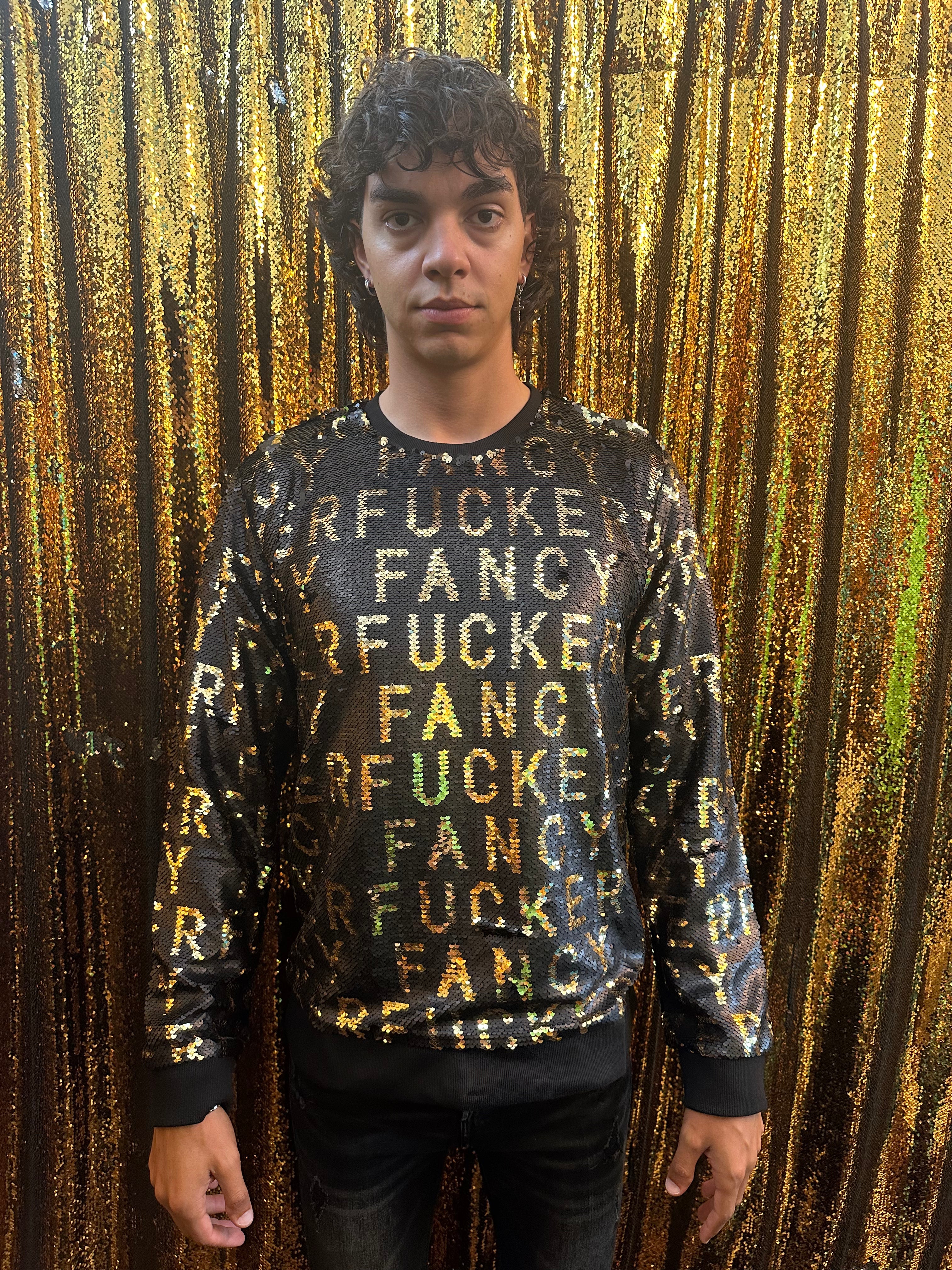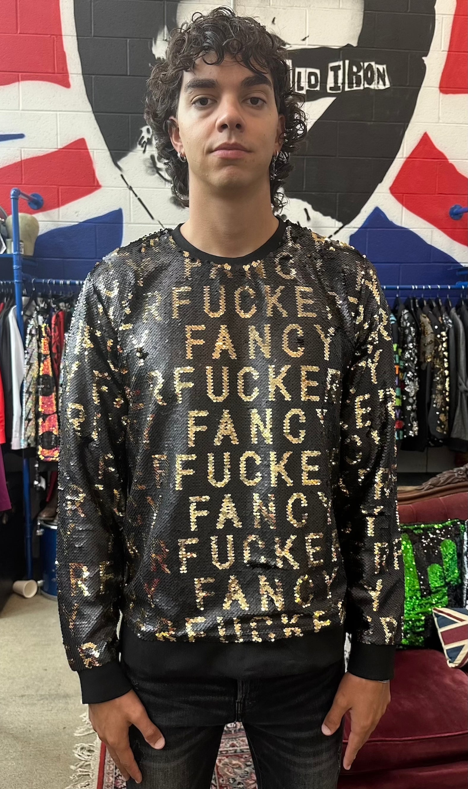 What is better than subliminal messaging in a minimalistic manner? Don't ask us. We have no fucking clue. What we do know is that YOU, my dear, are a fancy fucker and deserve the best. That is why we have released the new Any Old Iron Men's Sequin Fancy Fucker Sweatshirt! While our other version is a smash hit, it was not as much of a warning sign as some of you need it to be! Don't worry-this bad boy is! This matte black, sequin sweatshirt is loaded with the favorite "fancy fucker" phrase, front to back, in a shimmering, gold sequin lettering. The contrast between the matte sequins and the glossy sequins really gives that luxurious oomph we all need. The interior lining is made completely out of polyester, which adds to the experience by providing you with the comfort you would receive from you favorite satin sheets. It, also, provides air flow for those warmer days and retains body heat for those cooler nights.