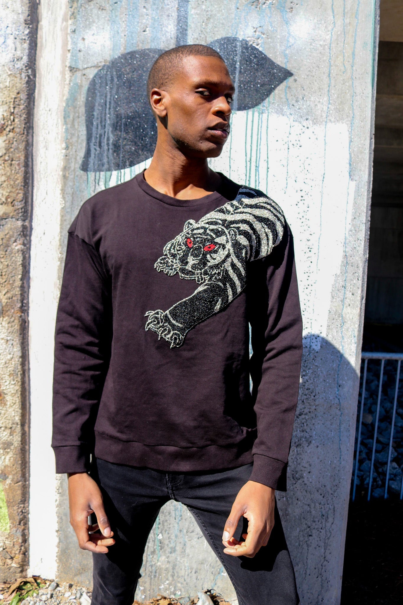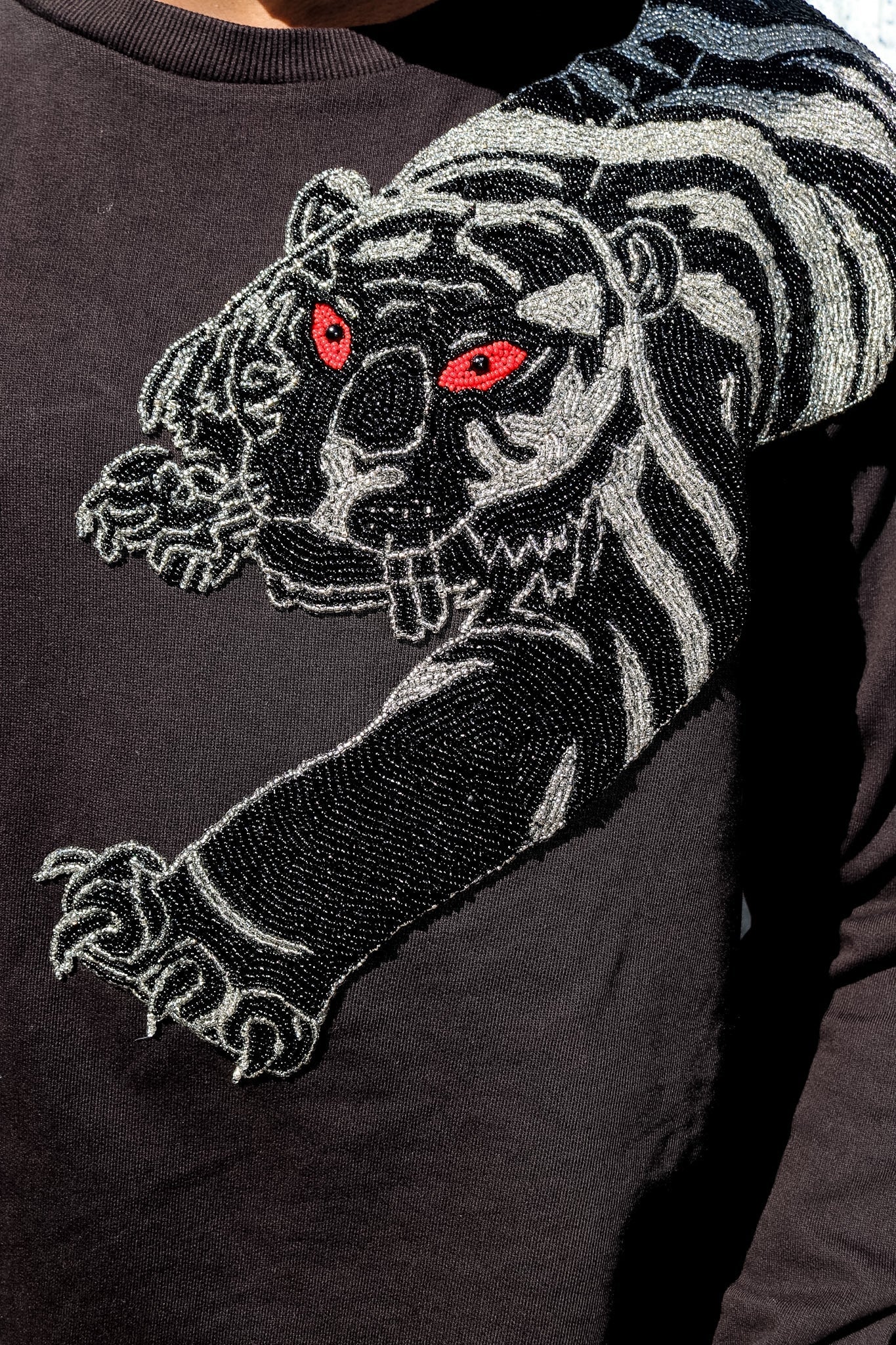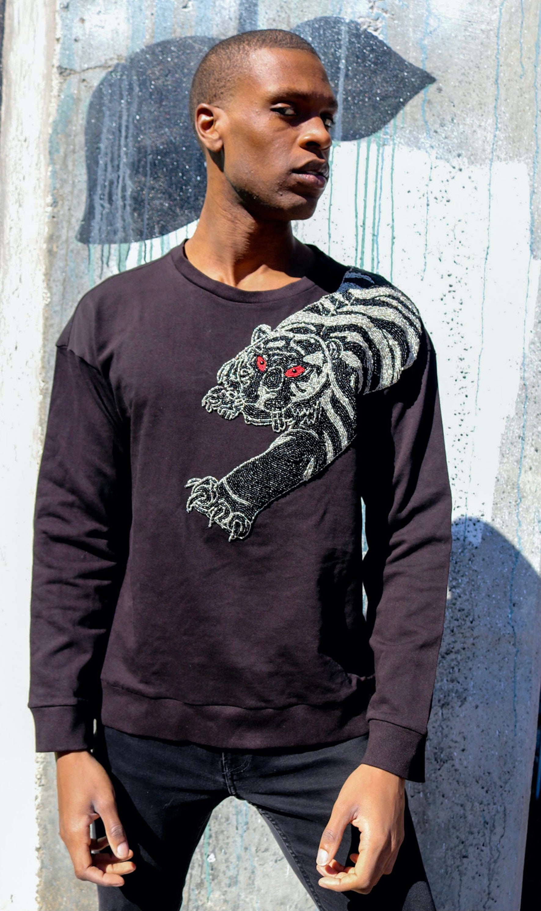 You need a sweatshirt that lets everyone know that "if they fuck with the tiger, they are bound to get the claws." No other sweatshirt fits the bill quite like the Any Old Iron Tiger Sweatshirt! This top is an all-black embroidered sweatshirt made for total comfort and style. This piece is expertly crafted with a hand-embroidered, beaded tiger that stretches along the front and the back. This sweatshirt comes in a relaxed fit, offering plenty of casual comfort that is easy to style with jeans and staple pieces in your wardrobe. It is the perfect gift for any fearless feline lover, king of the jungle, and cat-fight regular. So sharpen your claws and snag yours while you can!