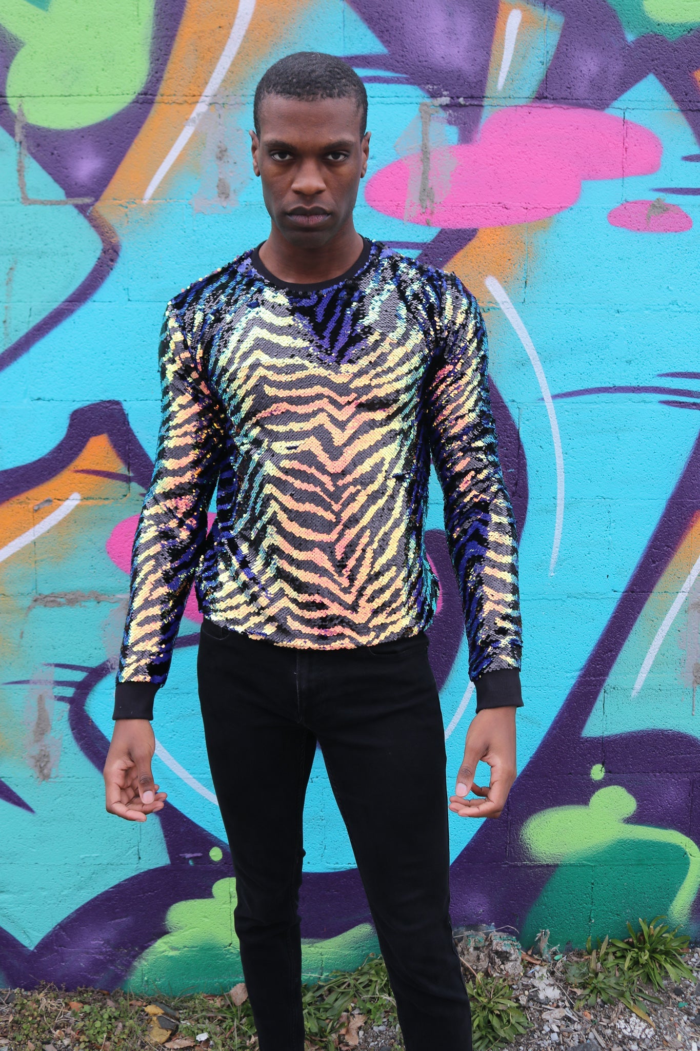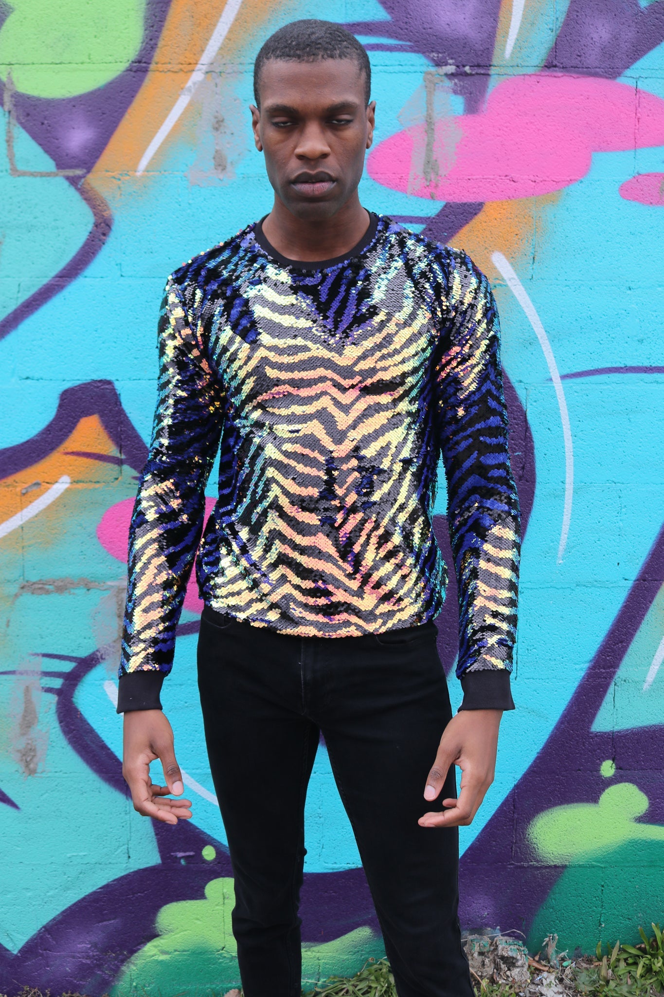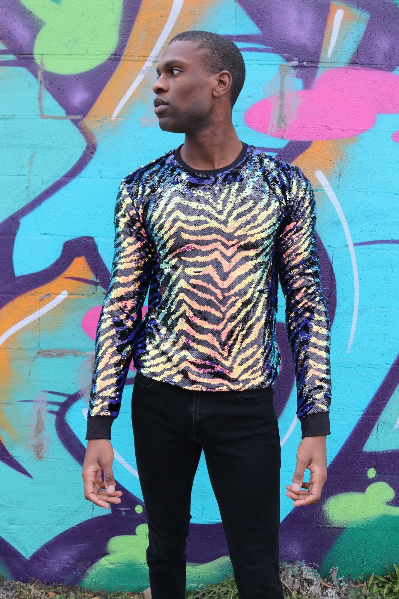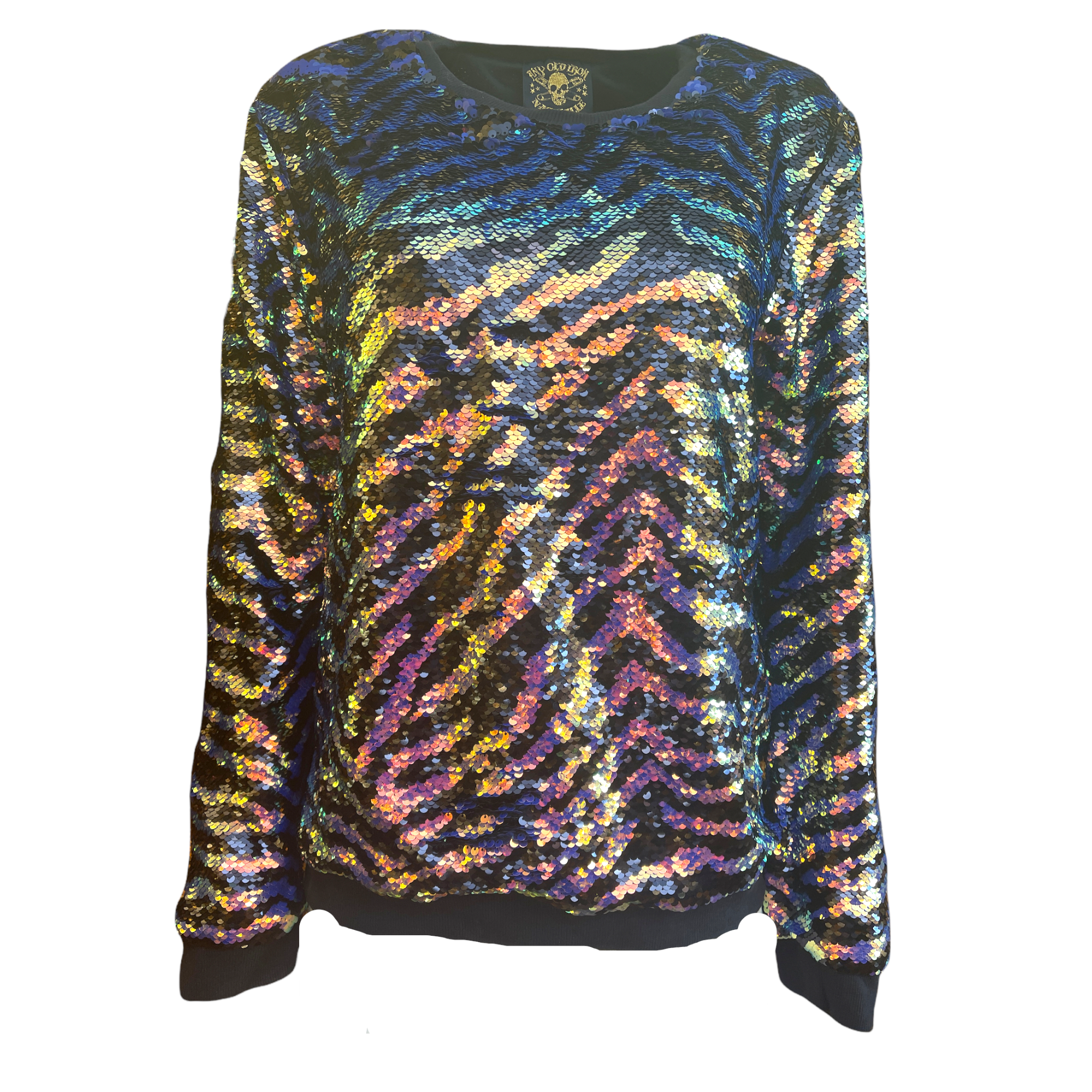 Like a zebra's stripes, no one could ever replicate you. You are a one-of-a-kind, rarity that makes life so much brighter. That's why the Any Old Iron Mens Zebra Sweatshirt is perfect for you! Modern detailing and a unique look make this sweatshirt stand out from the rest. This sweatshirt for men is defined by its iridescent sequin embroidery in a zebra pattern. Shades of cool blues, warm golds, hot pinks, and rick purples can be seen dancing along the sequins as the light touches it in every angle. Get in touch with your wild side, and add this relaxed and statement-making piece to your wardrobe. It can be worn with dark leather for a high contrast; or, pair it with some matching sequin bottoms for an optimal flashy design. No matter how you style it, no one will be able to do it like YOU!