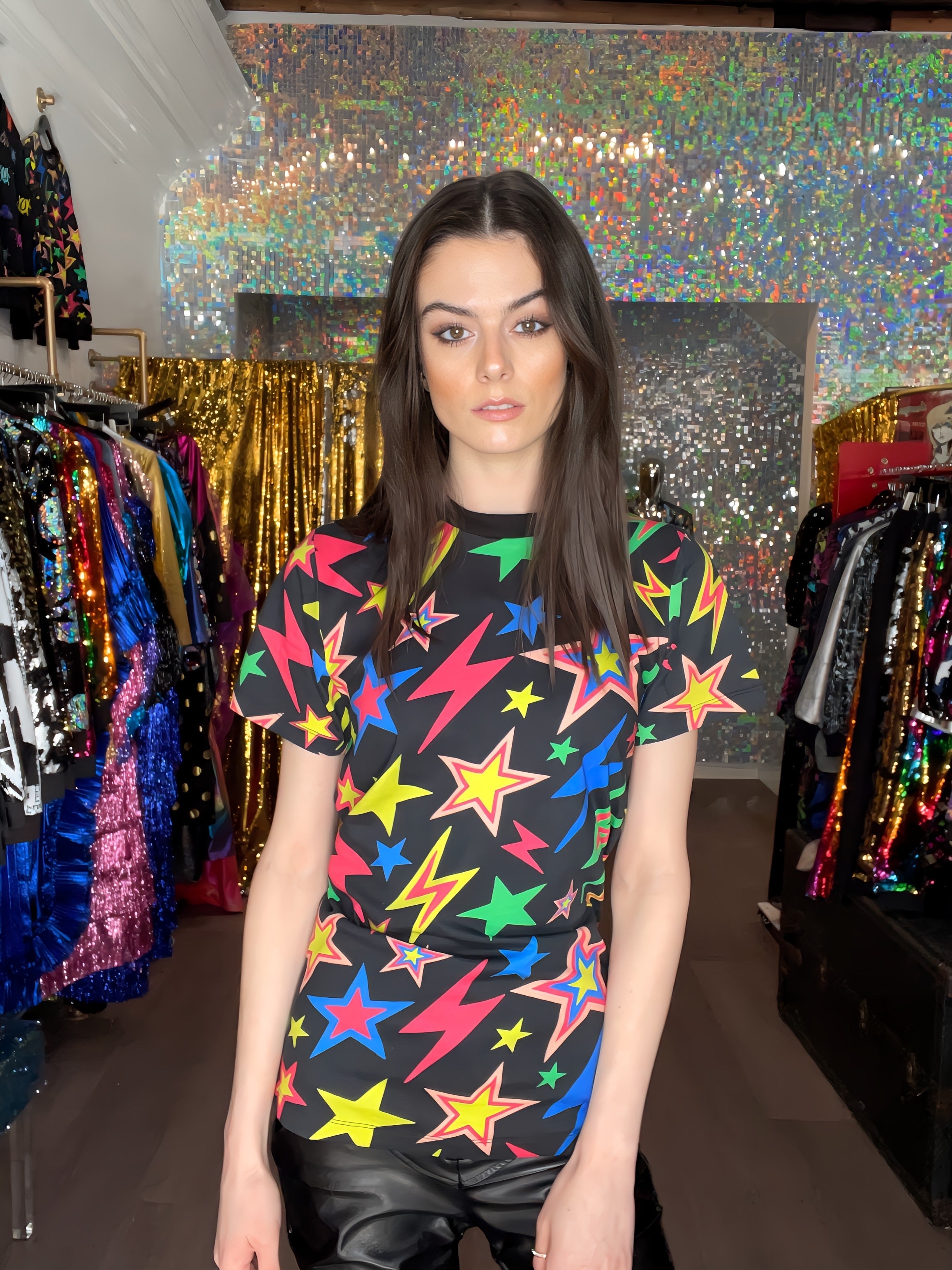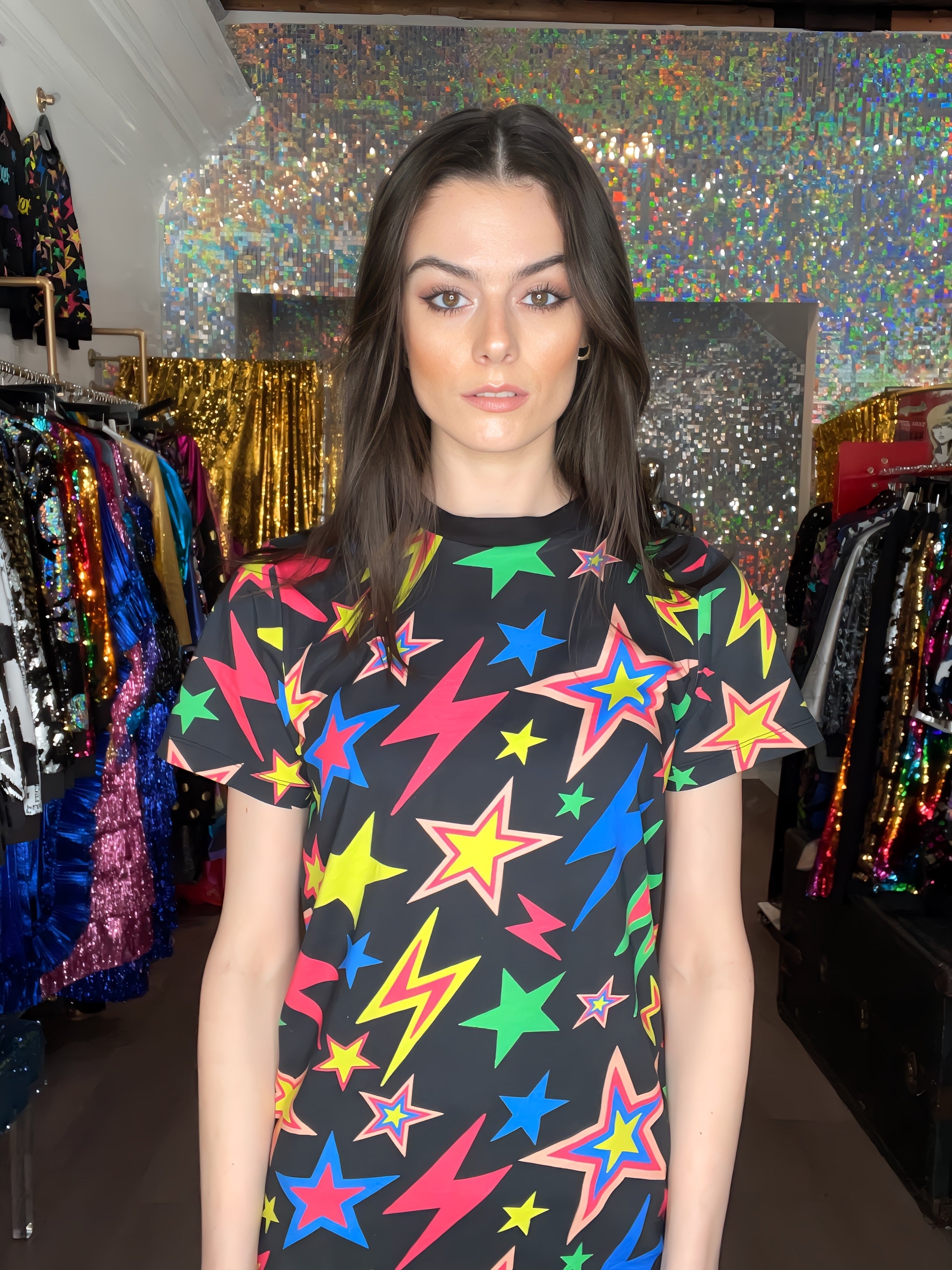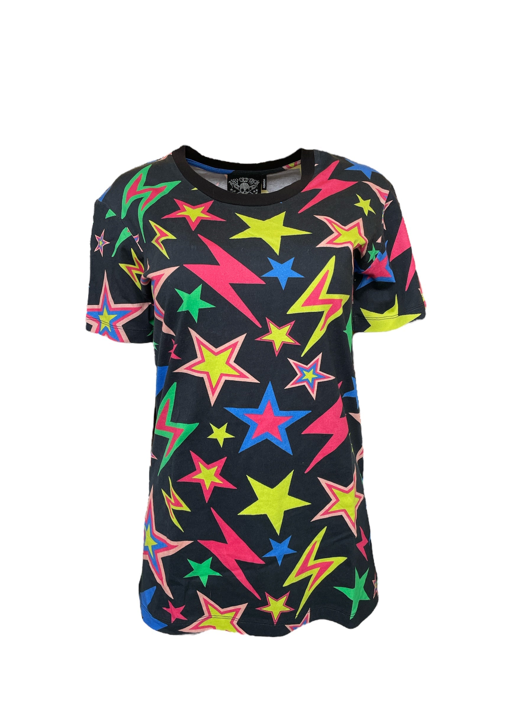 Be bright and bold with a unique design that is sure to get you noticed. The Shazam T-Shirt is patterned with vibrant celestial-inspired prints, with its playful starburst and lightning bolts. Made with a casual silhouette and a look that goes great with jeans or a leather skirt.