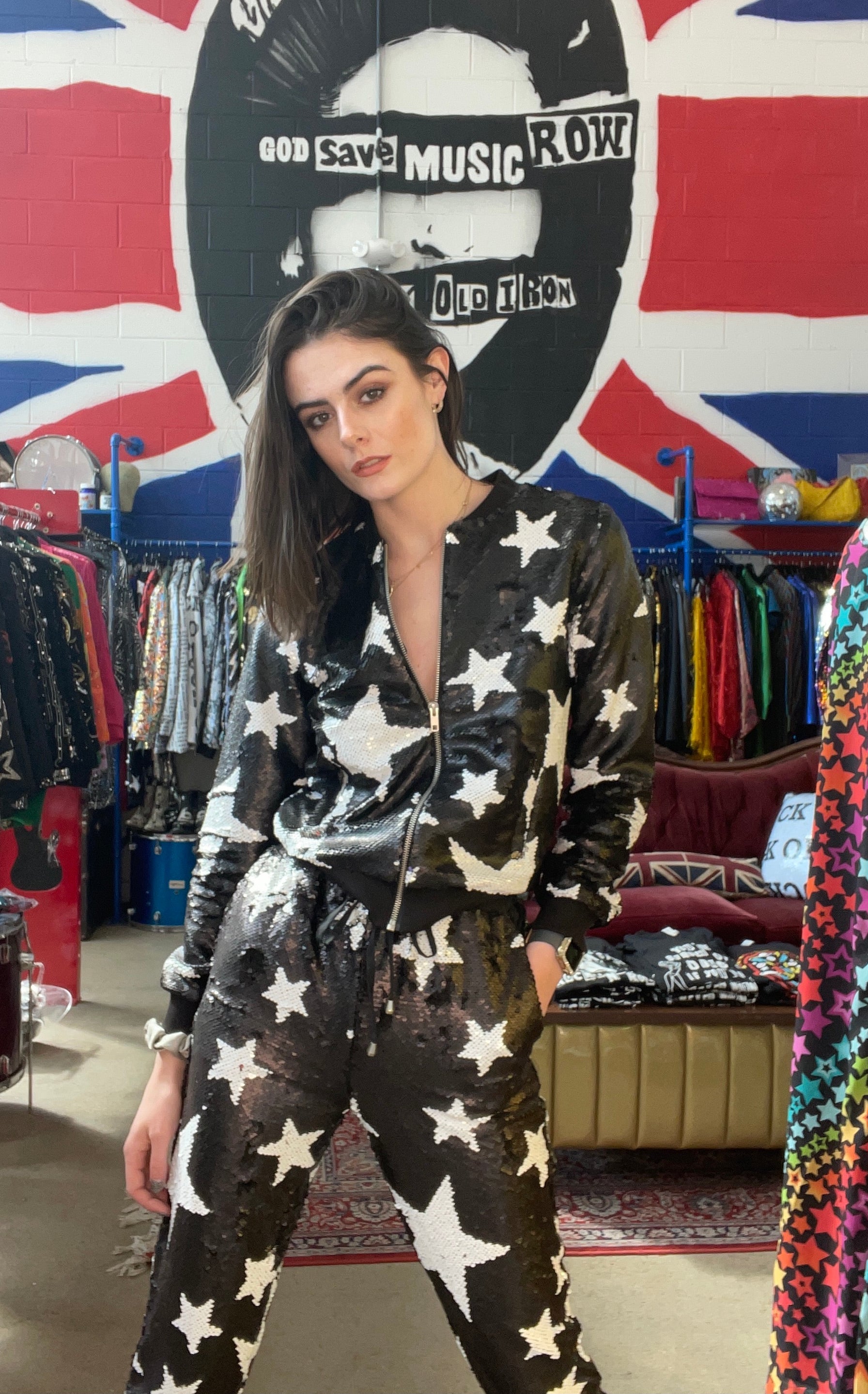 As a star, my dear, you deserve to twinkle! That is why Any Old Iron has taken the fan favorite pattern and has made it bigger, bolder, and better than ever! The result? The brilliant Any Old Iron Sparkle Star Joggers! These bottoms are covered from top to bottom in a matte black and white sequin, Any Old Iron exclusive star pattern. These bright white stars differ in sizes and range from larger than life to fun sized. However, with the swipe of a hand, those pure white stars will turn to a dazzling silver. While the design is out of this world, the interior lining will have you in love. On the interior of the joggers, a luxurious, silky smooth satin can be found, which will instantly remind you of your favorite hotel sheets. It, also, aides in ventilation and comfortability. Not to mention, these pants come with two exterior pockets for a hands-free evening. Truly, these joggers have it all, from function to fashion. With a neutral color palette, these bad boys go with EVERYTHING! You can style them as easily with a black crop top or rock n' roll tee as you can with our matching Sparkle Star Sweatshirt. If you are feeling bold, you can even pair it with the lush Sparkle Star Moto! All the joggers need is a star, who will make it shine brighter than ever before: YOU!