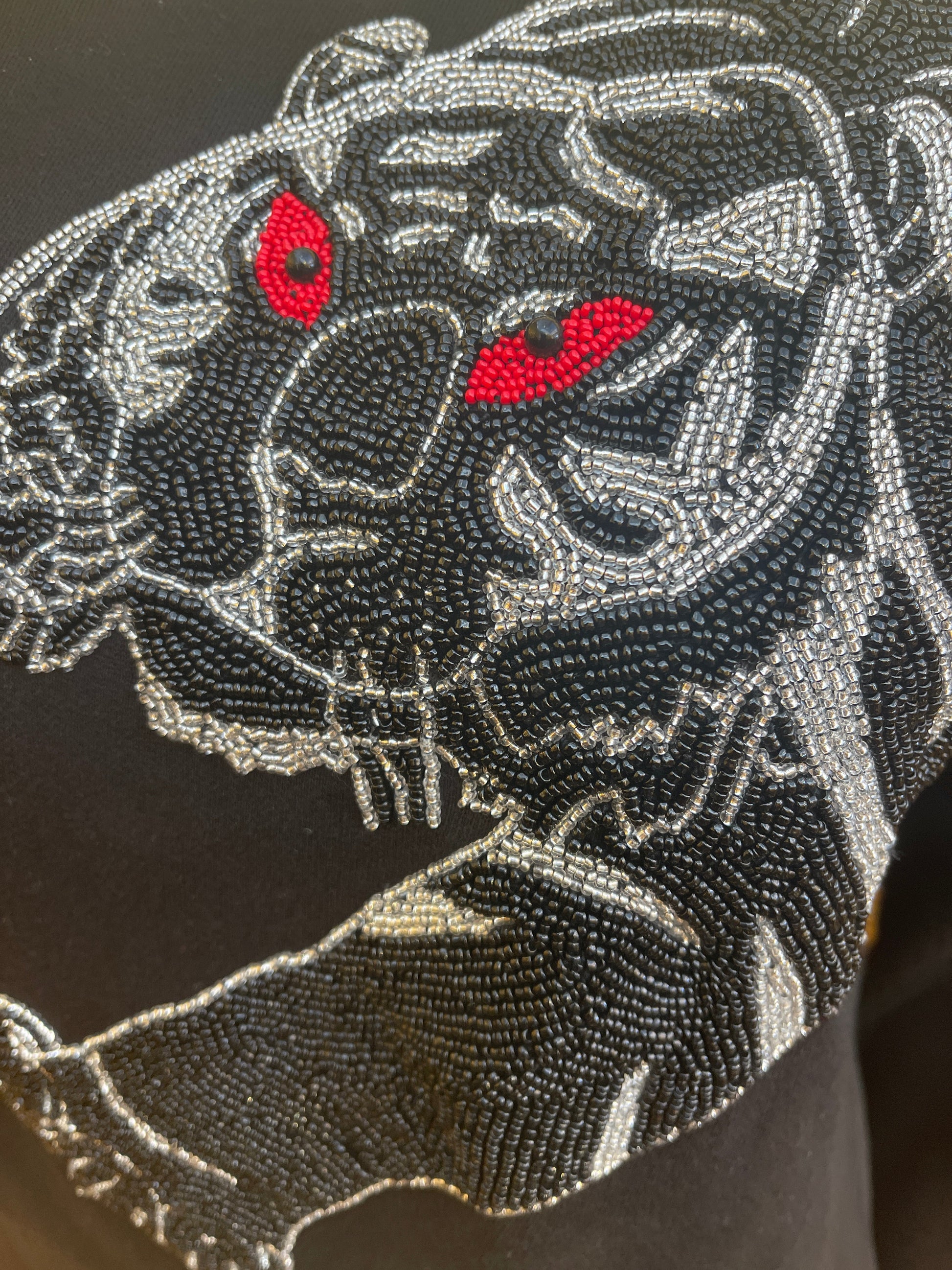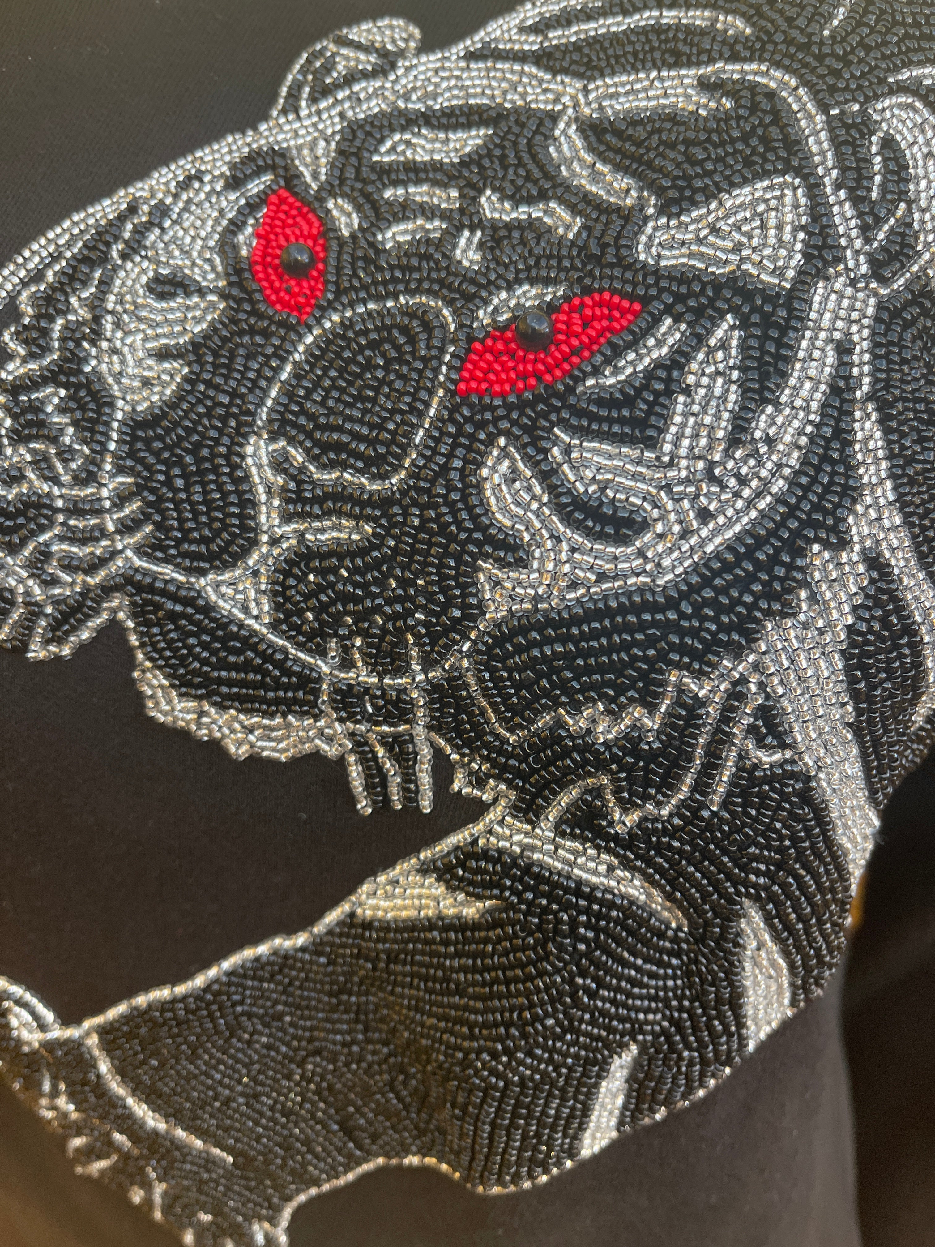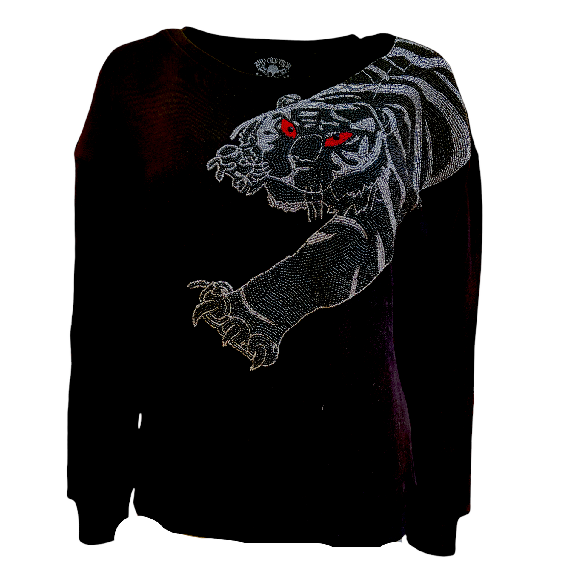 Any Old Iron has brought you yet another sweatshirt that you will want to sink your claws into, The Any Old Iron Tiger Sweatshirt! This all-black sweatshirt features an eye-catching, hand-beaded tiger that can be seen sun-bathing along the shoulder. This wild feline stretches from the bust to the mid-back in all its glory. The beads used to bring the tiger to life consists of different shades, with silver and black being predominantly used for the body and red for the eyes. This sweatshirt is made with cotton; therefore, it has some stretch to it. It is the perfect top for any event, from running errands to visiting your local zoo. It can be dressed down as easily as it can be dressed up. Pair this beauty with some leather trousers and booties for a casual evening out with the girls; or, style this sweatshirt with a maxi skirt and some heels for a more elevated affair. No matter how you style this bad boy, you will be sure to be the cat's meow!
