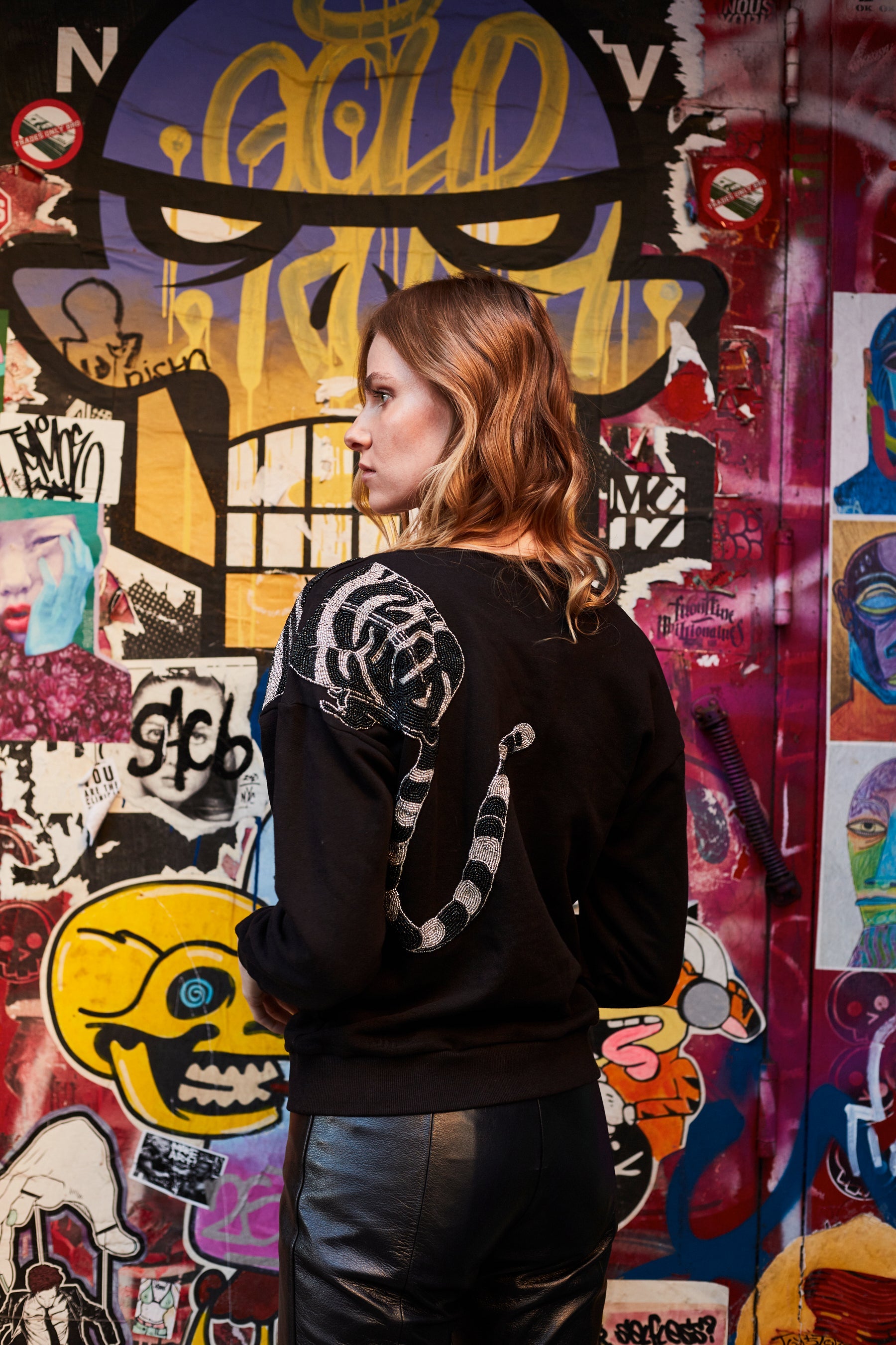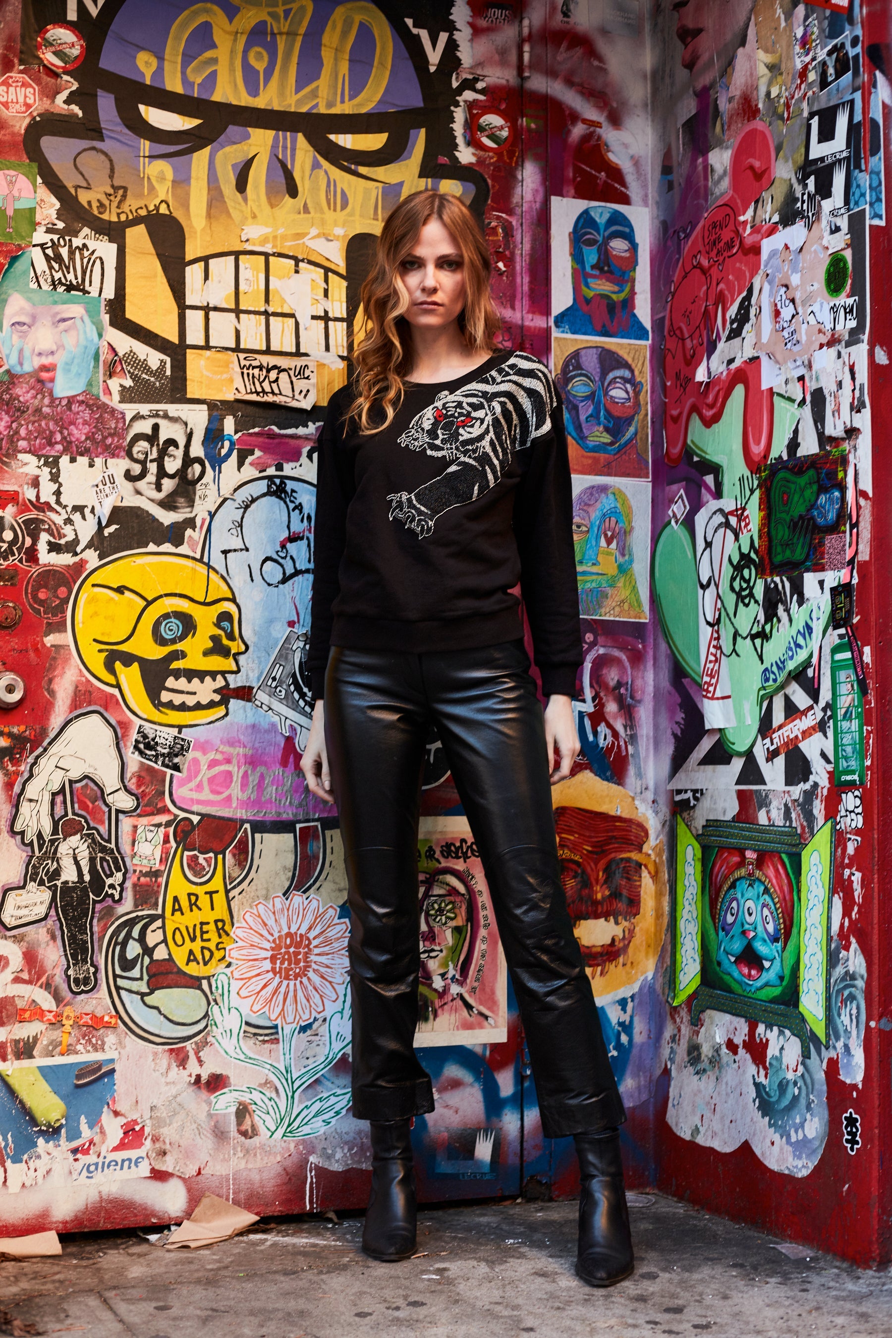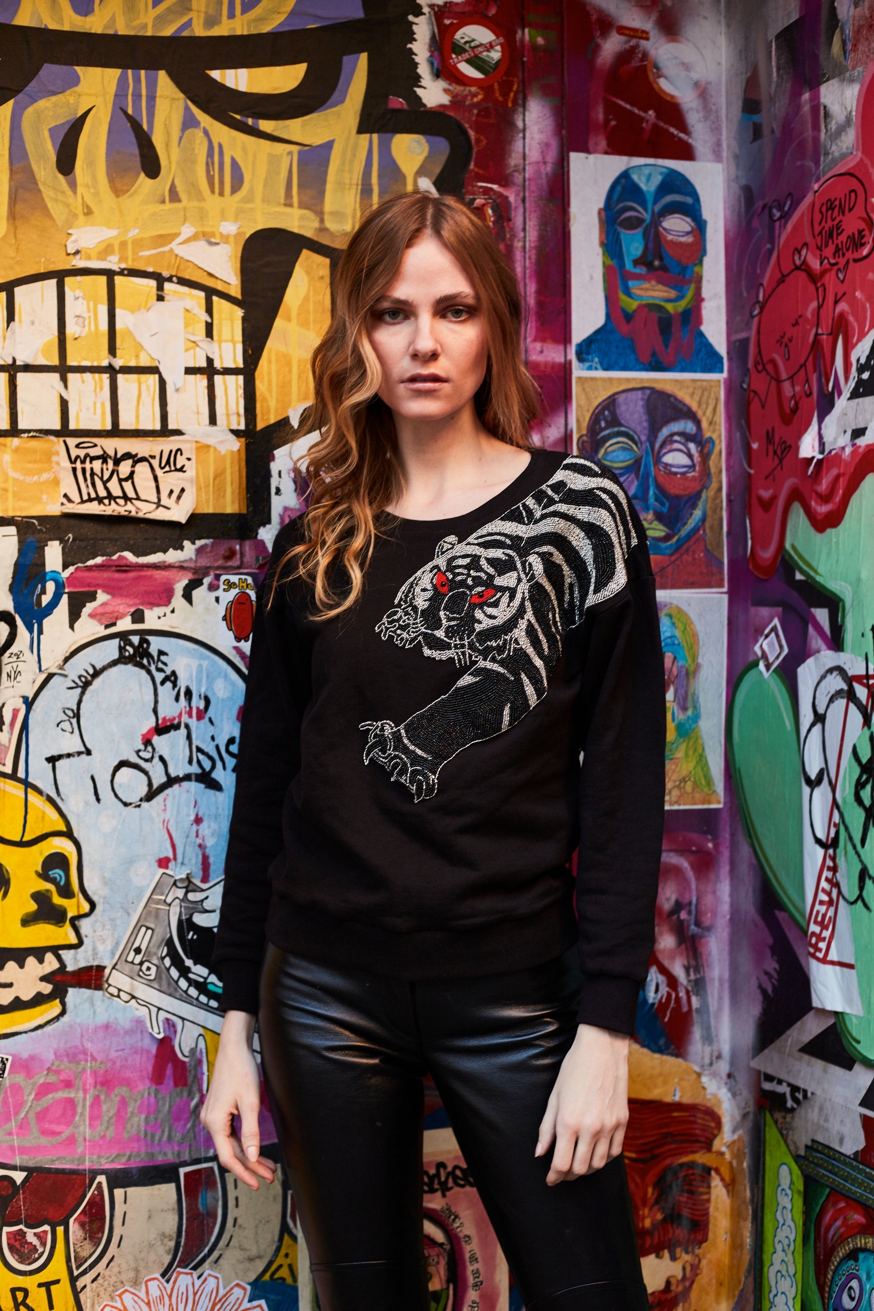 Any Old Iron has brought you yet another sweatshirt that you will want to sink your claws into, The Any Old Iron Tiger Sweatshirt! This all-black sweatshirt features an eye-catching, hand-beaded tiger that can be seen sun-bathing along the shoulder. This wild feline stretches from the bust to the mid-back in all its glory. The beads used to bring the tiger to life consists of different shades, with silver and black being predominantly used for the body and red for the eyes. This sweatshirt is made with cotton; therefore, it has some stretch to it. It is the perfect top for any event, from running errands to visiting your local zoo. It can be dressed down as easily as it can be dressed up. Pair this beauty with some leather trousers and booties for a casual evening out with the girls; or, style this sweatshirt with a maxi skirt and some heels for a more elevated affair. No matter how you style this bad boy, you will be sure to be the cat's meow!