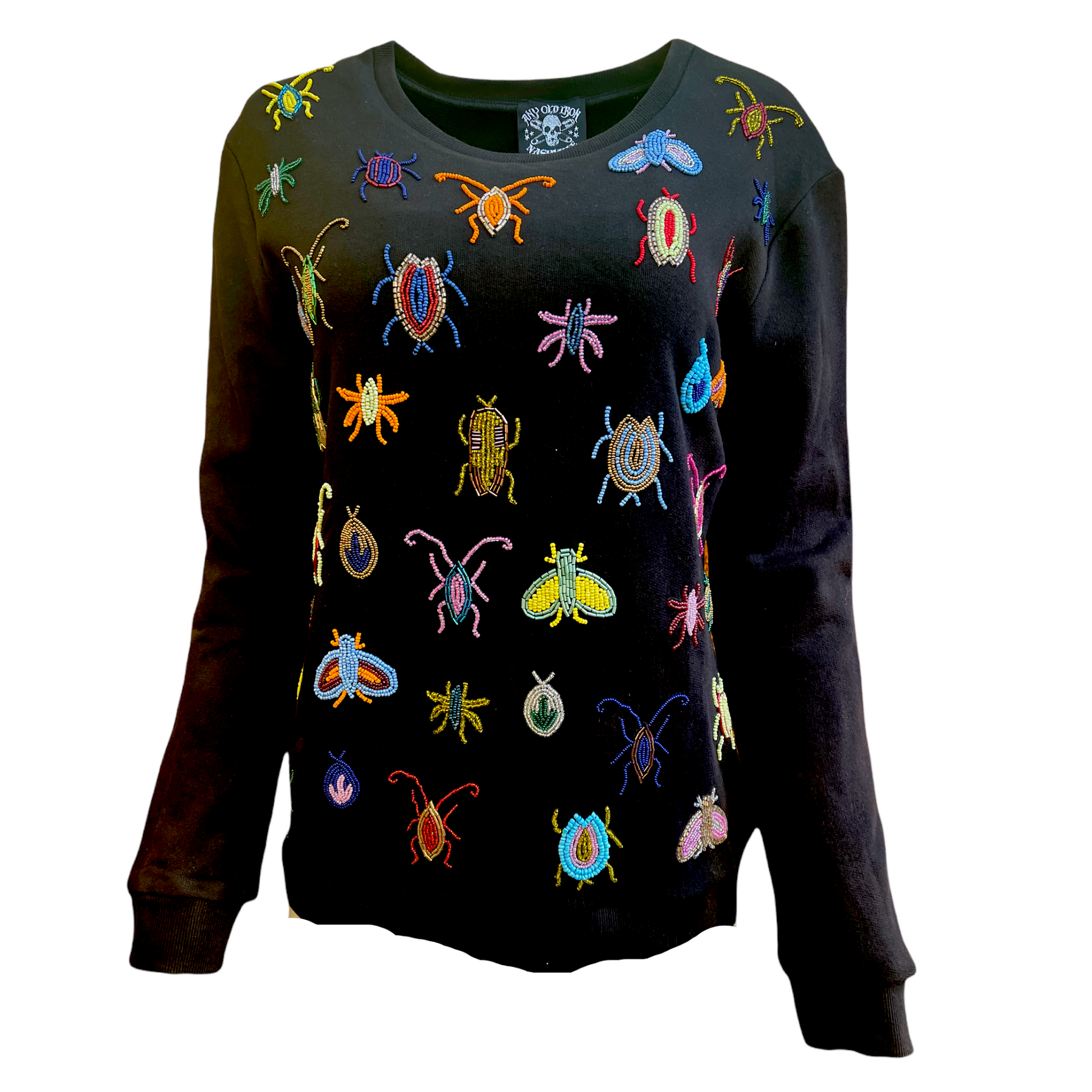 Need to spruce up your wardrobe? Any Old Iron has found the ant-ser to your prayers: the Any Old Iron Beautiful Creatures Sweatshirt! Loved for its painstaking attention to detail, this hand-beaded sweatshirt features a unique array of vibrant insects embroidered into a plain, black sweater for a striking contrast. The bugs are made out of a variety of beads, from metallic to matte, which brings them to life. It is the perfect sweatshirt for those cooler days and even cooler nights. Rock this unique piece with jeans or leather! No matter how you wear it, you will drive everyone hoppin' mad with your badass style!