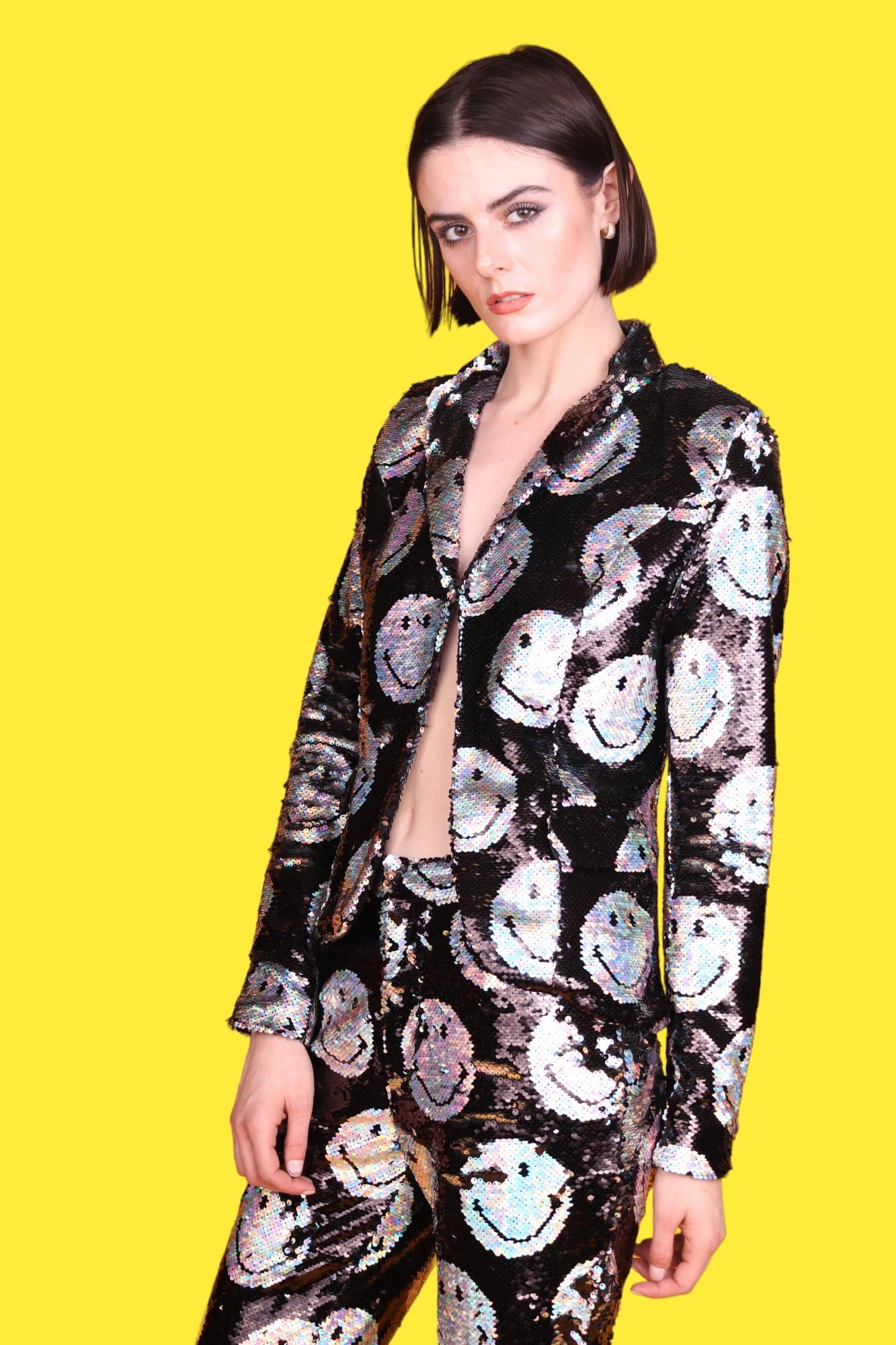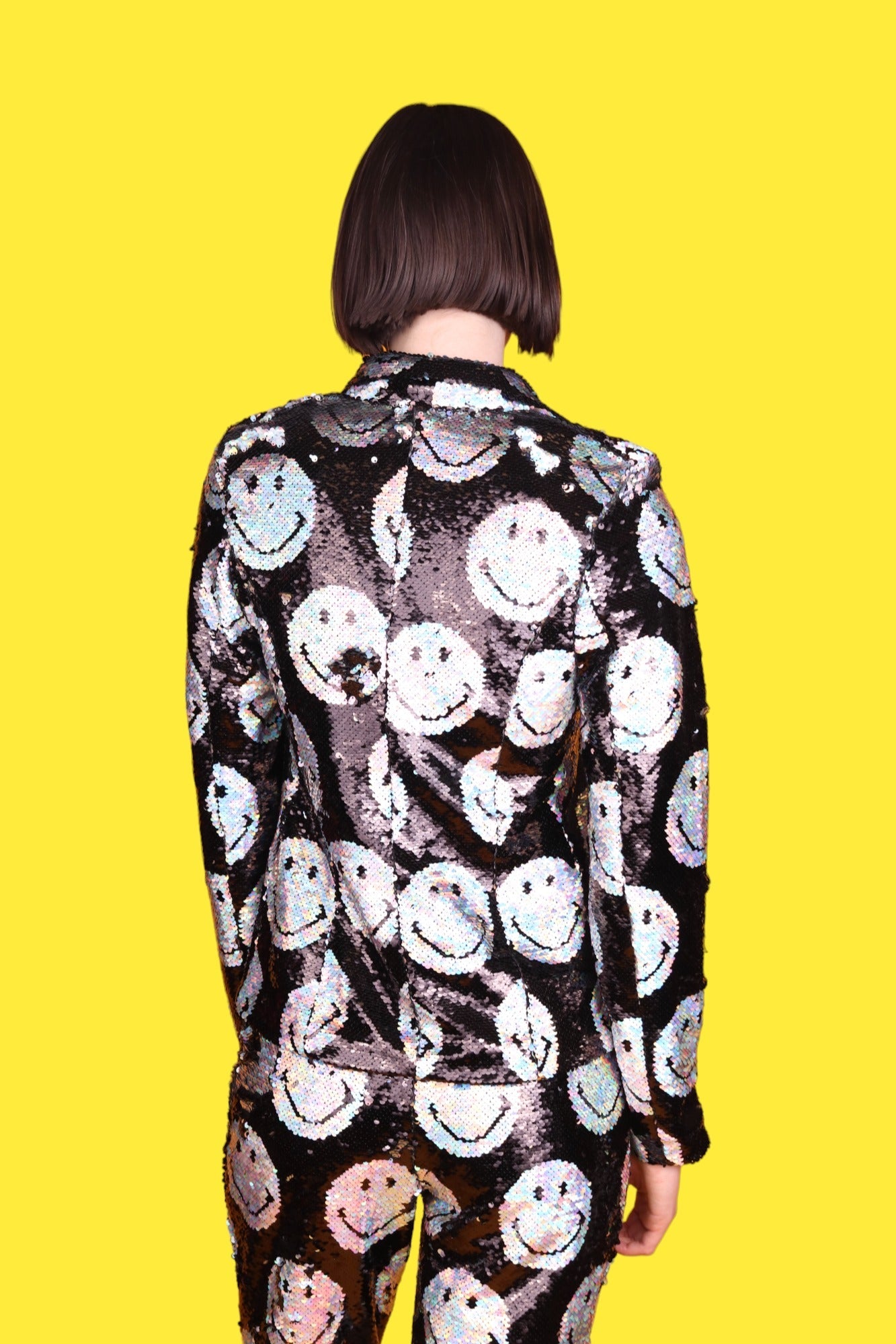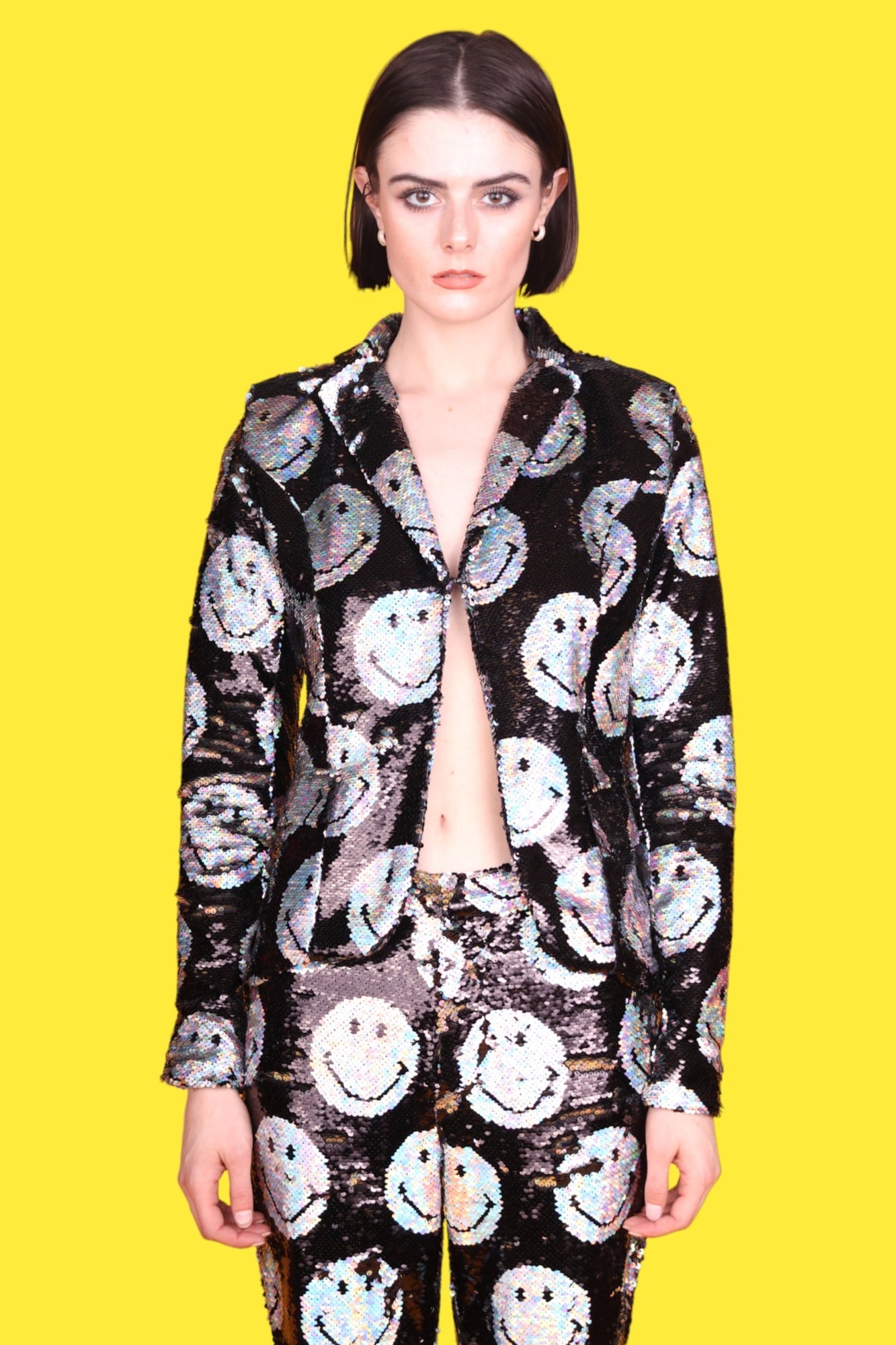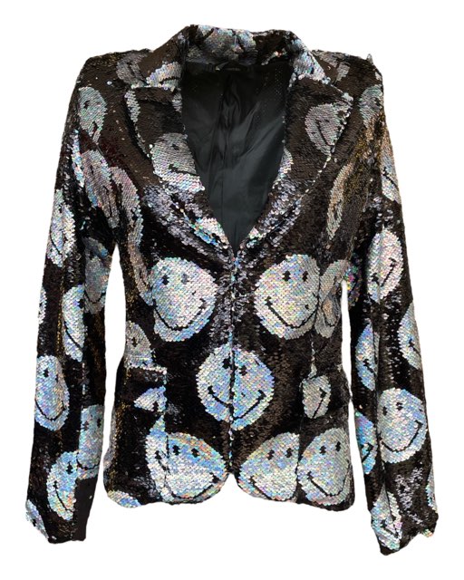 Sequins are the smiles of fashion; so, if you combine the two, you will end up with nothing short of magic, like AOI and Smiley discovered when they produced the new Any Old Iron x Smiley Iridescent Blazer Jacket. This iridescent silver and jet black jacket is adorned with a reversible sequin, smiley pattern from the front to the back, which flips the actual smiley faces from a holographic silver to a jet black. This sophisticated jacket not only has a charming motif, that would be sure to brighten anyone's day, it, also, has all the desirable jacket features you could hope for. For instance, on the exterior waistline of the jacket, two pockets can be found to stow away any essentials you may need throughout the day and evening. If that is not enough storage, no need to fret! Just check out the interior of the jacket for a third pocket. In addition to the pocket, the interior of the jacket has another feature that will have you smiling ear to ear. As soon as you flip open that jacket, you will be met with a silky smooth fabric, that will instantly remind you of your favorite satin sheets. Not to mention, the interior lining aid in ventilation so that you will surely be comfortable in any climate. Needless to say, this jacket has it all-from fashion to function-and would leave any wearer with a wide-eyed grin!