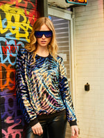 Nothing will have you going wild like the Any Old Iron Zebra Sweatshirt! This full sequin sweatshirt is decked out with an iridescent zebra print, from the front to the back. Shades of cool blues, hot pinks, rich purples, and warm golds can be seen as the light dances to and fro amongst the sequins. The design truly makes it a unique piece, unlike anything in your casual wardrobe. Not to mention, this ostentatious, flashy design comes with a satin interior lining for optimal luxury and a relax fit for all the comfort you could possibly want and need. This sweatshirt is the perfect top for a visit to your city's zoo, a great choice when running errands, and even top notch gift for your favorite Queen of the Jungle.