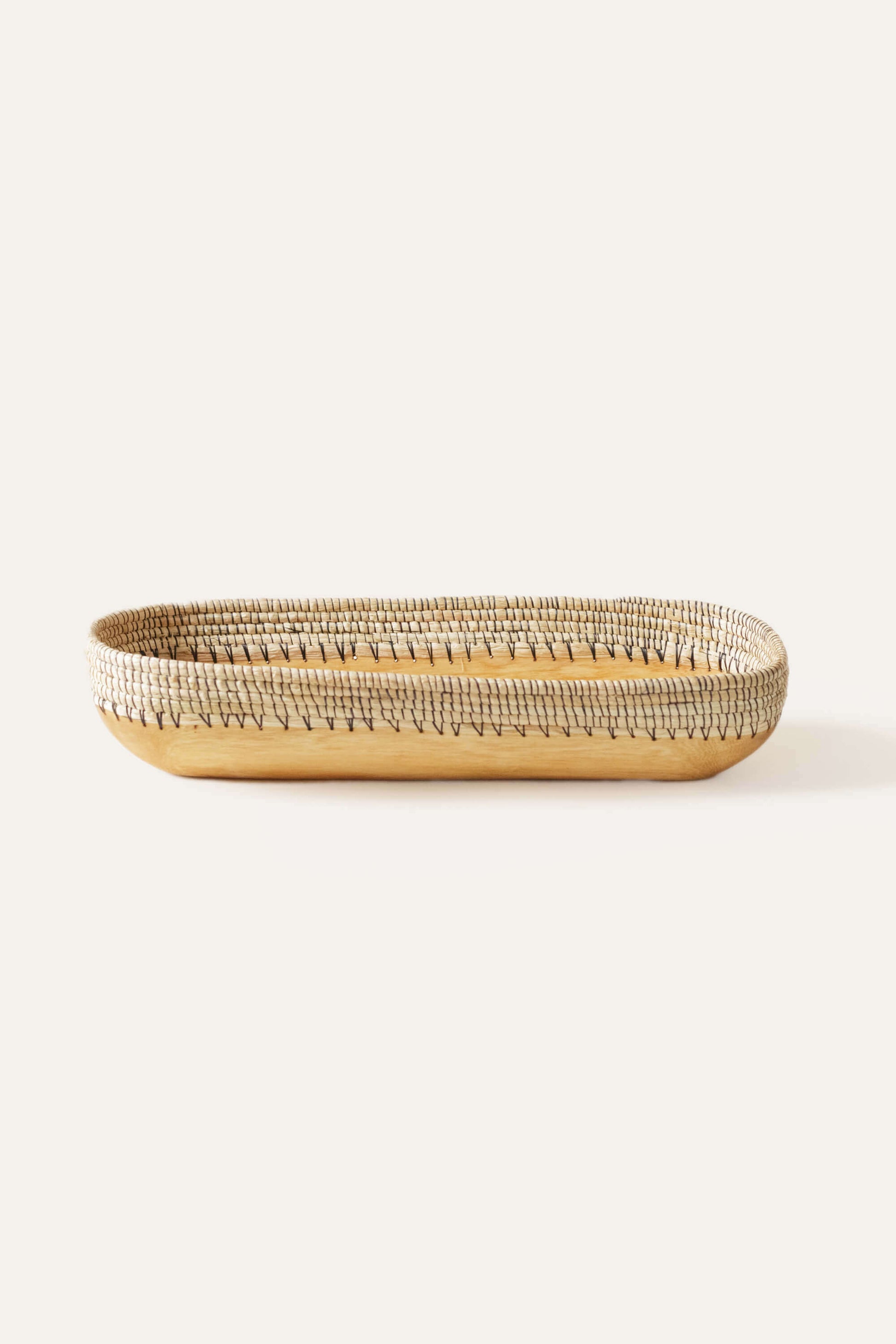 The Copabu Wood + Raffia Rectangle Tray makes a perfect centerpiece to a dining table or kitchen tabletop.