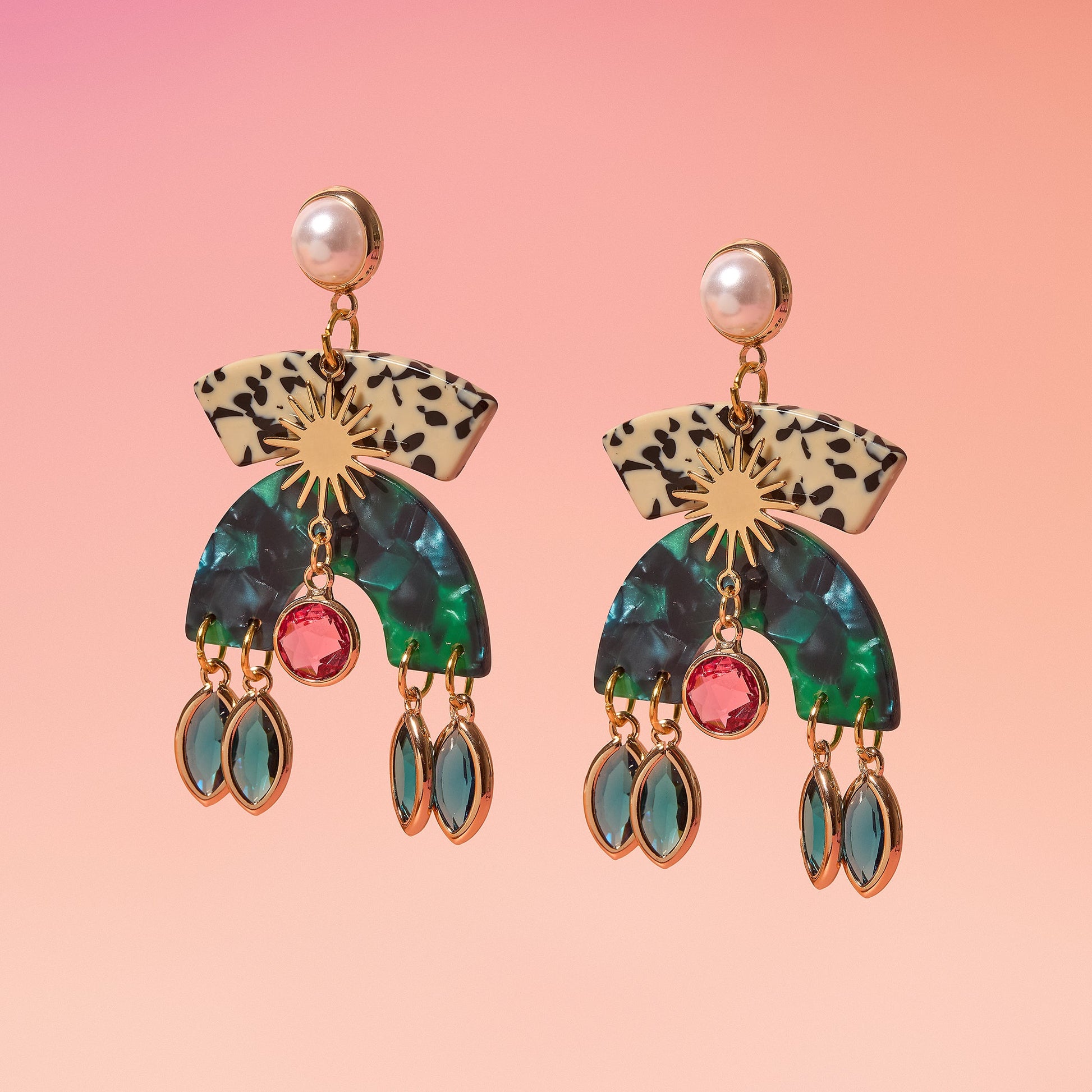 A colorful and joyful celebration of texture and light. The Franci Earrings feature a striking multi-tier design, pairing a deep navy marbled post with a classic leopard arc and a central, high-shine gold sunburst. Finished with a cluster of vibrant glass charms and a faux pearl accent, these earrings stand as a true statement piece designed to elevate any ensemble with an artisan flair.