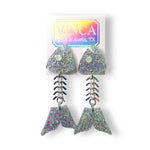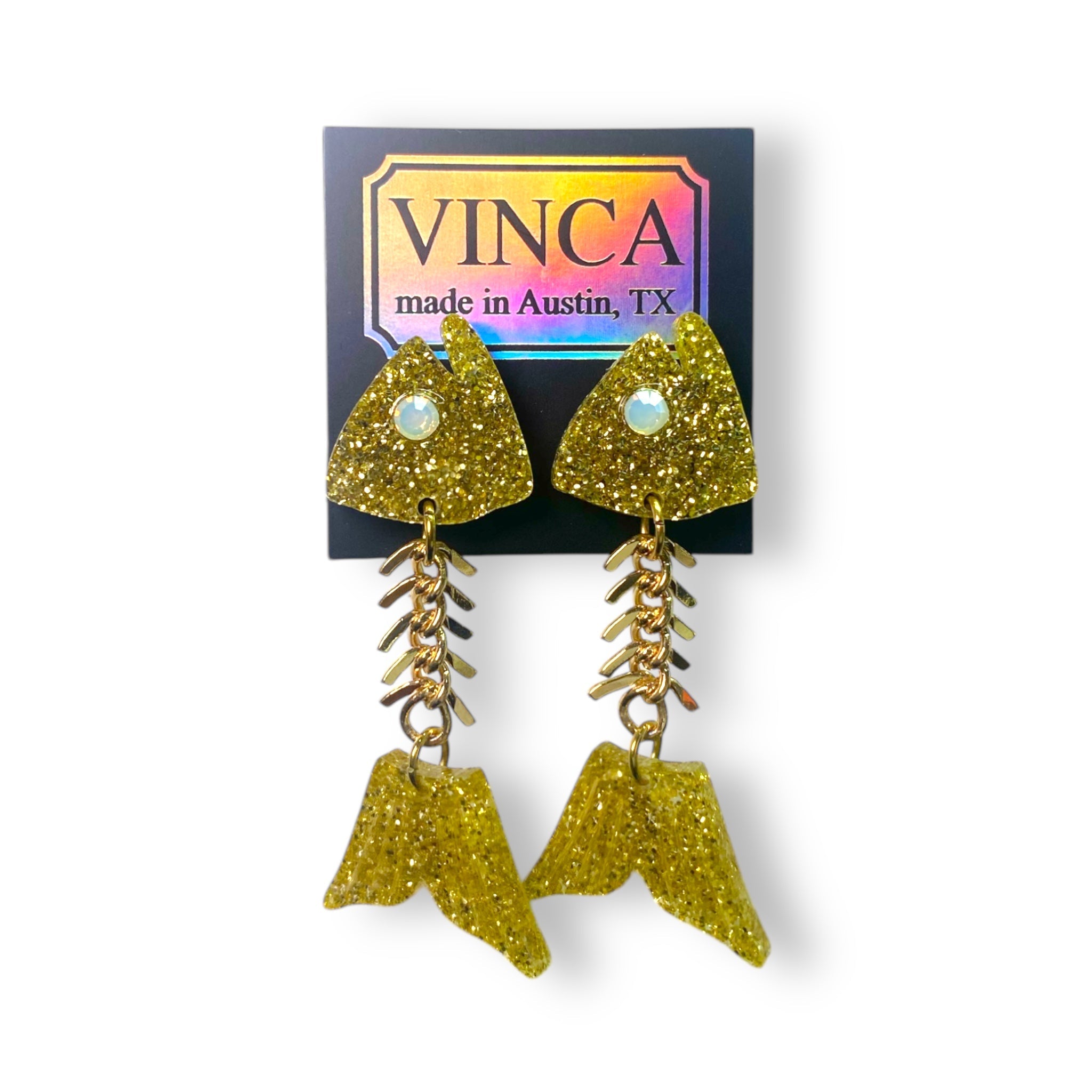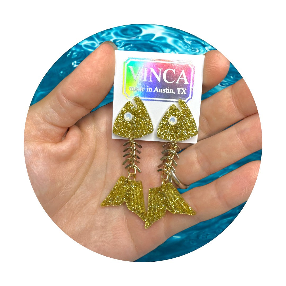 Elevate your style with our Fish Bone Earrings! These handmade earrings from Austin, Texas feature a unique bone-like chain and shimmery frosted crystals that resemble a fish eye. Measuring at 2" long, they are lightweight and hypoallergenic.