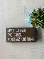 This handmade wood sign is the perfect reminder of Ron Swanson's sage advice: "never half-ass two things - whole-ass one thing!" Display it and never forget to give your best.