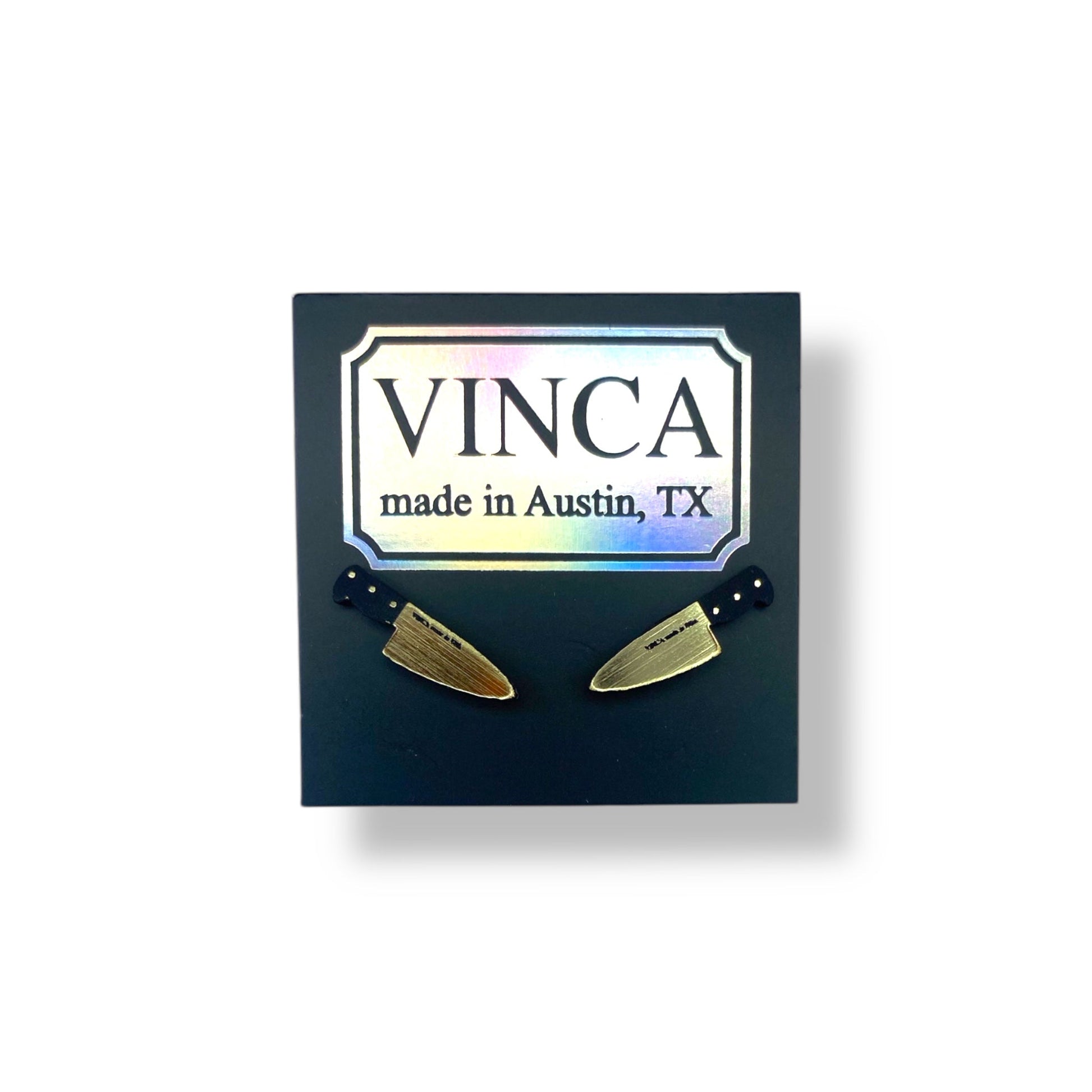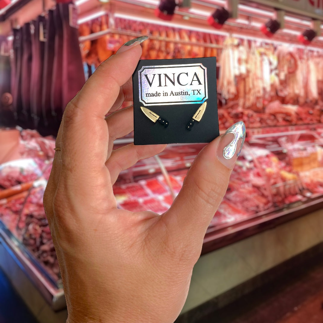 Want an edgy look that's still conservative enough to wear to the office? Try our .5" GOLD tone Teeny Tiny Chef's Knife Stud earrings on for size. These are our smallest Chef's Knife Earrings and they are mild enough to not frighten children.