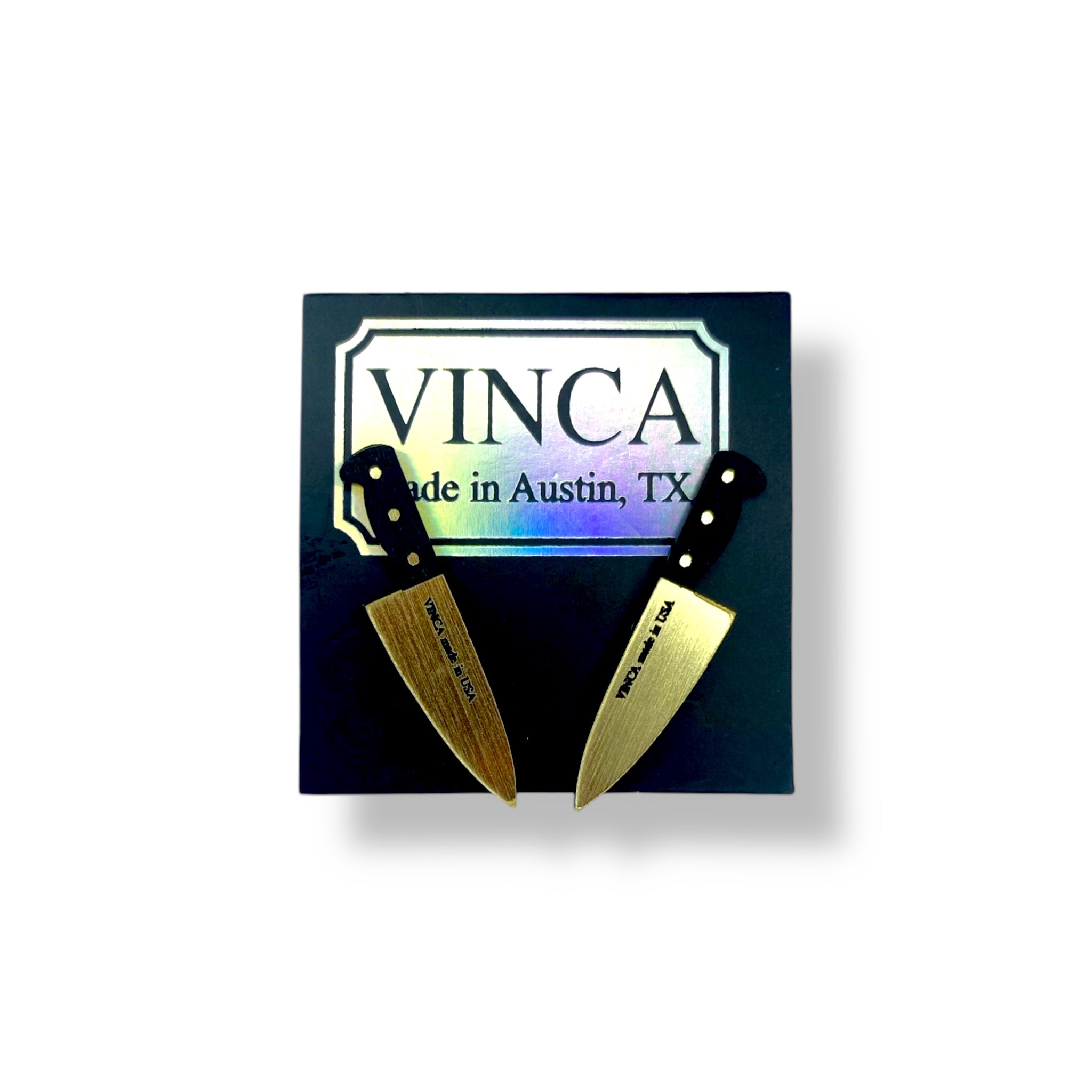 Our Tiny Chef's Knife earrings are cut from two-layer gold tone-black acrylic (plastic) attached to a surgical steel post.