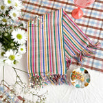 The Valentina multicolored striped towel will be a lively addition of color and texture to your kitchen or bathroom. A rainbow of light pink, ochre, emerald, lilac, royal blue, umber and fuchsia are woven together to create this brilliantly colorful piece. Ethically handwoven by artisans in Xela, Guatemala.