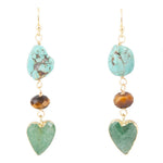 Indulge in the beauty of these handcrafted golden earrings, featuring a trio of stunning stones - a blue magnesite, tiger's eye, and a heart-shaped green agate. These earrings measure 2" long, its widest point is .5", a total weight of 6.8g, are crafted with care and finished to perfection. Elevate your style with these perfectly balanced and uniquely designed earrings.