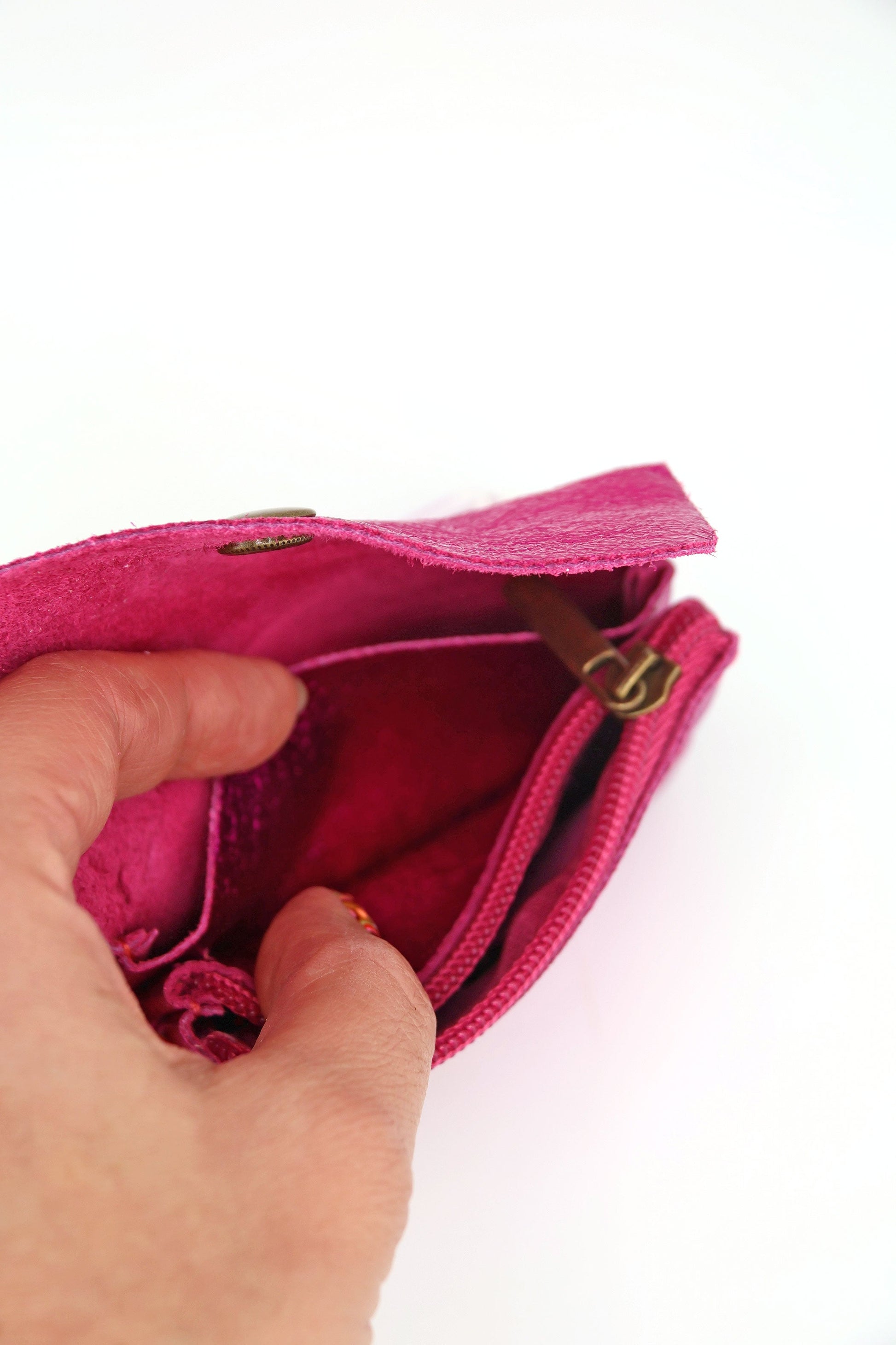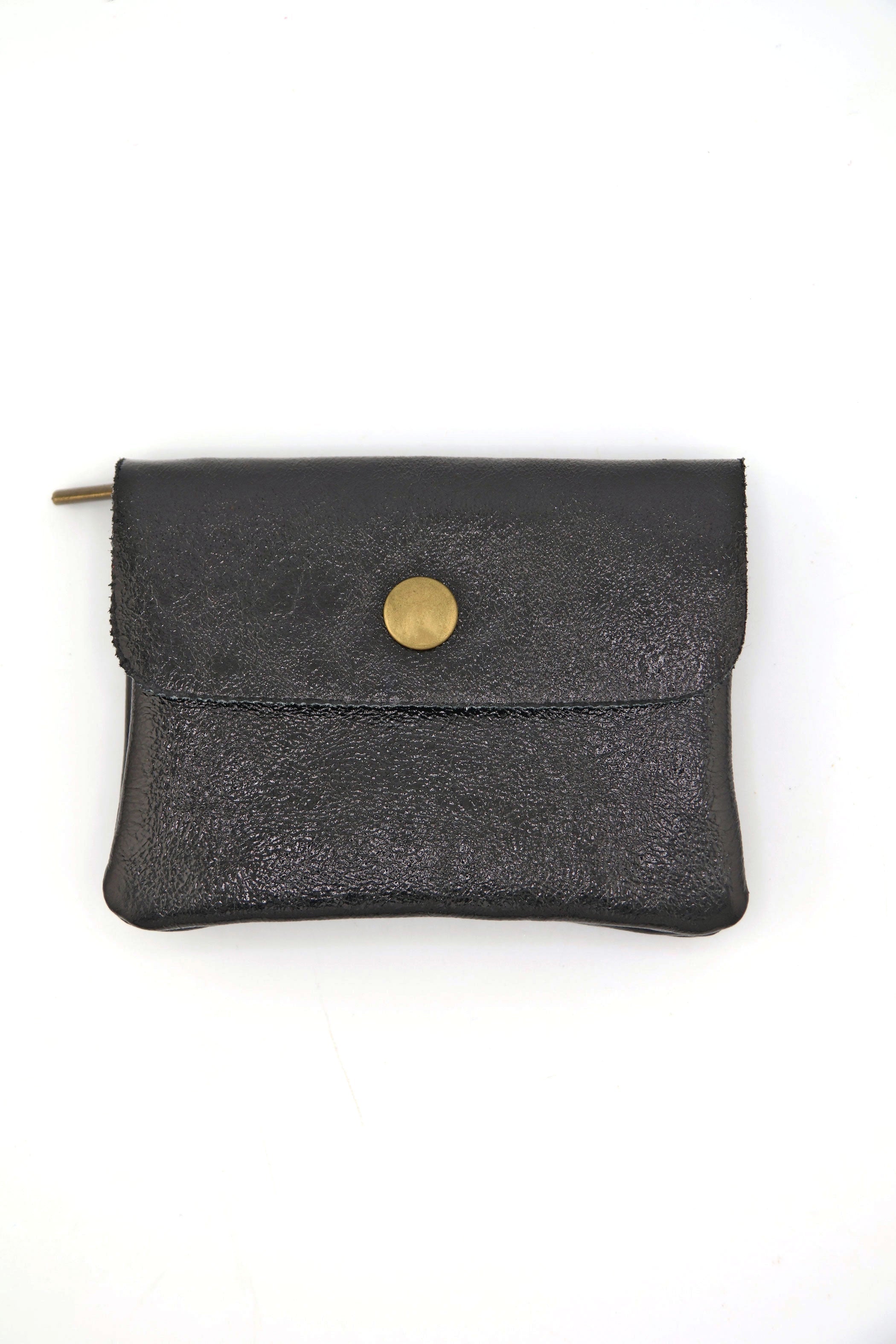 The perfect size for cards, cash, coins, and accessories, they have 3 interior pockets. One is a zipper pocket, one is a larger interior pocket, and there's a small sectional pocket between the two. Brass snap closure.