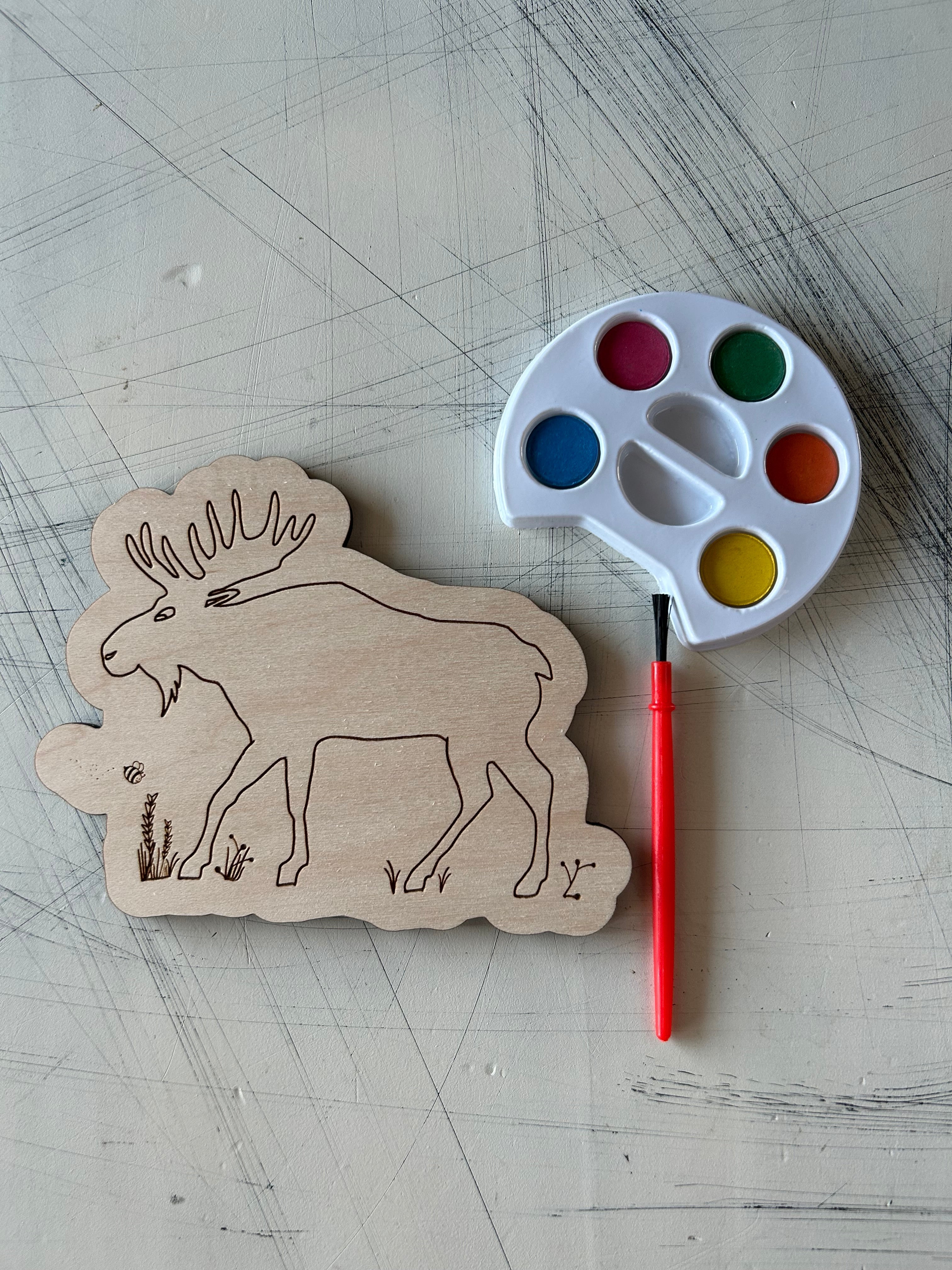 Get crafty with our Moose Watercolor Craft Kit! Hand-drawn illustration with a moose walking near wildflowers and our signature smiling bee flying nearby.