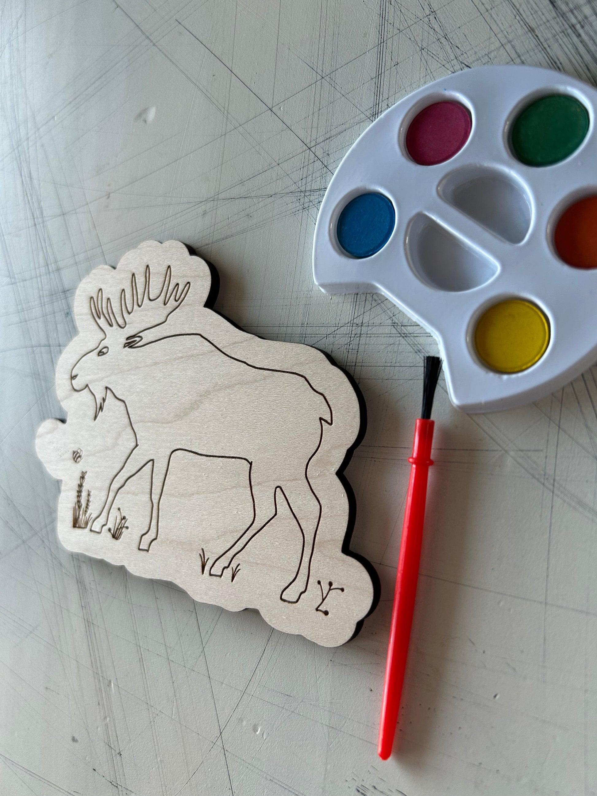 Includes watercolor palette with red, orange, blue, green, and yellow, as well as a brush. Wood canvas, palette, and brush come wrapped in shrink plastic.