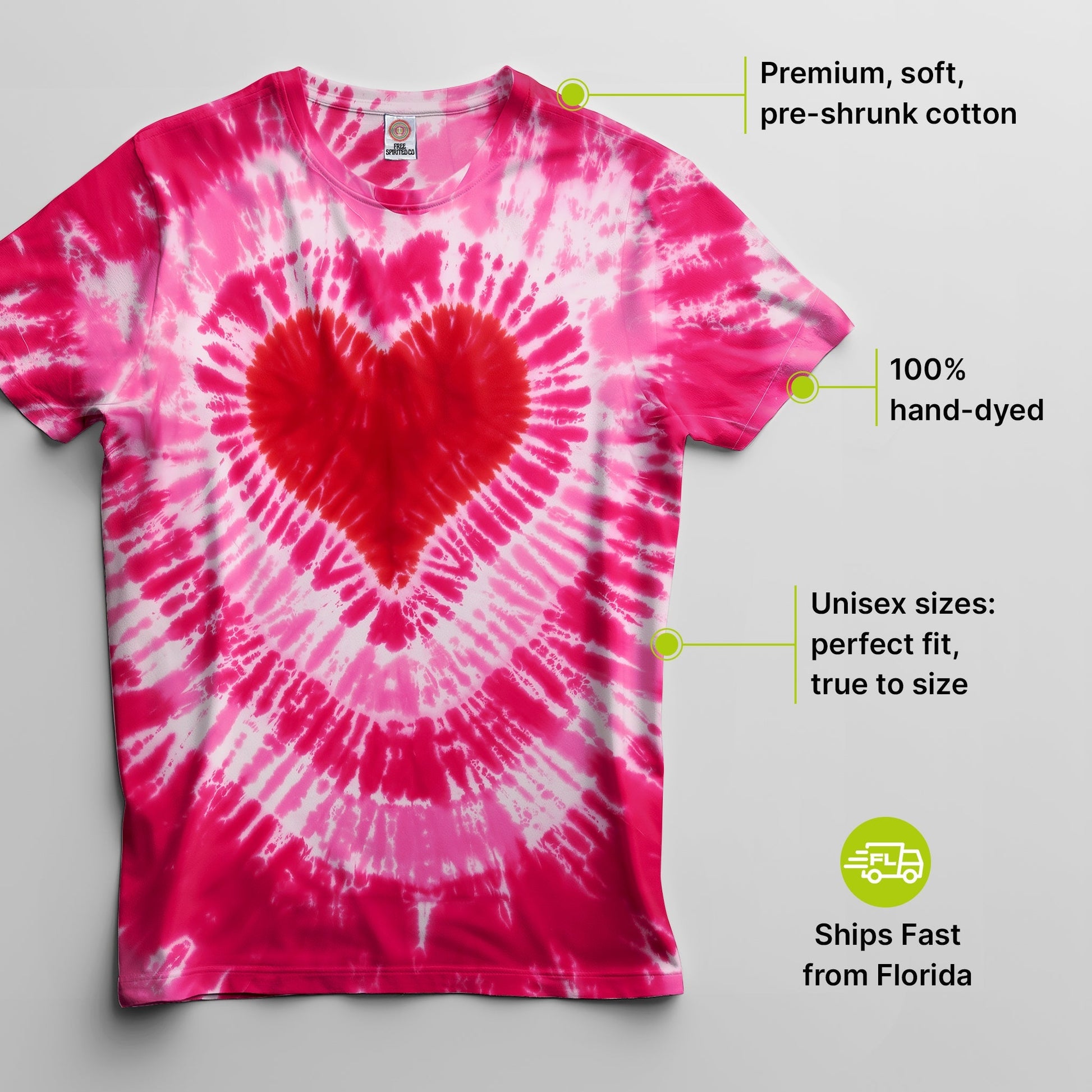 Wear your heart with the Pink Heart Premium Hand-Dyed Comfort Shirt. This tie-dye shirt features a lovely pink heart design. Shop now and spread love!