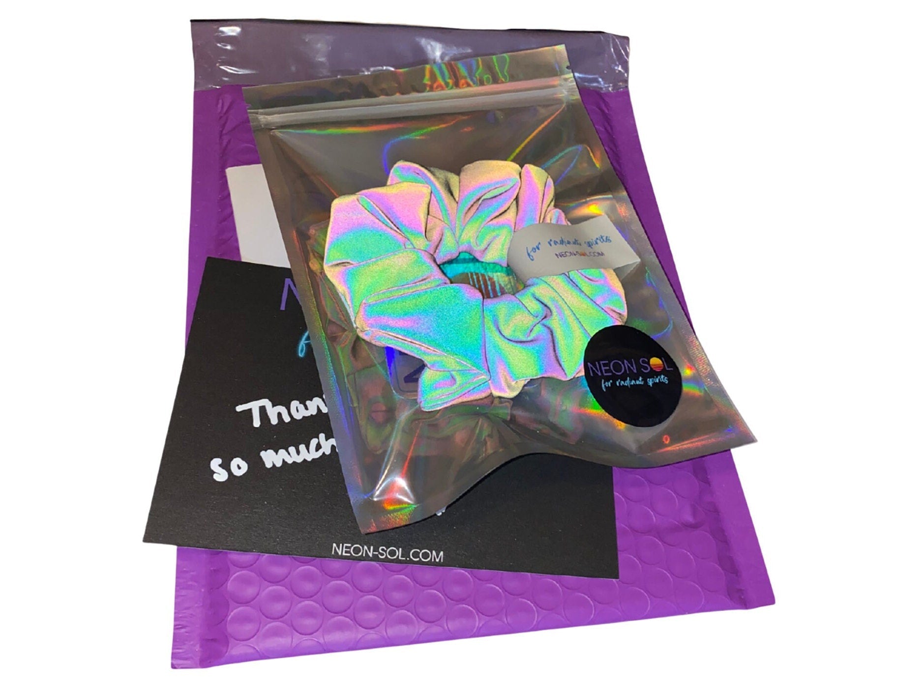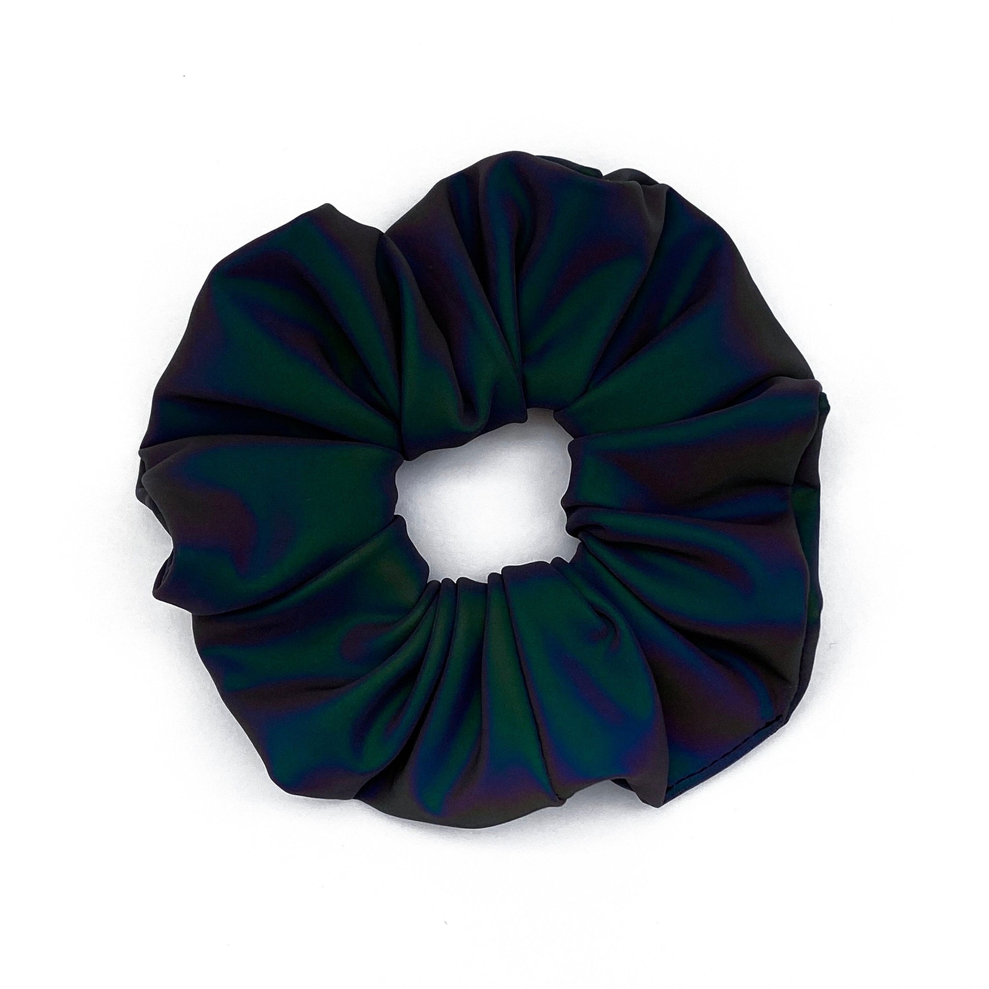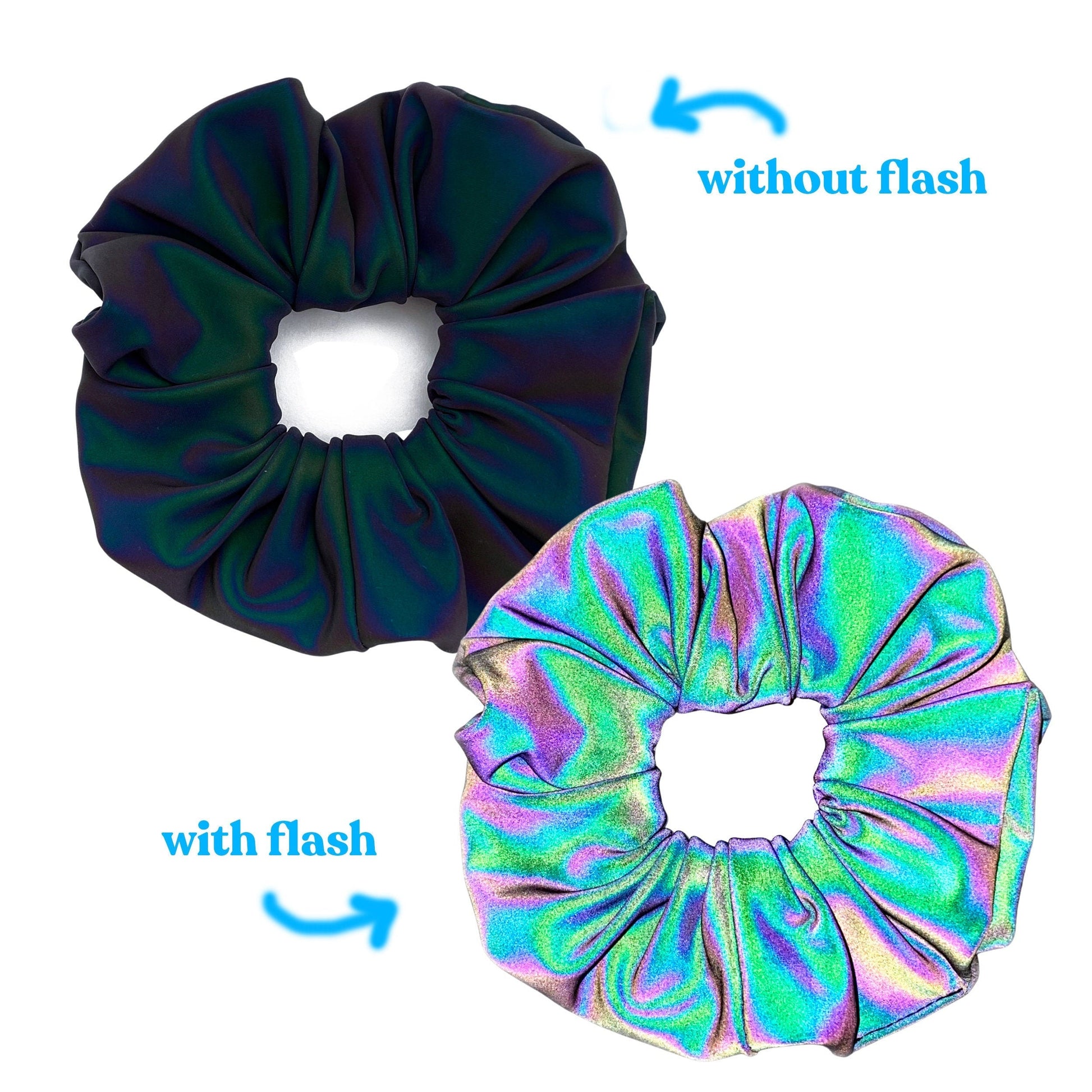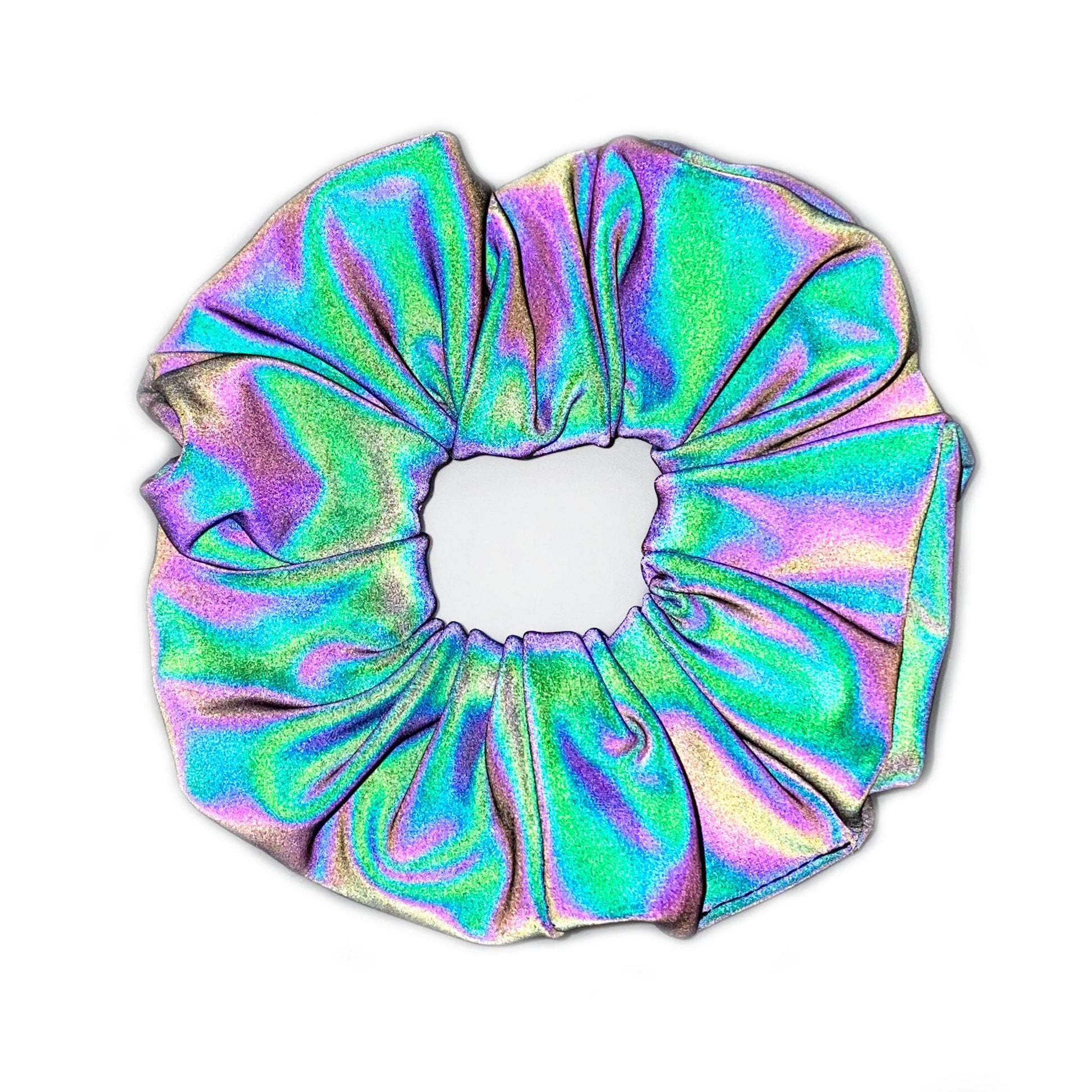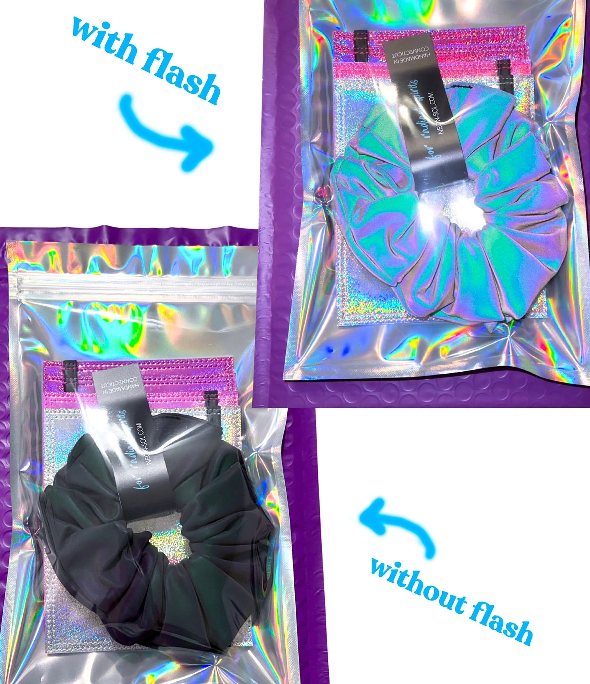 These scrunchies are a standout fashion accessory! When light hits this special fabric, iridescent rainbows are reflected back!