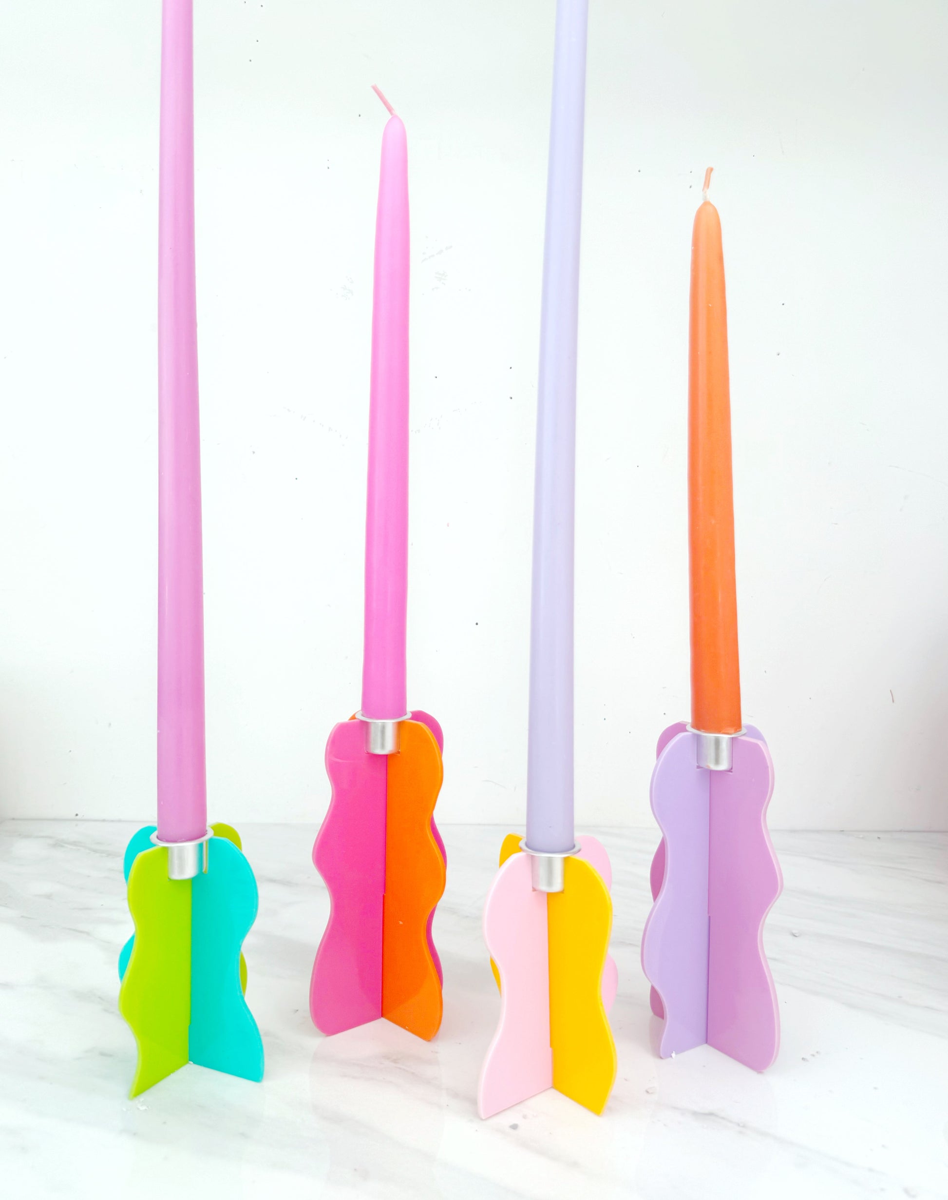 Our color blocked wavy squiggle acrylic taper candle holders are the cutest dopamine decor for your home. Featuring a trendy wavy pattern with 4 different color options and two height options. Choose from 6” tall or 4” tall sizes. These come flat packed and are easy to assemble. Just slide the base pieces together and slip in the metal candle cup. To clean, simply freeze the acrylic pieces and the wax will pop right off. Listing is for one candle holder in the size of your choice.