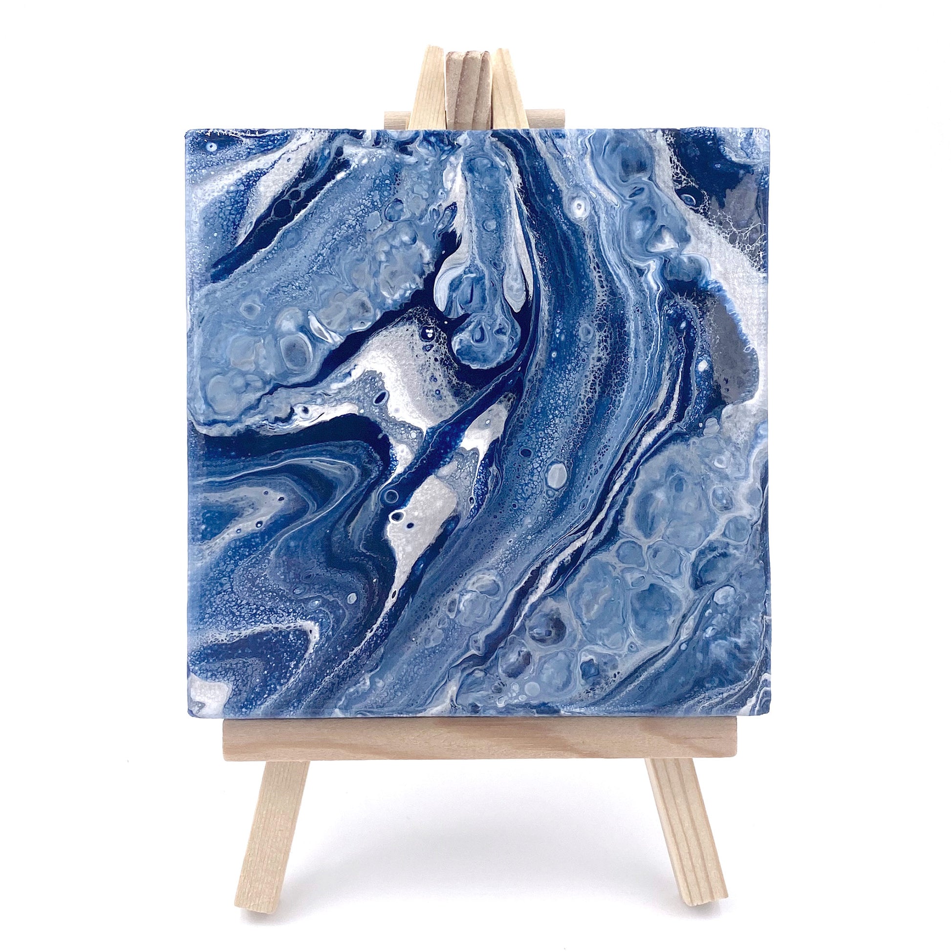 Featuring swirling navy, gray, white, and metallic silver colors on a 4-inch square canvas, each miniature is sealed with archival-quality, UV protectant clear varnish and comes with a wood display easel.