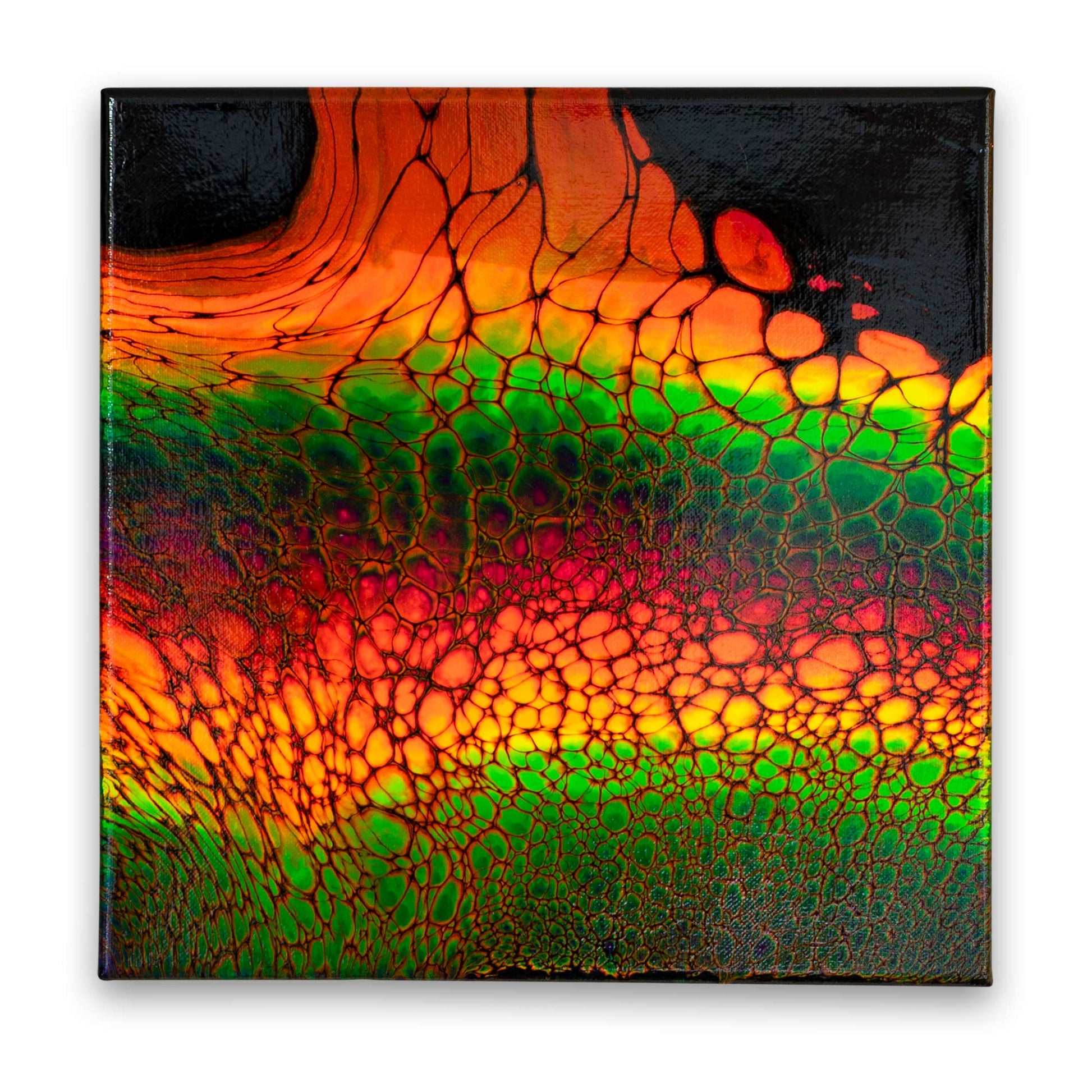 A Bespattered Facade original on a 12-inch square canvas, sealed with archival-quality, UV-protectant clear varnish and finished with dust protector and hanging hardware.