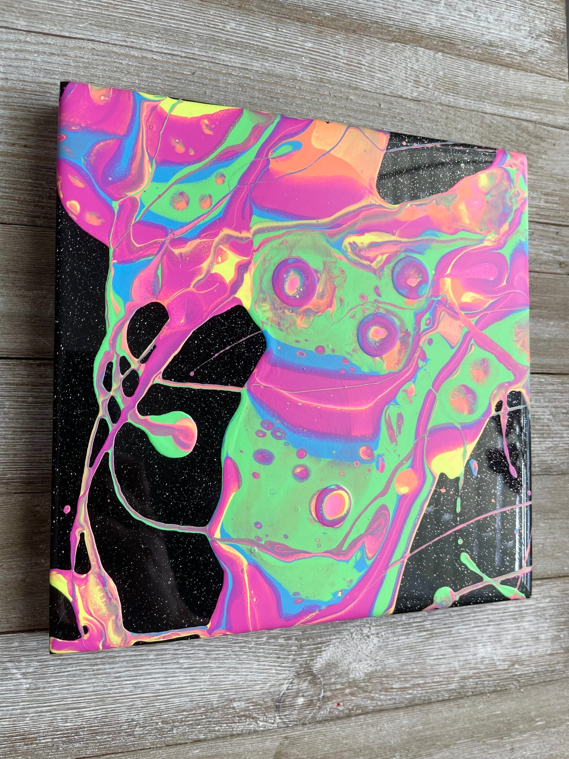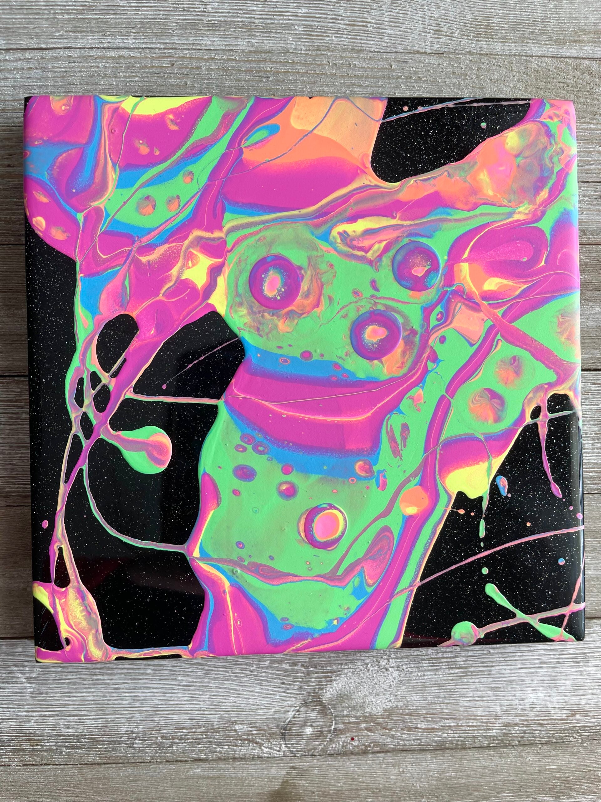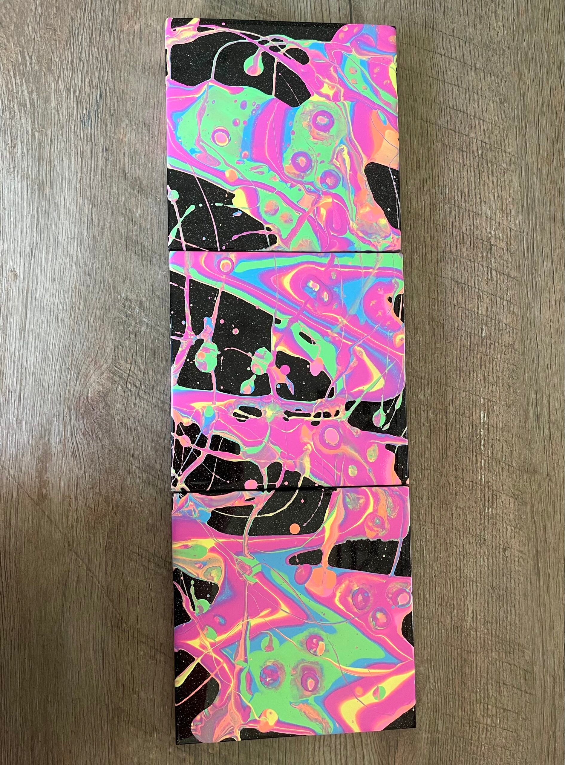 A Bespattered Facade triptych original, consisting of three (3) 8-inch square glittery resin-covered wood panels, sealed with archival-quality, UV-protectant clear varnish and finished with dust protector and hanging hardware.